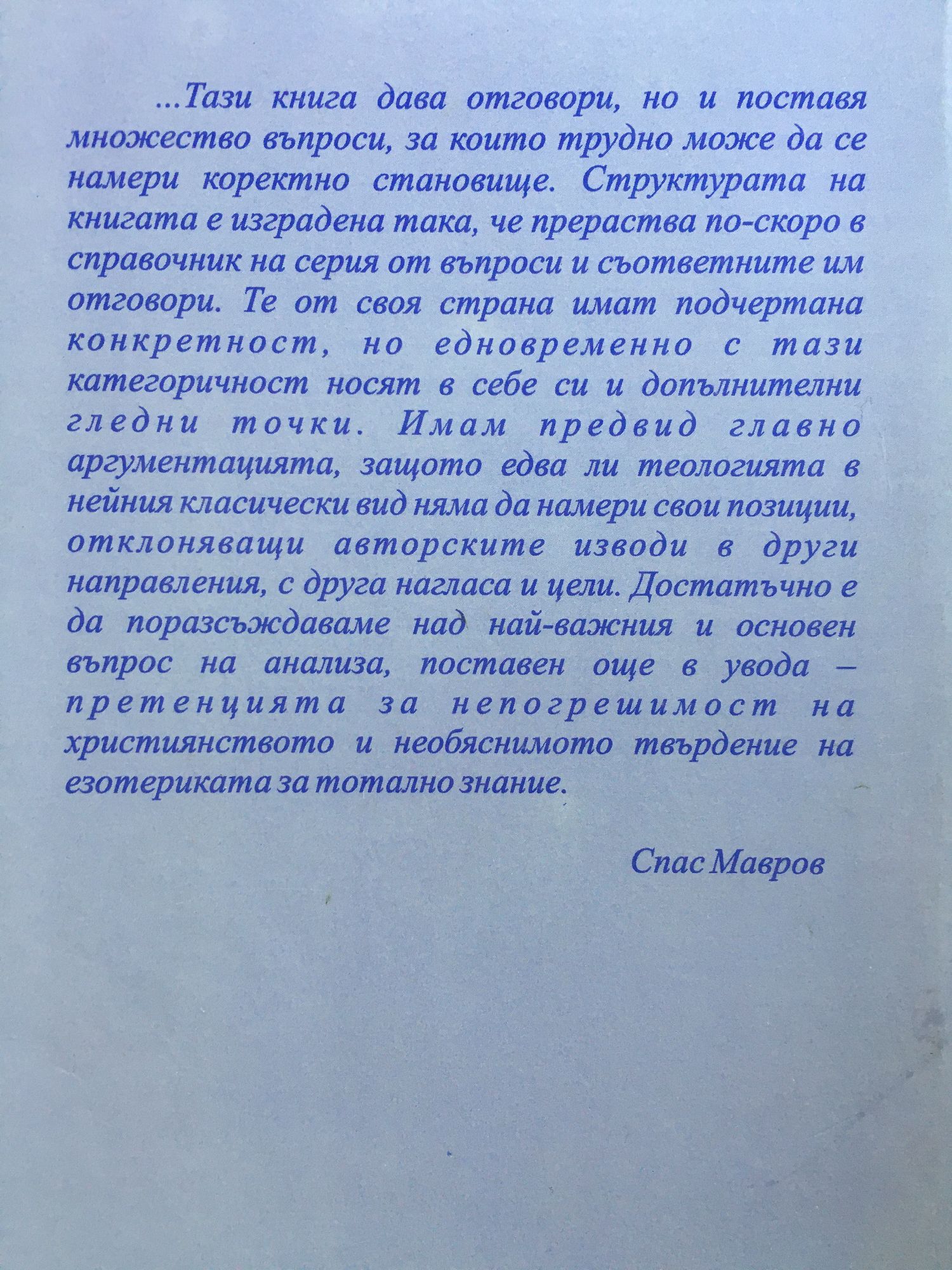 ...Тази книга дава отговори, но и поставя множество въпроси, за които трудно може да се намери коректно становище. Структурата на книгата е изградена така, че прераства по-скоро в справочник на серия от въпроси и съответните им отговори. Те от своя страна имат подчертана конкретност, но едновременно с тази категоричност носят в себе си и допълнителни гледни точки. Имам предвид главно аргументацията, защото едва ли теологията в нейния класически вид няма да намери свои позиции, отклоняващи авторските изводи в други направления, с друга нагласа и цели. Достатъчно е да поразсъждаваме над най-важния и основен въпрос на анализа, поставен още в увода -претенцията за непогрешимост на християнството и необяснимото твърдение на езотериката за тотално знание. Спас Мавров