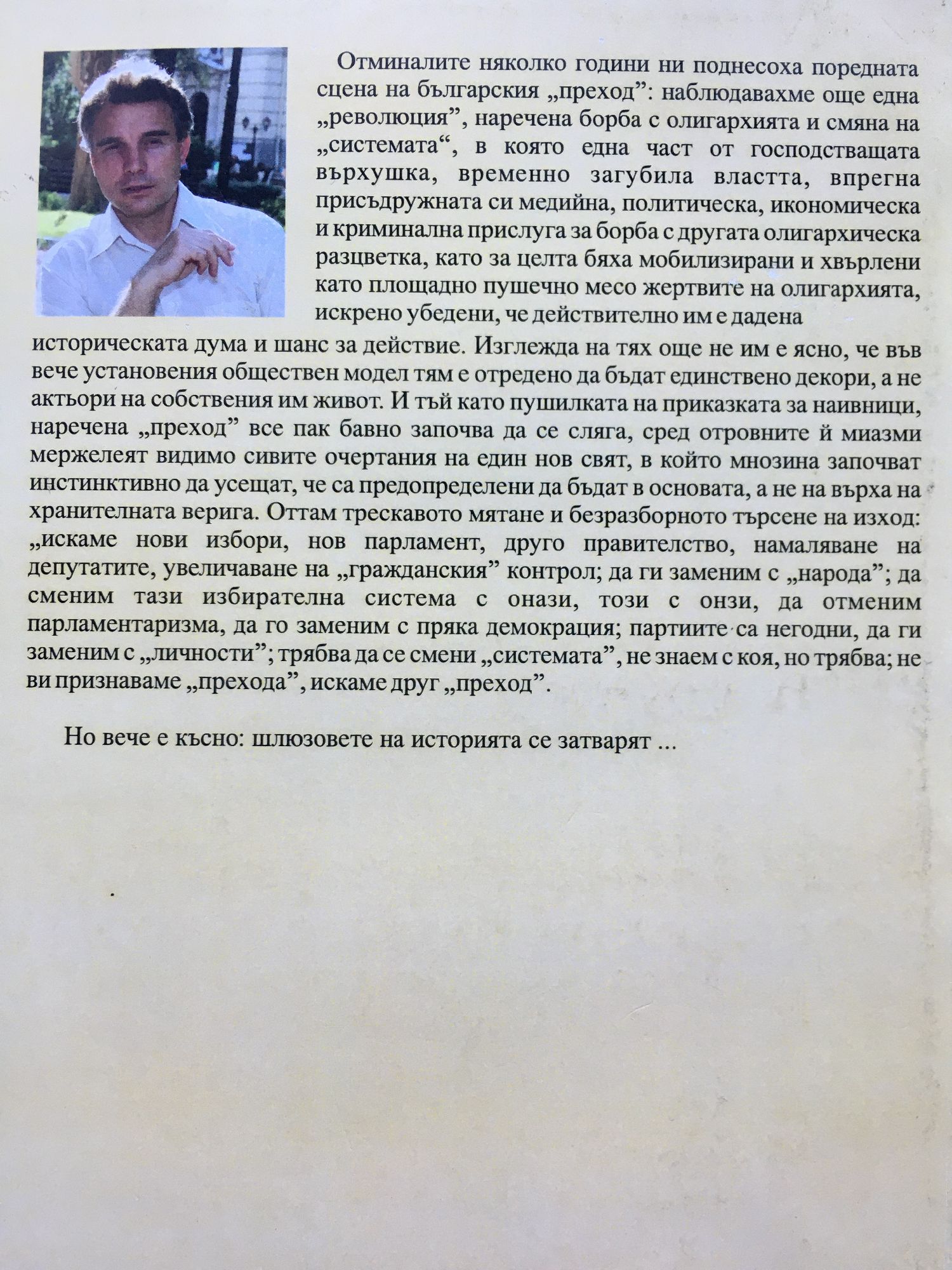 Отминалите няколко години ни поднесоха поредната сцена на българския "преход": наблюдавахме още една "революция", наречена борба с олигархията и смяна на "системата", в която една част от господстващата върхушка, временно загубила властта, впрегна присъдружната си медийна, политическа, икономическа и криминална прислуга за борба с другата олигархическа разцветка, като за целта бяха мобилизирани и хвърлени като площадно пушечно месо жертвите на олигархията, искрено убедени, че действително им е дадена историческата дума и шанс за действие. Изглежда на тях още не им е ясно, че във вече установения обществен модел тям е отредено да бъдат единствено декори, а не актьори на собствения им живот. И тъй като пушилката на приказката за наивници, наречена "преход" все пак бавно започва да се сляга, сред отровните й миазми мержелеят видимо сивите очертания на един нов свят, в който мнозина започват инстинктивно да усещат, че са предопределени да бъдат в основата, а не на върха на хранителната верига. Оттам трескавото мятане и безразборното търсене на изход "искаме нови избори, нов парламент, друго правителство, намаляване на депутатите, увеличаване на "гражданския" контрол; да ги заменим с "народа"; да сменим тази избирателна система с онази, този с онзи, да отменим парламентаризма, да го заменим с пряка демокрация; партиите са негодни, да ги заменим с "личности"; трябва да се смени "системата", не знаем с коя, но трябва; не ви признаваме "прехода", искаме друг "преход".