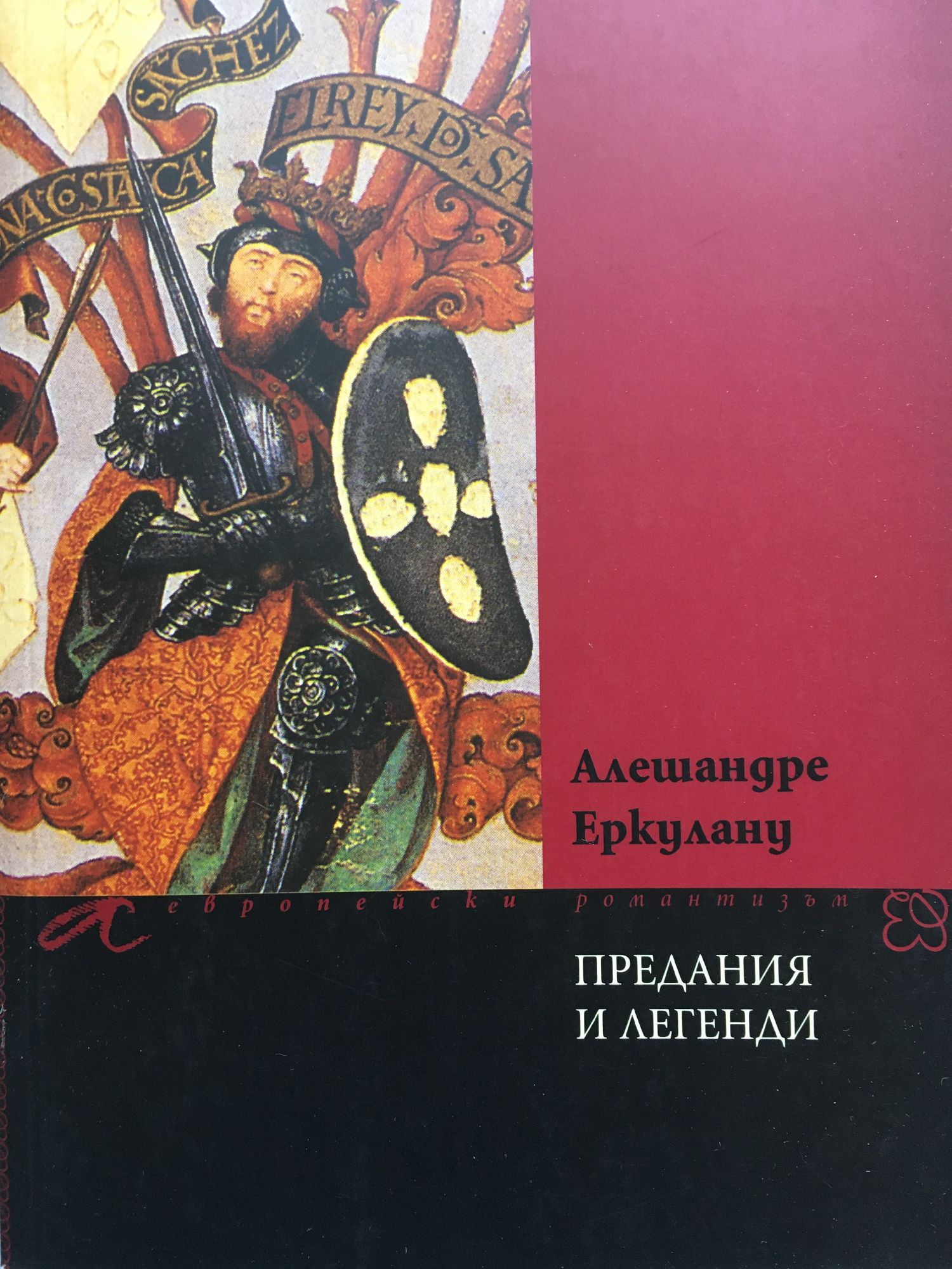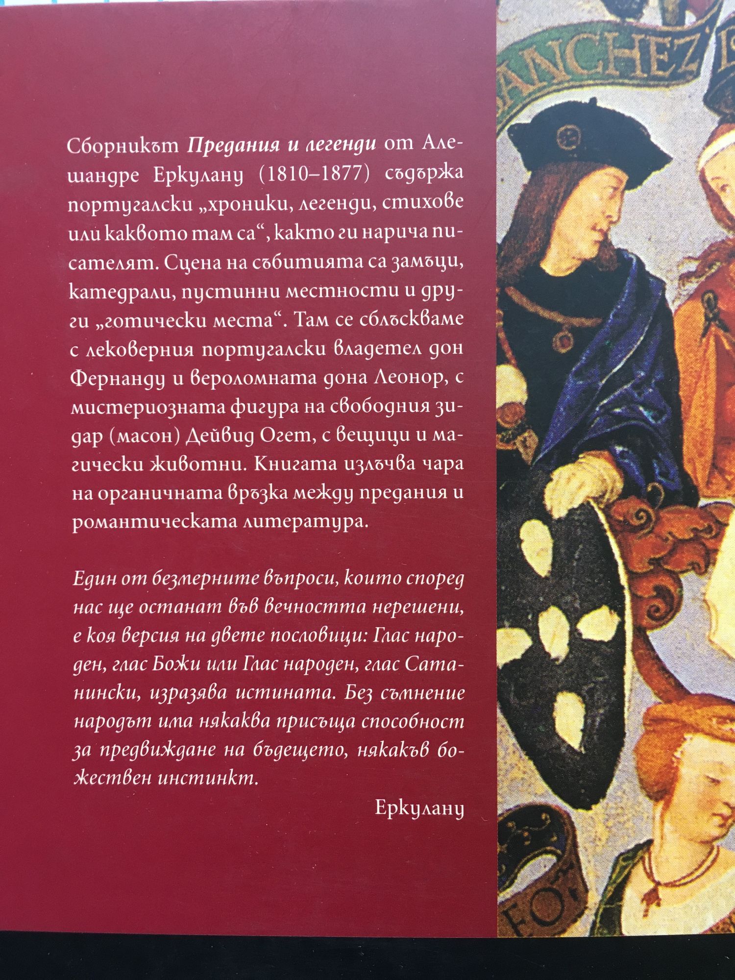 Сборникът „Предания и легенди” съдържа португалски „хроники, легенди, стихове или каквото там са,” както ги нарича самият Еркулану. Сцена на събитията са замъци, готически катедрали, пустинни местности. Там се сблъскваме с лековерния португалски владетел дон Фернанду и вероломната дона Леонор, с мистериозната фигура на свободния зидар (масон) Дейвид Огет, с вещици, магически животни и т.н. В края на книгата можем да се насладим и на една своеобразна португалска „Песен за Роланд”. „Един от безмерните въпроси, които според нас ще останат във вечността нерешени, е коя версия на двете пословици: Глас народен, глас Божи или Глас народен, глас Сатанински, изразява истината. Без съмнение народът има някаква присъща способност за предвиждане на бъдещето, някакъв божествен инстинкт. ... Минава време и гласът народен познава със страховита точност. Така и за битки, така и за хиляди други събития.” Еркулану