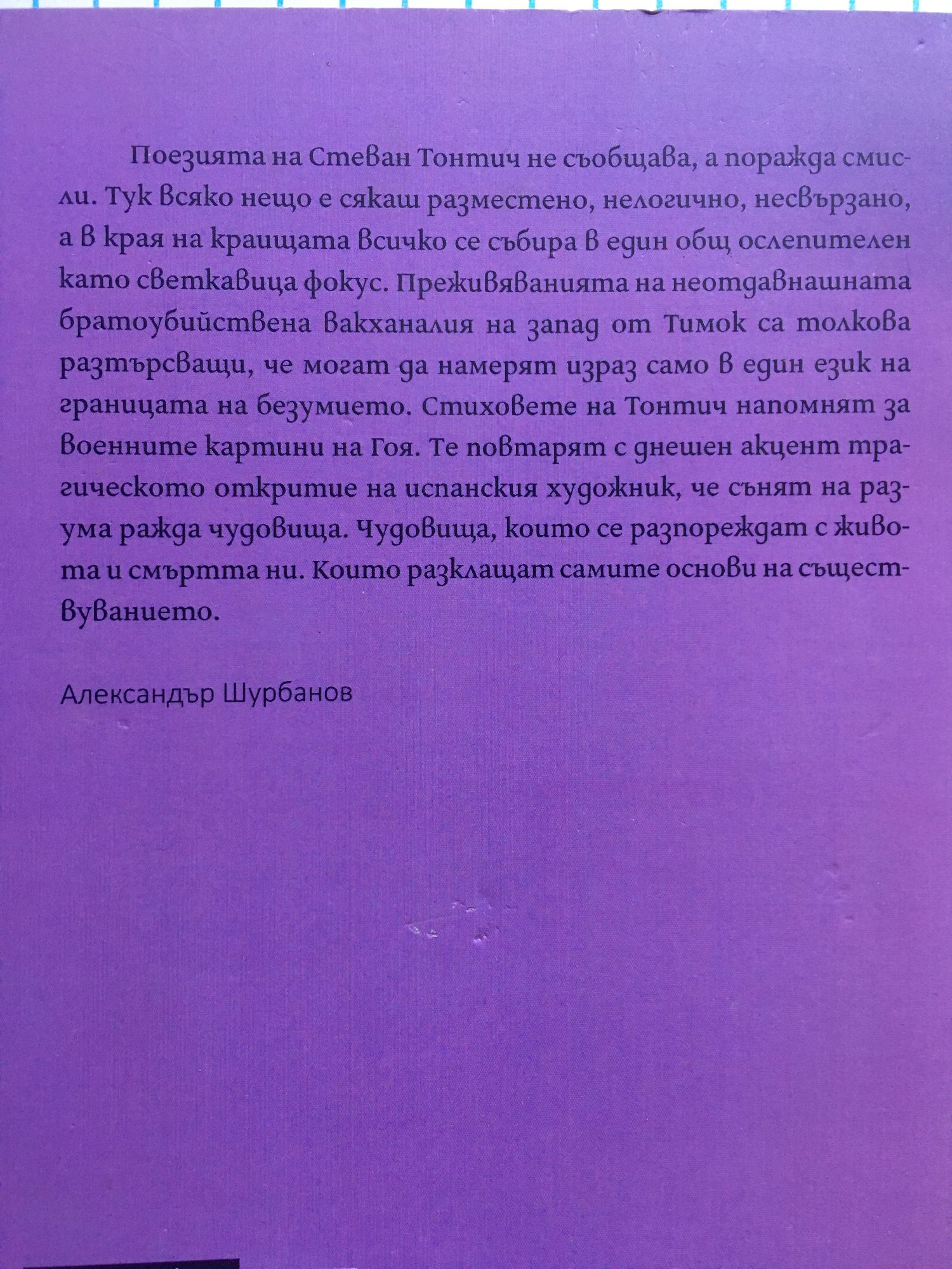 Поезията на Стеван Тонтич не съобщава, а поражда смисли. Тук всяко нещо е сякаш разместено, нелогично, несвързано, а в края на краищата всичко се събира в един общ ослепителен като светкавица фокус. Преживяванията на неотдавнашната братоубийствена вакханалия на запад от Тимок са толкова разтърсващи, че могат да намерят израз само в един език на границата на безумието. Стиховете на Тонтич напомнят за военните картини на Гоя. Те повтарят с днешен акцент трагическото откритие на испанския художник, че сънят на разума ражда чудовища. Чудовища, които се разпореждат с живота и смъртта ни. Които разклащат самите основи на съществуванието.