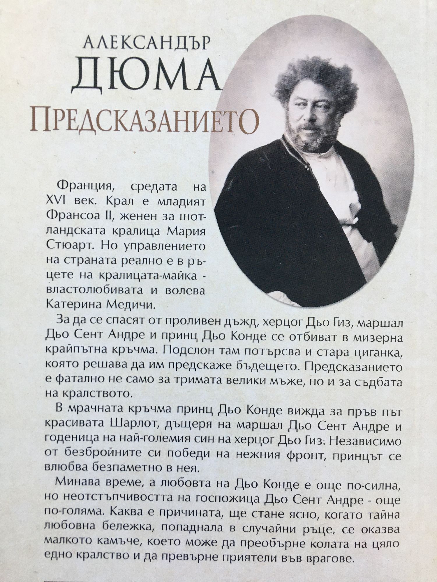Кралицата-отровителка Катерина Медичи изгрява в романа „Предсказанието“ на Александър Дюма. Писателят разказва предисторията на „Кралица Марго“ в книгата, която сега излиза за пръв път на български. Историята на властолюбивата и със силна воля кралица Катерина Медичи - една от най-противоречивите фигури в световната история, се разкрива с целия си демоничен блясък в този малко познат роман на Александър Дюма. Книгата поставя началото на поредицата на Дюма, разказваща за династията Валоа. Романът е завръзката на трагедията, която ще сполети хугенотите по време на Вартоломеевата нощ и която е в центъра на романа „Кралица Марго“. Франция, средата на XVI век. Крал е младият Франсоа II, женен за шотландската кралица Мария Стюарт. Но управлението на страната реално е в ръцете на кралицата-майка - Катерина Медичи. За да се спасят от проливен дъжд, херцог Дьо Гиз, маршал Дьо Сент Андре и принц Дьо Конде се отбиват в мизерна крайпътна кръчма. Подслон там потърсва и циганка, която решава да им предскаже бъдещето. Предсказанието е фатално не само за тримата велики мъже, но и за съдбата на кралството. В мрачната кръчма принц Дьо Конде вижда за пръв път красивата Шарлот, дъщеря на маршал Дьо Сент Андре и годеница на най-големия син на херцог Дьо Гиз. Независимо от безбройните си победи на нежния фронт, принцът се влюбва безпаметно в нея. Дълго време след това любовта на Дьо Конде е все по-силна, ала неотстъпчивостта на госпожица Дьо Сент Андре - все по-голяма. Каква е причината, ще стане ясно, когато тайна любовна бележка, попаднала в случайни ръце, се оказва малкото камъче, което ще преобърне колата на цяло едно кралство и ще превърне приятели във врагове.