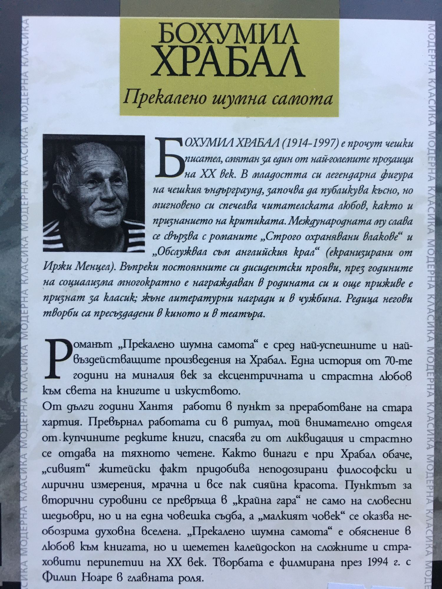 Романът „Прекалено шумна самота“ е сред най-успешните и най-въздействащите произведения на Храбал. Една история от 70-те години на миналия век за ексцентричната и страстна любов към света на книгите и изкуството. От дълги години Хантя работи в пункт за преработване на стара хартия. Превърнал работата си в ритуал, той внимателно отделя от купчините редките книги, спасява ги от ликвидация и страстно се отдава на тяхното четене. Както винаги е при Храбал обаче, „сивият“ житейски факт придобива неподозирани философски и лирични измерения, мрачна и все пак сияйна красота. Пунктът за вторични суровини се превръща в „крайна гара“ не само на словесни шедьоври, но и на една човешка съдба, а „малкият човек“ се оказва необозрима духовна вселена. „Прекалено шумна самота“ е обяснение в любов към книгата, но и шеметен калейдоскоп на сложните и страховити перипетии на ХХ век. Творбата е филмирана през 1994 г. с Филип Ноаре в главната роля.