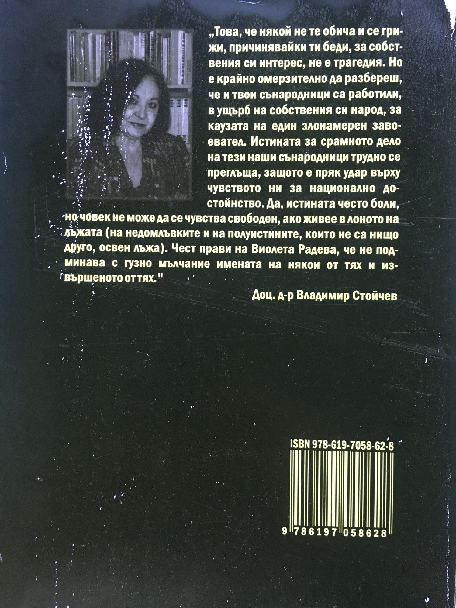 „Това, че някой не те обича и се грижи, причинявайки ти беди, за собствения си интерес, не е трагедия. Но е крайно омерзително да разбереш, че и твои сънародници са работили, в ущърб на собствения си народ, за каузата на един злонамерен завоевател. Истината за срамното дело на тези наши сънародници трудно се преглъща, защото е пряк удар върху чувството ни за национално достойнство. Да, истината често боли, но човек не може да се чувства свободен, ако живее в лоното на лъжата (на недомлъвките и на полуистините, които не са нищо друго, освен лъжа). Чест прави на Виолета Радева, че не подминава с гузно мълчание имената на някои от тях и извършеното оттях." Доц. д-р Владимир Стойчев