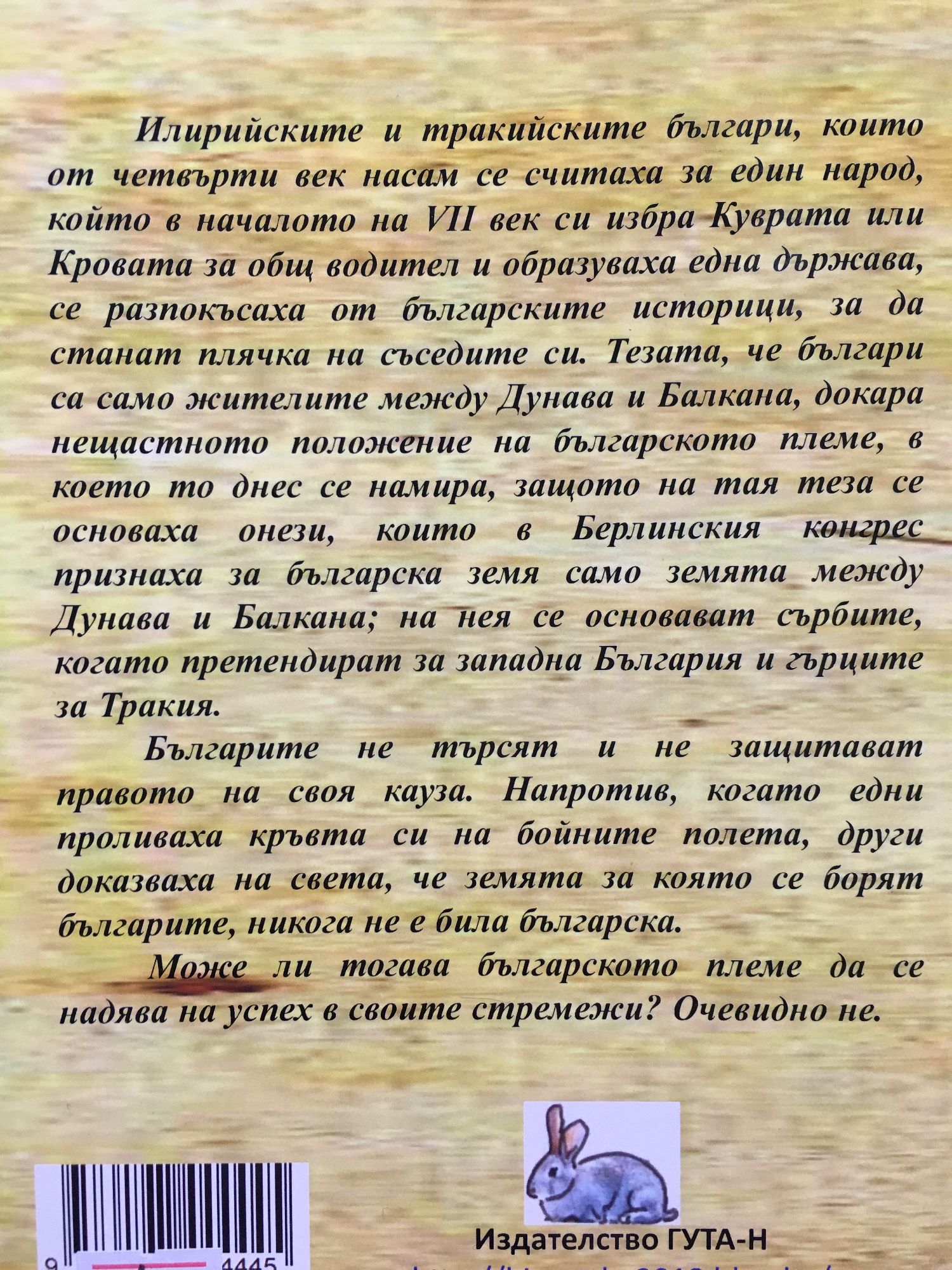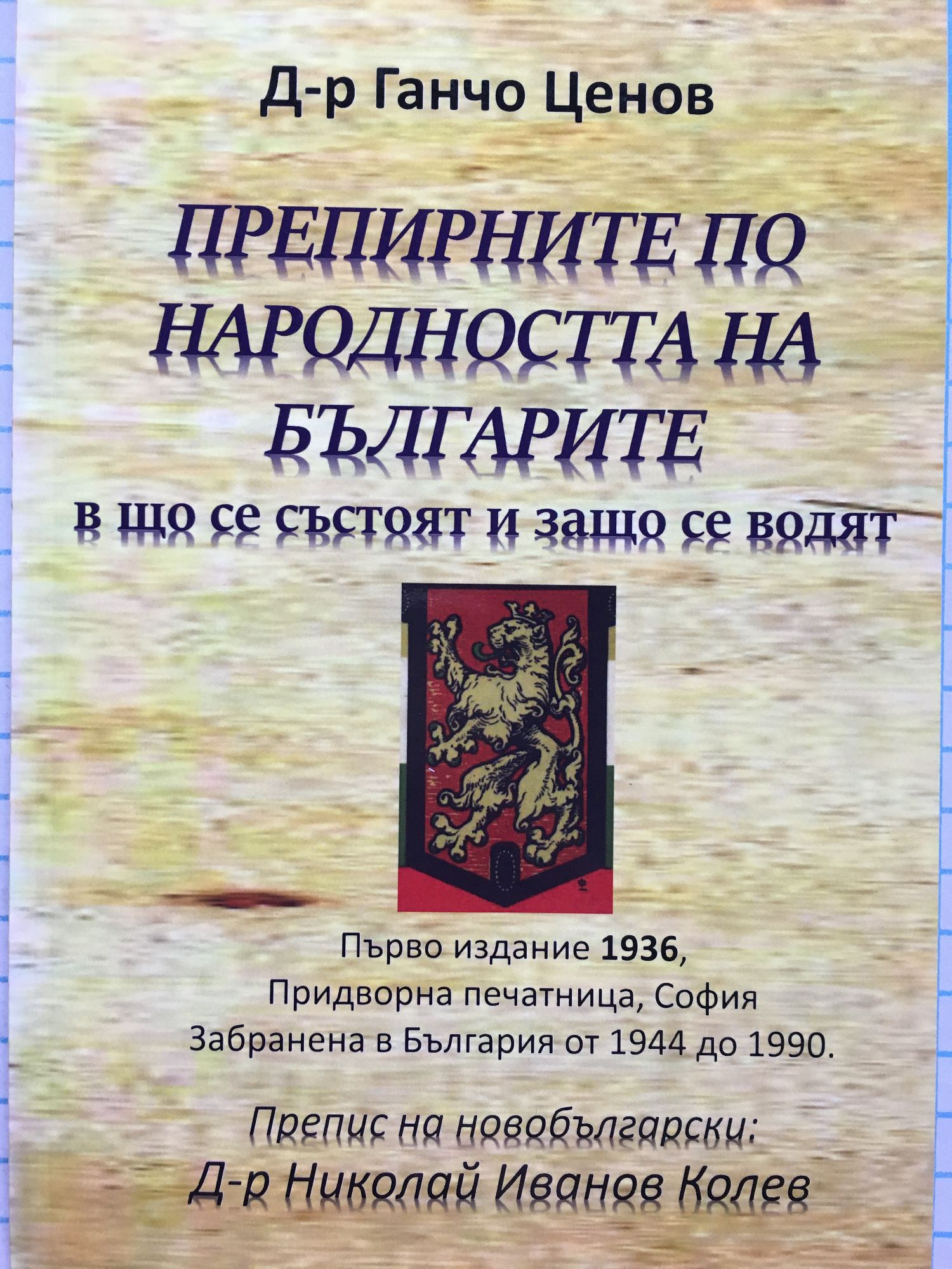 Първо издание 1936. Препис на новобългарски: Д-р. Николай Иванов Колев. "Уважаеми читателю, В ръцете си държиш книга от българския историк и преподавател в университета "Александър фон Хумболт" в Берлин д-р Ганчо Ценов. Книгата е издадена в България 36 години, след като той е защитил докторската дисертация в този университет. Това е съвсем кратко, но изключително полезно изложение на изводите, до които е достигнал след 36 години интензивни научни изследвания за произхода на българите. Изложението е в полемична форма, показващо огромните щети за развитието на нашата национална държава от "писане на история обслужвайки едни или други политически интереси", без да се държи сметка за фактите, които са ни оставили старите автори. Нещо повече, от това че "когато едни проливаха кръвта си на бойните полета, други доказваха на света, че земята за която се борят българите, никога не е била българска", последиците бяха не само, че на Берлинския конгрес се полагат границите в Тракия както е дадено в немското издание на историята на Златарски (в българското тези карти не са публикувани), не само че България загуби своите Западни погранични райони, Македония и Беломорска Тракия, но и че до днес продължава безсмислената дискусия за "националността на македонците" която трови атмосферата на Балканите. Ценов с болка споделя през 1936 г., че "...в България вземаха връх онези, които не вярват в способностите на своя народ, онези, които Паисий нарича страхливци; те обаче ще опропастят България. За да не направят това, се води борбата." След 1944 тази нашата история не се пренаписа на базата на фактите, а си остана във форма и съдържание обслужваща интересните на други сили, които не бяха, и не са интереси на България. Затова между 1944 и 1990 тази книга беше забранена. За щастие сега я получаваш, драги читателю, преписана на съвременен български език. Това е книга за размисъл на всеки българин, обичащ отечеството и рода си!" Д-р Николай Иванов Колев