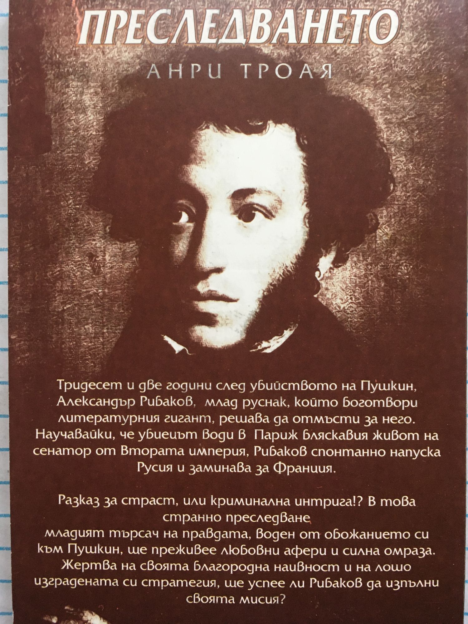 Тридесет и две години след убийството на Пушкин, Александър Рибаков, млад руснак, който боготвори литературния гигант, решава да отмъсти за него. Научавайки, че убиецът води в Париж бляскавия живот на сенатор от Втората империя, Рибаков спонтанно напуска Русия и заминава за Франция. Разказ за страст, или криминална интрига?! В това странно преследване младият търсач на правдата, воден от обожанието си към Пушкин, ще преживее любовни афери и силна омраза. Жертва на своята благородна наивност и на лошо изградената си стратегия, ще успее ли Рибаков да изпълни своята мисия?