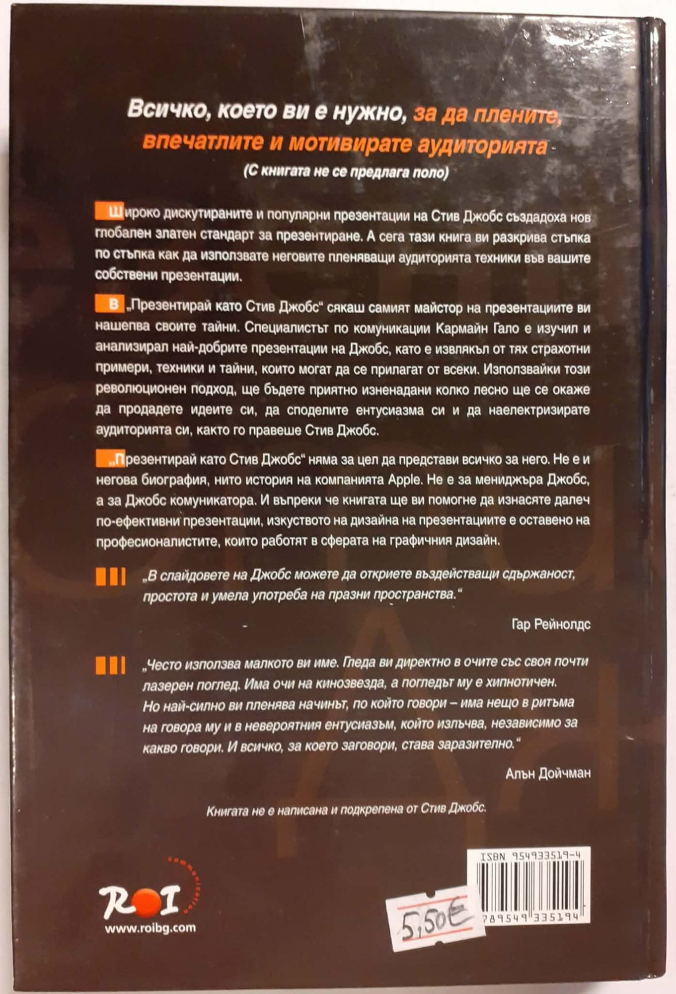 Милиони хора по света са гледали и гледат презентациите на Джобс. Мнозина твърдят, че Джобс е най-добрият презентатор в света на бизнеса. Всеки, за когото презентирането е част от работата му, се е замислял как да направи следващата си презентация по-въздействаща. Сега ще ни е по-лесно, защото в „Презентирай като Стив Джобс“ сякаш самия майстор на презентациите ни нашепва своите тайни. Специалистът по комуникации К. Гало е изучил и анализирал най-добрите презентации на Джобс, като е извлякъл от тях страхотни примери, техники и тайни, които могат да се прилагат от всеки. Използвайки този революционен подход, ще бъдете приятно изненадани колко лесно ще се окаже да продадете идеите си, да споделите ентусиазма си и да наелектризирате аудиторията си, както го правеше Стив Джобс. Широко дискутираните и популярни презентации на Стив Джобс създадоха нов глобален златен стандарт за презентиране. А сега тази книга ви разкрива стъпка по стъпка как да използвате неговите пленяващи аудиторията техники във вашите собствени презентации. „Презентирай като Стив Джобс“ няма за цел да представи всичко за Стив Джобс. Не е и негова биография, нито история на компанията Apple. Не е книга за мениджъра Джобс, а книга за Джобс-комуникатора. И въпреки че книгата ще ви помогне да изнасяте далеч по-ефективни презентации, изкуството на дизайна на презентациите е оставено на професионалистите, които работят в сферата на графичния дизайн.