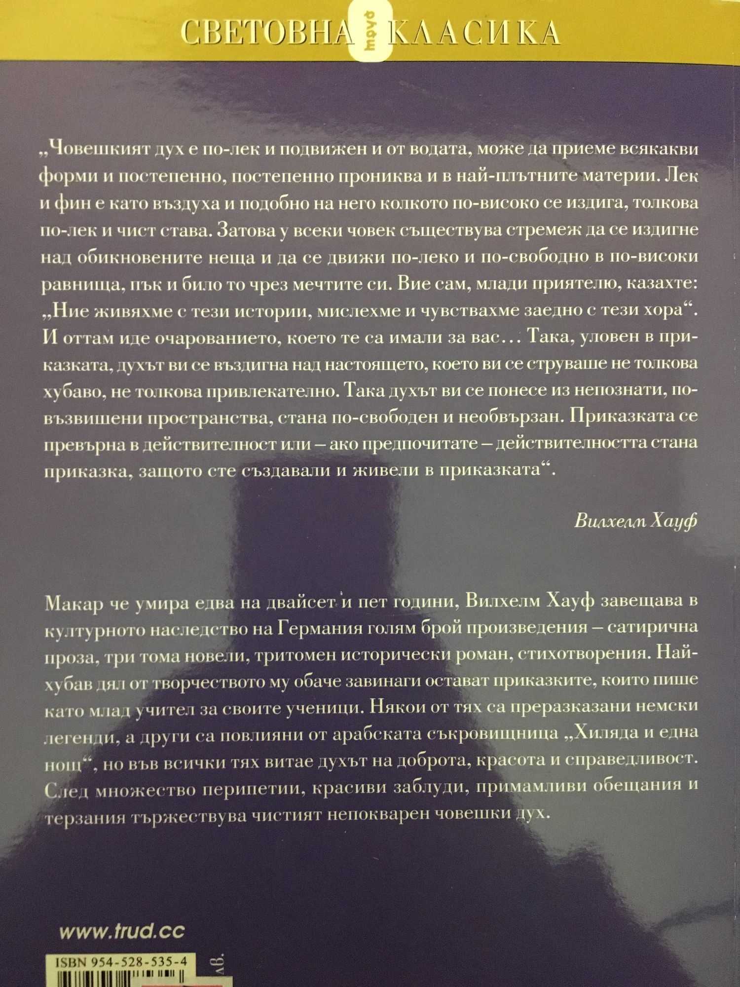 "Човешкият дух е по-лек и подвижен и от водата, може да приеме всякакви форми и постепенно, постепенно прониква и в най-плътните материи. Лек и фин е като въздуха и подобно на него колкото по-високо се издига, толкова по-лек и чист става. Затова у всеки човек съществува стремеж да се издигне над обикновените неща и да се движи по-леко и по-свободно в по-високи равнища, пък и било то чрез мечтите си. Вие сам, млади приятелю, казахте: "Ние живяхме с тези истории, мислехме и чувствахме заедно с тези хора". И оттам иде очарованието, което те са имали за вас... така, уловен в приказката, духът ви се въздигна над настоящето, което ви се струваше не толкова хубаво, не толкова привлекателно. Така духът ви се понесе из непознати, по-възвишени пространства, стана по-свободен и необвързан. Приказката се превърна в действителност или - ако предпочитате - действителността стана приказка, защото сте създавали и живели в приказката." Вилхелм Хауф Макар да умира на двайсет и пет години, Вилхелм Хауф завещава в културното наследство на Германия голям брой произведения - сатирична проза, три тома новели, тритомен исторически роман, стихотворения. Най-хубав дял от творчеството му обаче завинаги остават приказките, които пише като млад учител за своите ученици. Някои от тях са преразказани немски легенди, а други са повлияни от арабската съкровищница "Хиляда и една нощ", но във всички тях витае духът на доброта, красота и справедливост. След множество перипетии, красиви заблуди, примамливи обещания и терзания тържествува чистият непокварен човешки дух.