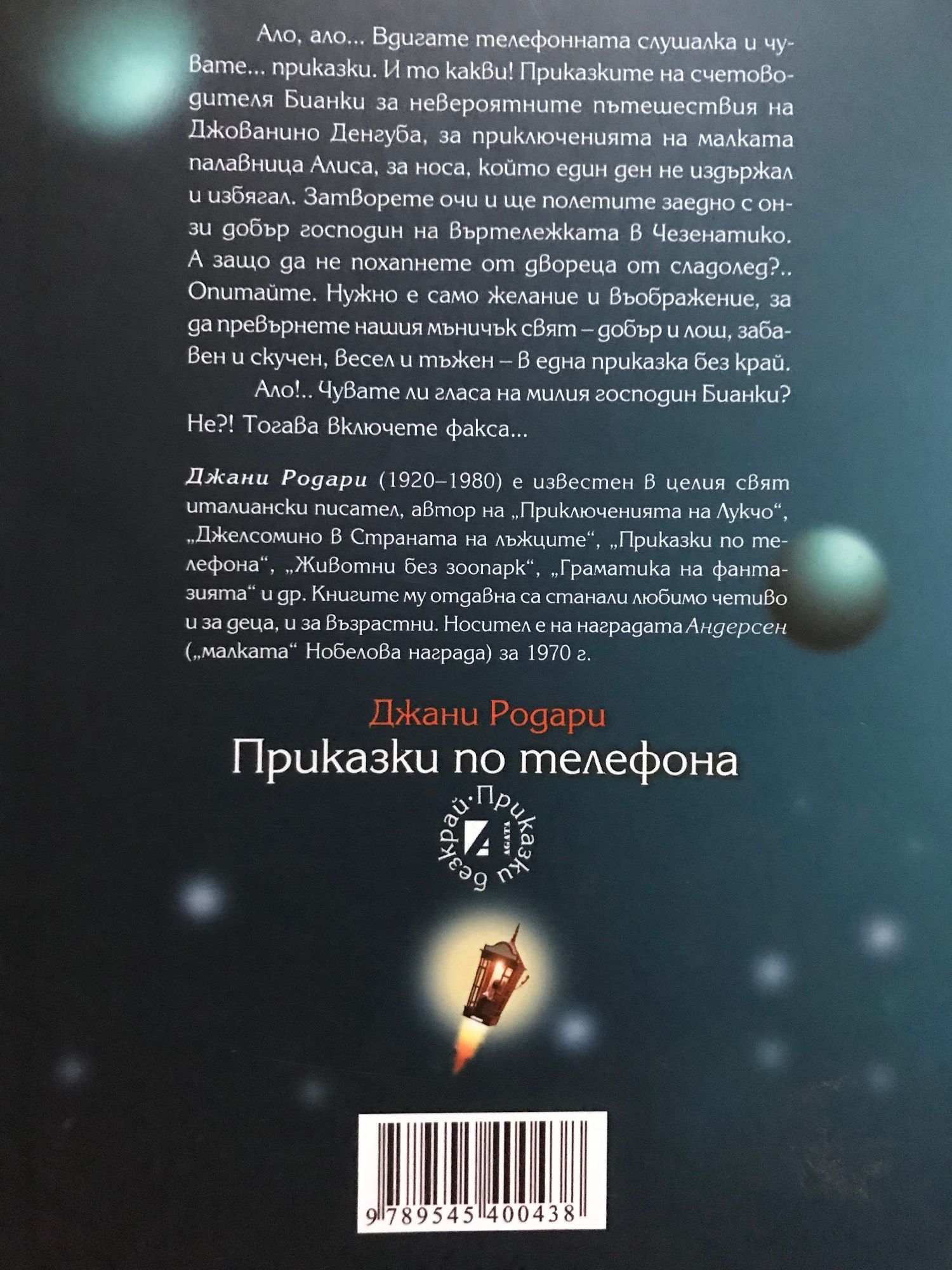 Ало, ало... Вдигате телефонната слушалка и чувате... приказки. И то какви! Приказките на счетоводителя Бианки за невероятните пътешествия на Джованино Денгуба, за приключенията на малката палавница Алиса, за носа, който един ден не издържал и избягал. Затворете очи и ще полетите заедно с онзи добър господин на въртележката в Чезенатико. А защо да не похапнете от двореца от сладолед?.. Опитайте. Нужно е само желание и въображение, за да превърнете нашия мъничък свят - добър и лош, забавен и скучен, весел и тъжен - в една приказка без край.