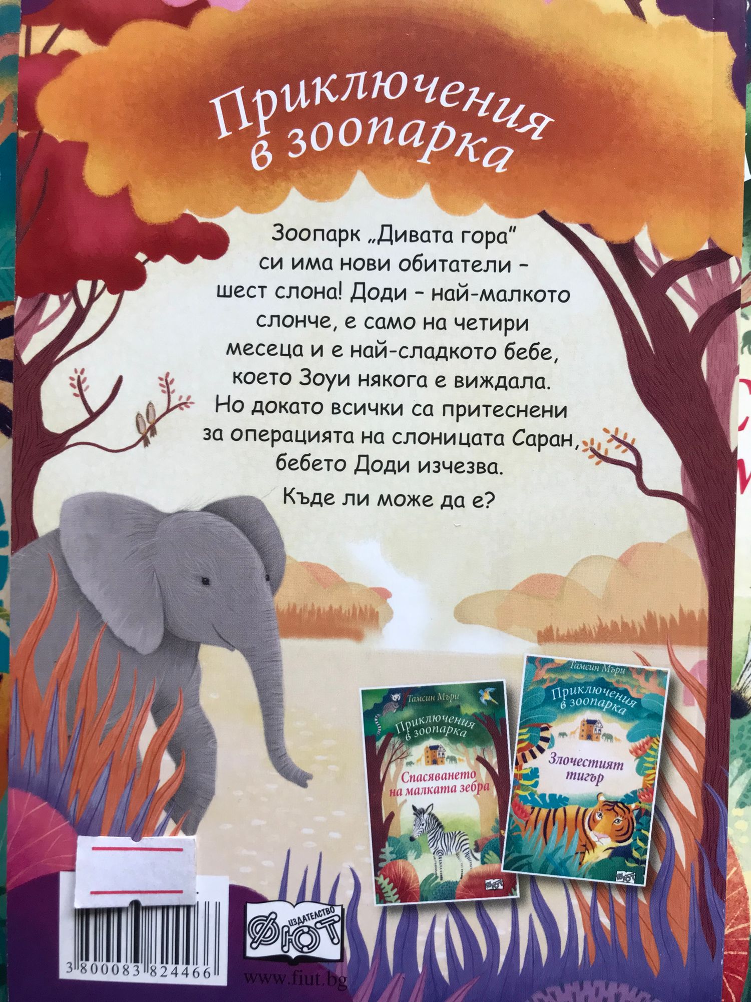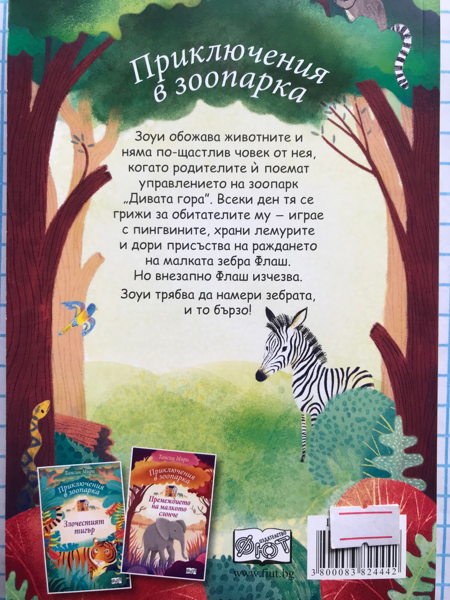Книга 1: Зоопарк „Дивата гора” си има нови обитатели – шест слона! Доди – най‑малкото слонче, е само на четири месеца и е най‑сладкото бебе, което Зоуи някога е виждала. Но докато всички са притеснени за операцията на слоницата Саран, бебето Доди изчезва. Къде ли може да е? Книга 2: Зоуи с нетърпение очаква да се запознае с тигъра Тинду – един от новите обитатели на зоопарк „Дивата гора”. Ала след пристигането си той е тъжен, не се храни и отказва да излезе от бърлогата си. Ще успее ли Зоуи да му помогне да се почувства щастлив в новия си дом? Книга 3: Зоуи обожава животните и няма по-щастлив човек от нея, когато родителите й поемат управлението на зоопарк „Дивата гора”. Всеки ден тя се грижи за обитателите му - играе с пингвините, храни лемурите и дори присъства на раждането на малката зебра Флаш. Но внезапно Флаш изчезва. Зоуи трябва да намери зебрата, и то бързо!