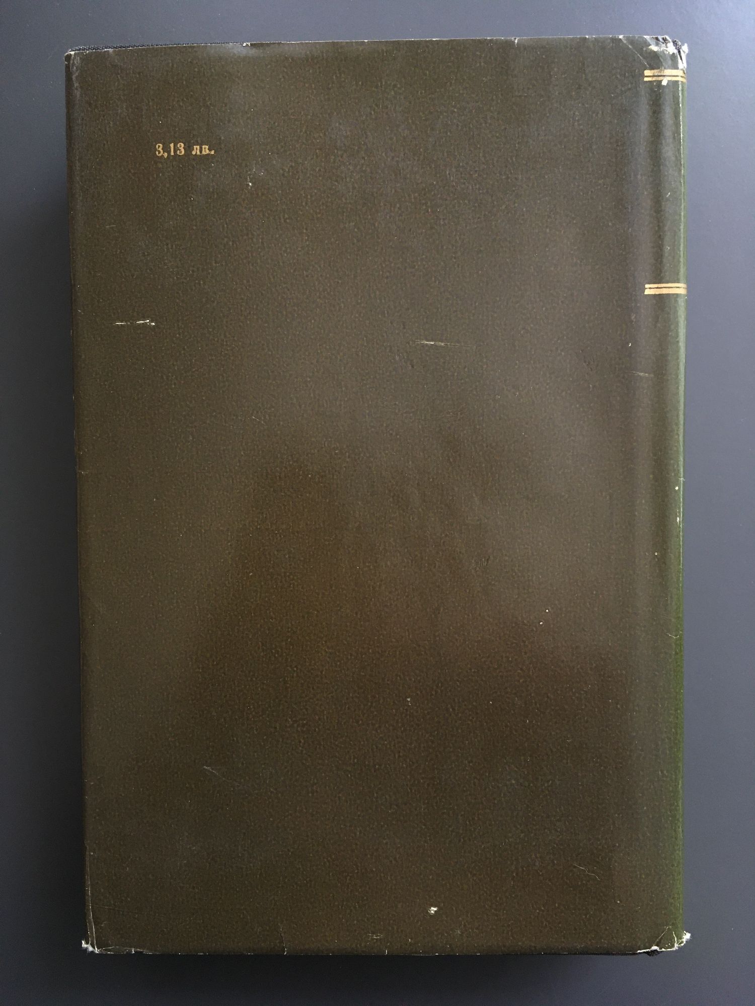 22,00 лв. / 11,25 €Много добро състояние на книжното тяло. С леко подбит горен край на гръбчето на книгата, съотв. слаба следа по обложката там. Леко зацапани на места корици, също слабо порезката отгоре и отдолу. Почти без следи от употреба по листовете вътре