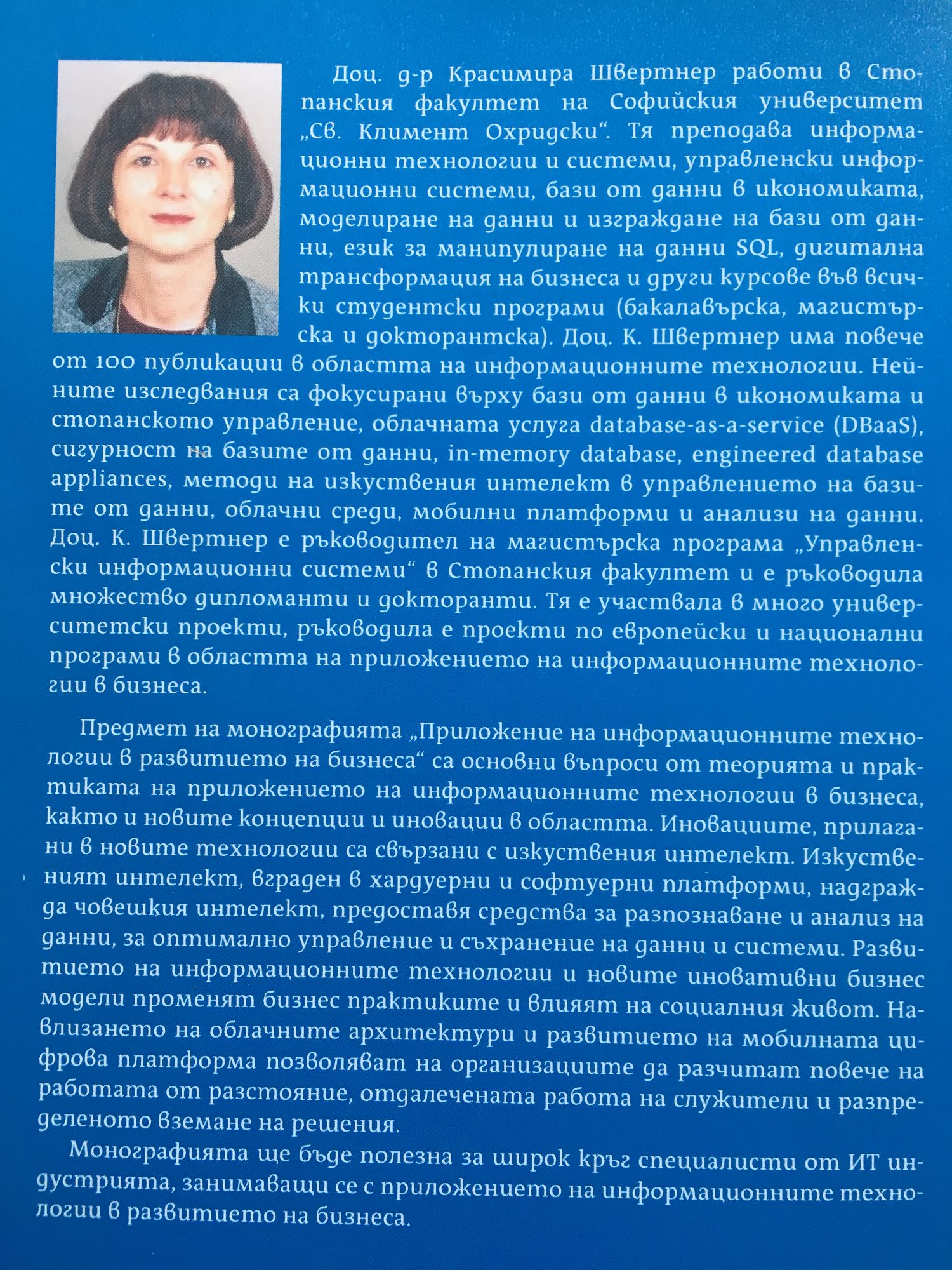 Доц. д-р Красимира Швертнер работи в Стопанския факултет на Софийския университет „Св. Климент Охридски". Тя преподава информационни технологии и системи, управленски информационни системи, бази от данни в икономиката, моделиране на данни и изграждане на бази от данни, език за манипулиране на данни SQL, дигитална трансформация на бизнеса и други курсове във всички студентски програми (бакалавърска, магистърска и докторантска). Доц. К. Швертнер има повече от 100 публикации в областта на информационните технологии. Нейните изследвания са фокусирани върху бази от данни в икономиката и стопанското управление, облачната услуга database-as-a-service (DBaaS), сигурност на базите от данни, in-memory database, engineered database appliances, методи на изкуствения интелект в управлението на базите от данни, облачни среди, мобилни платформи и анализи на данни. Доц. К. Швертнер е ръководител на магистърска програма „Управленски информационни системи" в Стопанския факултет и е ръководила множество дипломанти и докторанти. Тя е участвала в много университетски проекти, ръководила е проекти по европейски и национални програми в областта на приложението на информационните технологии в бизнеса. Предмет на монографията „Приложение на информационните технологии в развитието на бизнеса" са основни въпроси от теорията и практиката на приложението на информационните технологии в бизнеса, както и новите концепции и иновации в областта. Иновациите, прилагани в новите технологии са свързани с изкуствения интелект. Изкуственият интелект, вграден в хардуерни и софтуерни платформи, надгражда човешкия интелект, предоставя средства за разпознаване и анализ на данни, за оптимално управление и съхранение на данни и системи. Развитието на информационните технологии и новите иновативни бизнес модели променят бизнес практиките и влияят на социалния живот. Навлизането на облачните архитектури и развитието на мобилната цифрова платформа позволяват на организациите да разчитат повече на работата от разстояние, отдалечената работа на служители и разпределеното вземане на решения. Монографията ще бъде полезна за широк кръг специалисти от ИТ индустрията, занимаващи се с приложението на информационните технологии в развитието на бизнеса.