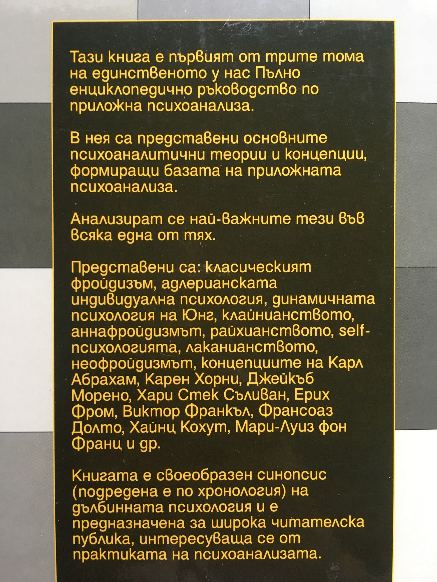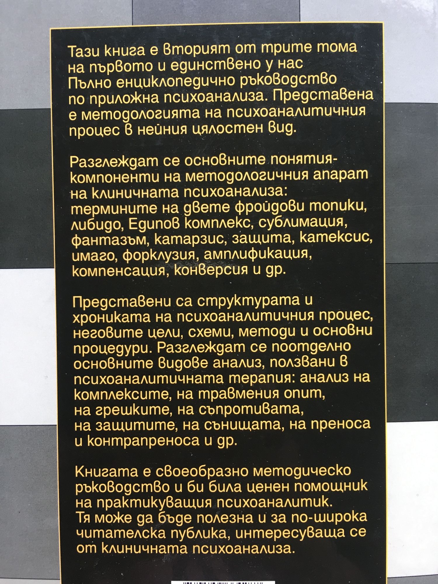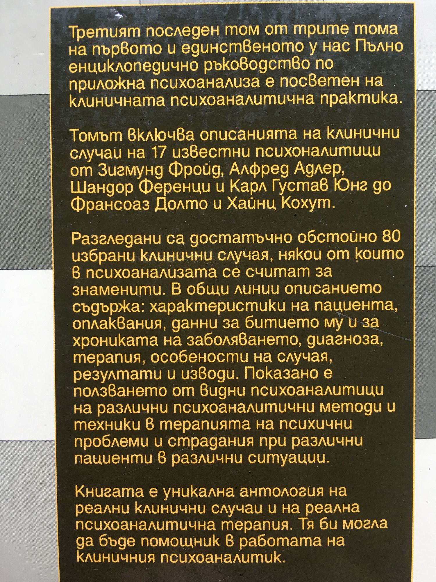 Книгата е първи том на единственото в България пълно енциклопедично ръководство по приложна психотерапия. Представлява Обща психотерапия и съдържа психодиагностика, методика на психоконсултациите и психокорекциите. Представя основните направления, школи и разновидности на психотерапията и описва психотерапевтичния процес и най-ползваните методи за лечение на психични страдания, отчитайки обстоятелствата у нас. Книгата е предназначена за широка читателска публика, интересуваща се по различни поводи от психологията, психопатологията и психотерапията. Може да бъде използвана като справочник и като методически съветник в психотерапевтичната практика. Би могла да служи и като учебник по психотерапия за студенти и курсисти. Тази внига е вторият от трите тома на първото и единствено у нас пълно енциклопедично ръководство по приложна психоанализа. Представена е методологията на психоаналитичния процес в нейния цялостен вид. Разглеждат се основните понятия-компоненти на методологичния апарат на клиничната психоанализа: термините на двете фкатарзис, защита, катексис, имаго, форклузия, амплификация, компенсация, конверсия и др. Представени са структурата и хрониката на психоаналитичния процес, неговите цели, схеми, методи и основни процедури. Разглеждат се поотделно основните видове анализ, ползвани в психоаналитичната терапия: анализ на комплексите, на травмения опит, на грешките, на съпротивата, на защитите, на сънищата, на преноса и контрапреноса и др. Книгата е своеобразно методическо ръководство и би била ценен помощник на практикуващия психоаналитик. Тя може да бъде полезна и за по-широка читателска публика, интересуваща се от клиничната психоанализа. Третият последен том на първото и единственото у нас Пълно енциклопедично ръководство по приложна психоанализа е посветен на клиничната психоаналитична практика. Томът включва описанията на клинични случаи на 17 известни психоаналитици от Зигмунд Фройд, Алфред Адлер, Шандор Ференци и Карл Густав Юнг до Франсоаз Долто и Хайнц Кохут. Разгледани са достатъчно обстойно 80 избрани клинични случая, сякои от които в психоанализата се считат за знаменити. В общи линии описанието съдържа: характеристики на пациента, оплаквания, данни за битието му и за хрониката на заболяването, диагноза, терапия, особености на случая, резултати и изводи. Показано е ползването от видни психоаналитици на различни психоаналитични методи и техники в терапията на психични проблеми и страдания при различни пациенти в различни ситуации. Книгата е уникална антология на реални клинични случаи и на реална психоаналитична терапия. Тя би могла да бъде помощник в работата на клиничния психоаналитик.