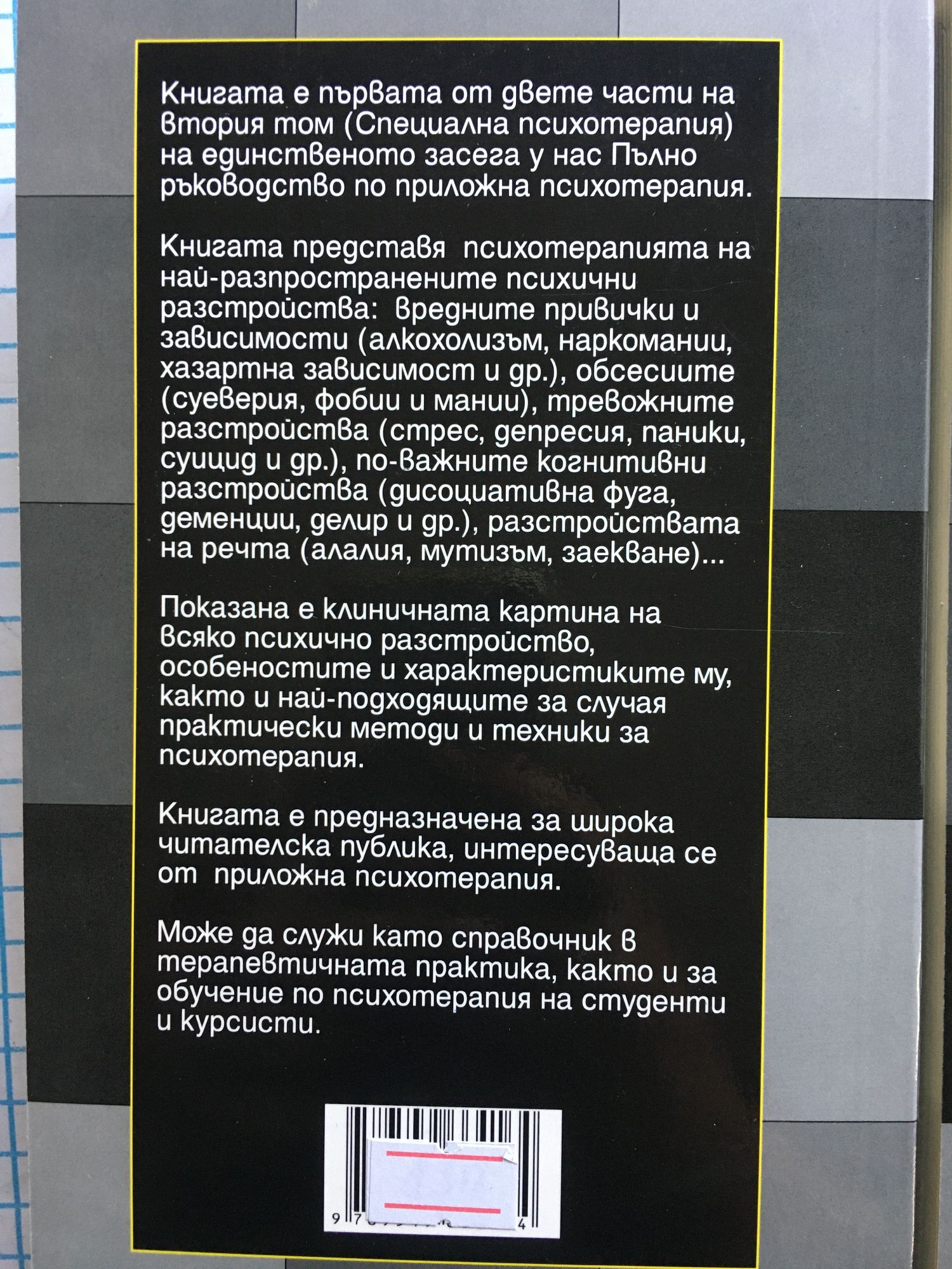Специална психиатрия Книгата е първата от двете части на втория том на единственото засега у нас „Пълно ръководство по приложна психотерапия”. Книгата представя психотерапията на най-разпространените психични разстройства: вредните привички и зависимости (алкохолизъм, наркомании, хазартна зависимост и др.), обсесиите (суеверия, фобии и мании), тревожните разстройства (стрес, депресия, паники, суицид и др.), по-важните когнитивни разстройства (дисоциативна фуга, деменции, делир и др.), разстройствата на речта (алалия, мутизъм, заекване)... Показана е клиничната картина на всяко психично разстройство, особеностите и характеристиките му, както и най-подходящите за случая практически методи и техники за психотерапия. Книгата е предназначена за широка читателска публика, интересуваща се от приложна психотерапия. Може да служи като справочник в терапевтичната практика, както и за обучение по психотерапия на студенти и курсисти. Тази книга е втората и последна част на втория том на единственото засега у нас пълно ръководство по „Приложна психотерапия”. Представена е психотерапията на най-разпространените психични разстройства: умствена ретардация и олигофрении; поведенски разстройства, тикове, разстройства на храненето, екскрецията и съня. Описани са също: джендърни, семейни, любовни и сексуални проблеми; възрастови кризи; психосоматични страдания; разстройства на личността; психични проблеми при насилие. Показана е клиничната картина на всяко от тях, основните характеристики и особеностите му, диагностицирането, диференциалната диагноза, както и най-подходящите за случая практически методи и техники за психотерапия. Книгата е предназначена за широка читателска публика, интересуваща се по различен повод от психопатология и психотерапия. Може да служи като справочник в терапевтичната практика, както и за обучение по психотерапия на студенти и курсисти.
