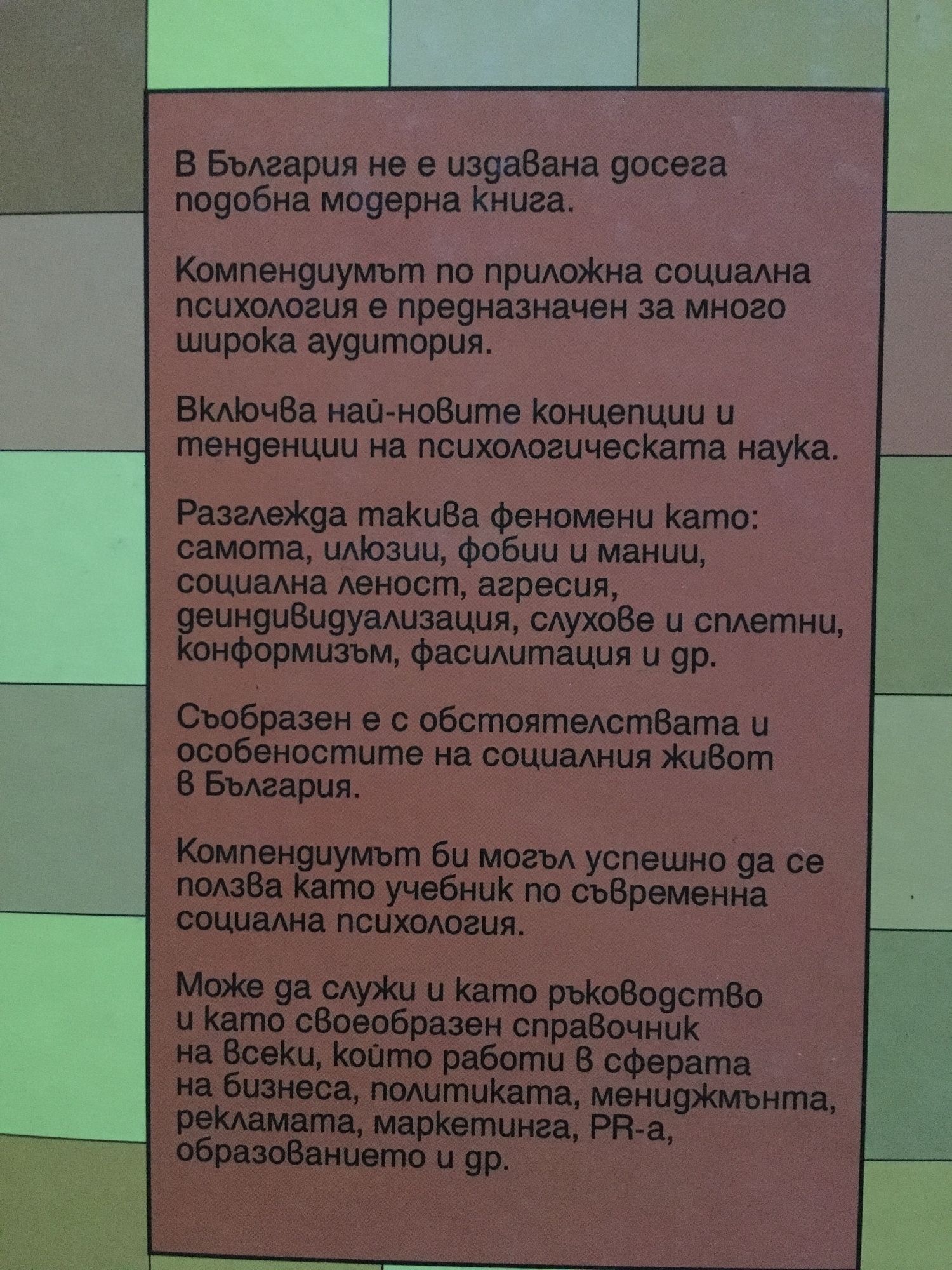 В България не е издавана досега подобна модерна книга. Компендиумът по приложна социална психология е предназначен за много широка аудитория. Включва най-новите концепции и тенденции на психологическата наука. Разглежда такива феномени като: самота, илюзии, фобии и мании, социална леност, агресия, деиндивидуализация, слухове и сплетни, конформизъм, фасилитация и др. Съобразен е с обстоятелствата и особеностите на социалния живот в България. Компендиумът може да служи и като ръководство и като своеобразен справочник на всеки, който работи в сферата на бизнеса, политиката, мениджмънта, рекламата, маркетинга, PR-а, образованието и др.