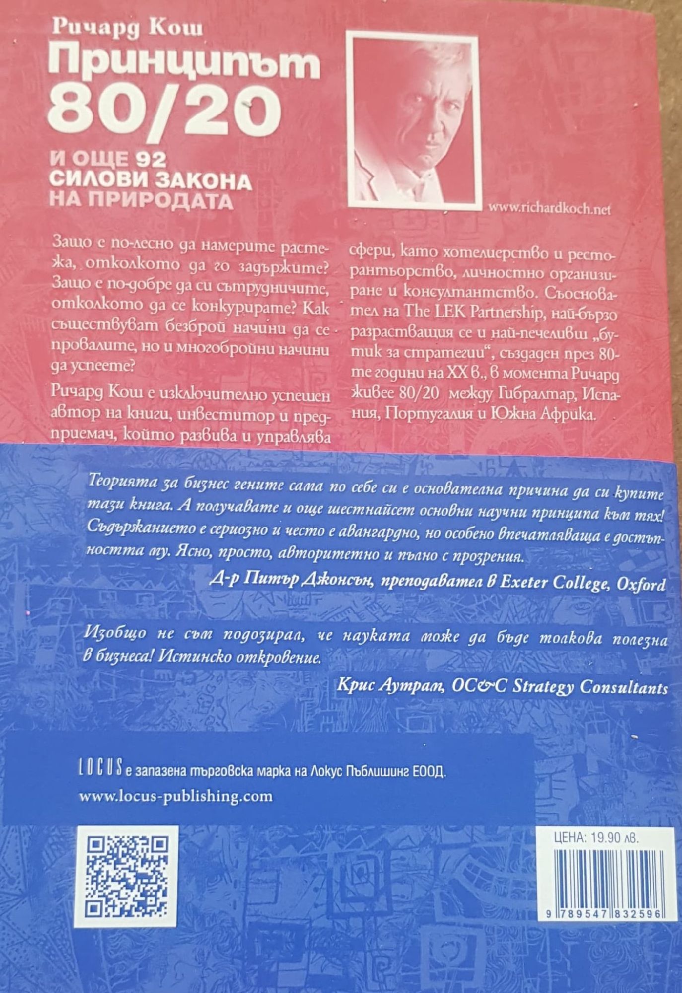 „Тази книга обобщава научни прозрения от Нютон до наши дни, съставяйки практически наръчник за успех в бизнеса и в живота. Невероятна изобретателност.” Джеймс А. Лорънс, изпълнителен вицепрезидент, General Mills „Интригуваща и много необичайна книга. Кош казва неща, които наистина трябва да бъдат казани, но не сме ги чували другаде. Едновременно интелектуална и практичeска, книгата е много четивна и провокира мисълта.” Д-р Жюл Годар, London Business School „Вълнуващо четиво! „Силовите закони” засяга много от най-важните дебати, които се водят в академичните и бизнес средите, но отива и по-далече, като генерира идеи за всички, които се занимават с бизнес. Предстои важна промяна в начина, по който възприемаме компаниите и мениджмънта и тази книга има голям принос за новото мислене.” Д-р Маркъс Алекзандър, директор на Център за стратегически мениджмънт Ashridge „Теорията за бизнес гените сама по себе си е основателна причина да си купите тази книга. А получавате и още шестнайсетосновни научни принципа към тях! Съдържанието е сериозно и често е авангардно, но особено впечатляваща е достъпността му. Ясно и просто, но и авторитетно и пълно с прозрения.” Д-р Питър Джонсън, преподавател в Exeter College, Oxford „Изобщо не съм подозирал, че науката може да бъде толкова полезна в бизнеса!” Истинско откровение.” Крис Аутрам, OC&C Strategy Consultants НАУКАТА ЗА УСПЕХА “Ричард Кош предоставя наистина проницателни междудисциплинарни сравнения, като много добре познава както научната, така и бизнес материята...Кош е здраво стъпил на земята.” The Sunday Times “Убедително и забавно,Кош, засягащ и спорни идеи, съпоставя естествената вселена и съвременния бизнес свят. Следвайте елегантните мисловни процеси на автора и ще погледнете на бизнеса си по нов начин.” Enterprise В уводa към това ново издание световно известният Ричард Кош описва промяната в бизнес парадигмите, където интуицията вече е по-важна от анализите, идеите и продуктовите стратегии, а влиянието взема превес над контрола. В това изключително необходимо продължение на “Принципът 80/20” – основния силов закон, помогнал на милиони хора до постигат повече с по-малко усилия, Кош разяснява още 92 универсални принципи и закони, извисяващи науката на успеха в изпълнената с предизвикателства бизнес среда. * ЕВОЛЮЦИЯ ЧРЕЗ ЕСТЕСТВЕН ПОДБОР * БИЗНЕС ГЕНИ * ЗАКОНИТЕ НА ГАУЗЕ * ЕВЛЮЦИОННА ПСИХОЛОГИЯ * ДИЛЕМАТА НА ЗАТВОРНИКА * ЗАКОНИТЕ НА НЮТОН * ТЕОРИЯ НА ОТНОСИТЕЛНОСТТА * КВАНТОВА МЕХАНИКА * ТЕОРИЯ НА ХАОСА * ТЕОРИЯ НА СЛОЖНОСТТА * ПРИНЦИПЪТ 80/20 * ПРЕКЪСНАТО РАВНОВЕСИЕ * ПОВРАТНА ТОЧКА * УВЕЛИЧАВАЩА СЕ ВЪЗВРЪЩАЕМОСТ * ПАРАДОКСЪТ НА ЗАБОГАТЯВАНЕТО * ЕНТРОПИЯ * НЕПЛАНИРАНИ ПОСЛЕДСТВИЯ* защо е по-лесно да намерите растежа, отколкото да го задържите защо е по-добре да си сътрудничите, отколкото да се конкурирате как съществуват безброй начини да се провалите, но и многобройни начини на успеете Ричард Кош е изключително успешен автор на книги, инвеститор и предприемач, който развива и управлява печеливши начинания в разнообразни сфери като хотелиерство и ресторантьорство, личностно организиране и консултантство. Съосновател на The LEK Partnership, най-бързо разрастващия се и най-печеливш “бутик за стратегии”, създаден през 80-те години на 20 в., в момента Ричард живее 80/20 между Гибралтар, Испания, Португалия и Южна Африка.