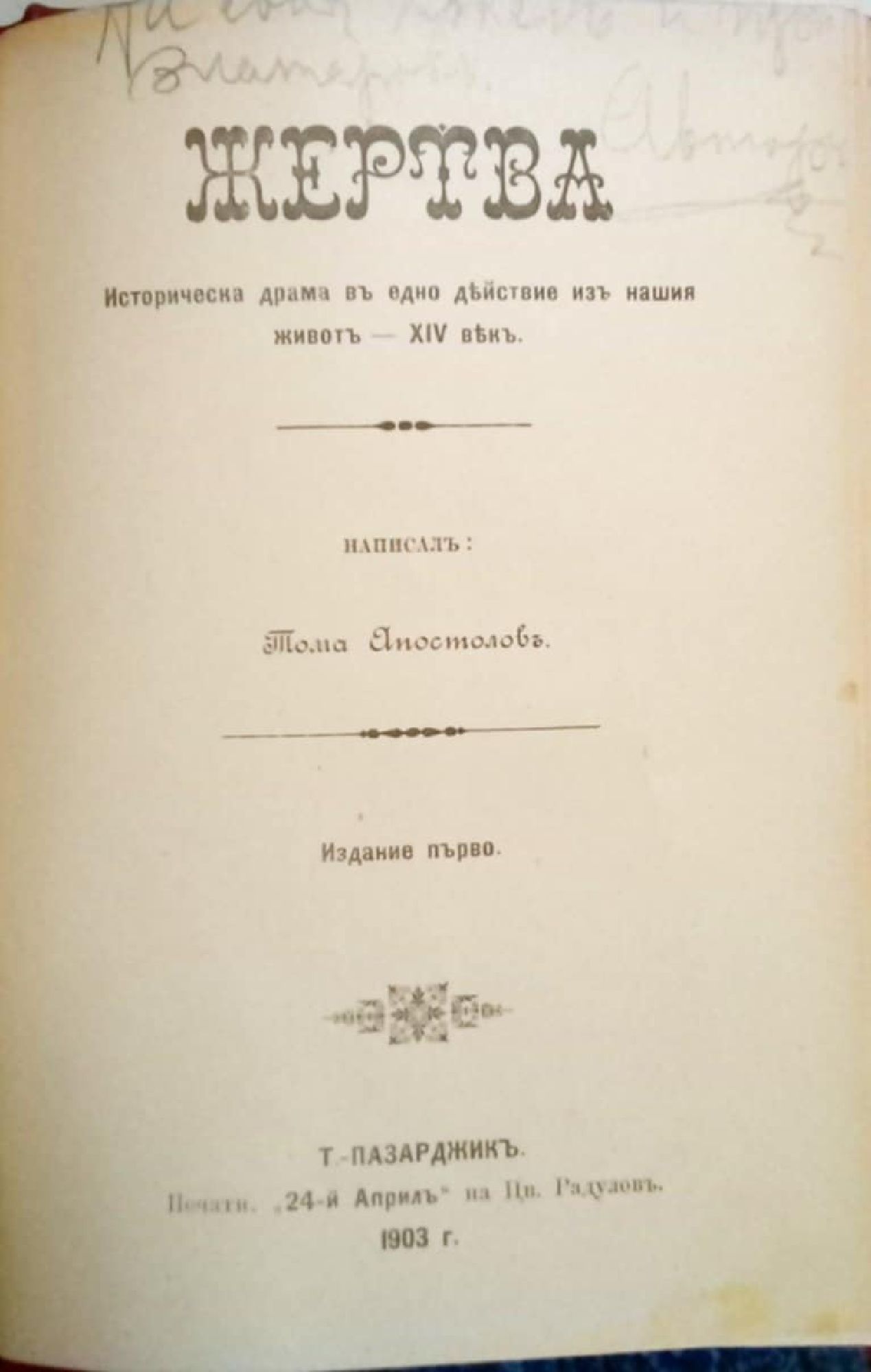 Конволют от две антикварни книги: В. Райн, А. Пикел, Е. Шелер. Принципите на общата дидактика отъ (от) "Първата училищна година" на "Theorie und Praxis des Volksschulunterrichts". Ръководство за учители и за учениците отъ педагогическите училища. Стара Загора, 1902, 230 с. 2. Тома Апостолов. Жертва. Историческа драма въ едно действие изъ нашия животъ - 14 векъ. Т.-Пазарджик, 1903, 30 с.