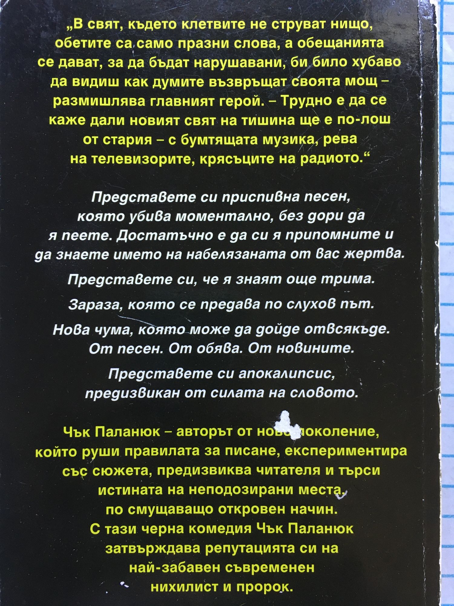 Камъни, дърва, тояги, костите ти ще строшат, но сега словата благи, също могат да вредят. "В свят, където клетвите не струват нищо, обетите са само празни слова, а обещанията се дават, за да бъдат нарушавани, би било хубаво да видиш как думите възвръщат своята мощ – размишлява главният герой. – Трудно е да се каже дали новият свят на тишина ще е по-лош от стария - с бумтящата музика, рева на телевизорите, крясъците на радиото." Представете си приспивна песен, която убива моментално, без дори да я пеете. Достатъчно е да си я припомните и да знаете името на набелязаната от вас жертва. Представете си, че я знаят още трима. Зараза, която се предава по слухов път. Нова чума, която може да дойде отвсякъде. От песен. От обява. От новините. Представете си aпокалипсис, предизвикан от силата на словото. Чък Паланюк – авторът от ново поколение, който руши правилата за писане, експериментира със сюжета, предизвиква читателя и търси истината на неподозирани места, по смущаващо откровен начин. С тази черна комедия Чък Паланюк затвърждава репутацията си на най-забавен съвременен нихилист и пророк.