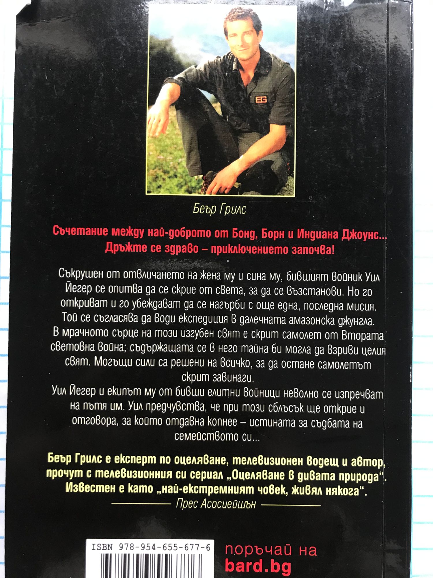 Страховито приключение, екстремна борба за оцеляване, смайваща мистерия! Съчетание между най-доброто от Бонд, Борн и Индиана Джоунс. Дръжте се здраво – приключението започва! Съкрушен от отвличането на жена му и сина му, бившият войник Уил Йегер се опитва да се скрие от света, за да се възстанови. Но го откриват и го убеждават да се нагърби с още една, последна мисия. Той се съгласява да води експедиция в далечната амазонска джунгла. В мрачното сърце на този изгубен свят е скрит самолет от Втората световна война; съдържащата се в него тайна би могла да взриви целия свят. Могъщи сили са решени на всичко, за да остане самолетът скрит завинаги. Уил Йегер и екипът му от бивши елитни войници неволно се изпречват на пътя им. Уил предчувства, че при този сблъсък ще открие и отговора, за който отдавна копнее – истината за съдбата на семейството си... Беър Грилс е експерт по оцеляване, телевизионен водещ и автор, прочут с телевизионния си сериал „Оцеляване в дивата природа“. Известен е като „най-екстремният човек, живял някога“. Прес Асосиейшън
