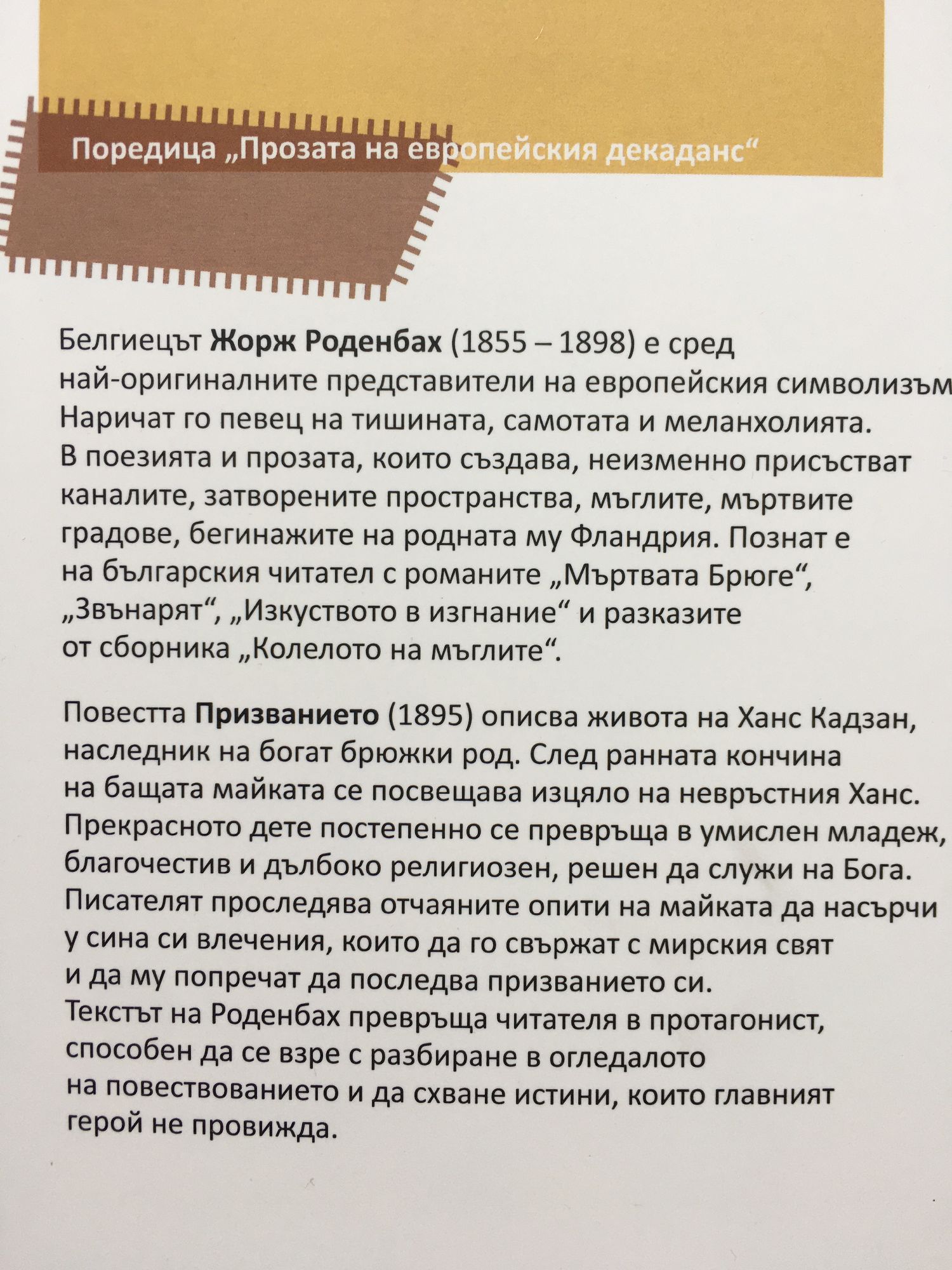 Белгиецът Жорж Роденбах (1855 - 1898) е сред най-оригиналните представители на европейския символизъм. Наричат го певец на тишината, самотата и меланхолията. В поезията и прозата, които създава, неизменно присъстват каналите, затворените пространства, мъглите, мъртвите градове, бегинажите на родната му Фландрия. Познат е на българския читател с романите "Мъртвата Брюге", "Звънарят", "Изкуството в изгнание" и разказите от сборника "Колелото на мъглите". Повестта "Призванието" (1895) описва живота на Ханс Кадзан, наследник на богат брюжки род. След ранната кончина на бащата майката се посвещава изцяло на невръстния Ханс. Прекрасното дете постепенно се превръща в умислен младеж, благочестив и дълбоко религиозен, решен да служи на Бога. Писателят проследява отчаяните опити на майката да насърчи у сина си влечения, които да го свържат с мирския свят и да му попречат да последва призванието си. Текстът на Роденбах превръща читателя в протагонист, способен да се взре с разбиране в огледалото на повествованието и да схване истини, които главният герой не провижда.