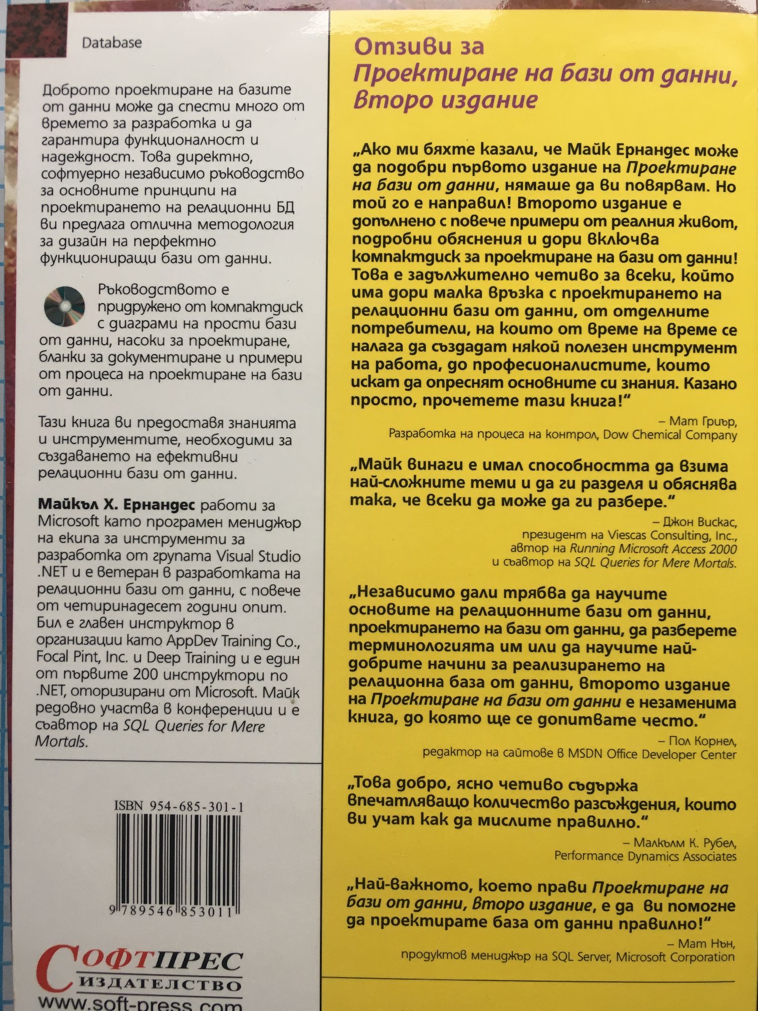 Световен бестселър Практическо ръководство за дизайн на релационни бази от данни Софтуерно независим подход! Без значение какъв софтуер използвате за създаване на приложения за бази от данни, тази книга ви спестява време, пари и часове неприятности — още преди да напишете дори един ред програмен код! Доброто проектиране на базите от данни може да спести много от времето за разработка и да гарантира функционалност и надеждност. Това директно, софтуерно независимо ръководство за основните принципи на проектирането на релационни БД ви предлага отлична методология за дизайн на перфектно функциониращи бази от данни. Ръководството е придружено от компактдиск с диаграми на прости бази от данни, насоки за проектиране, бланки за документиране и примери от процеса на проектиране на бази от данни. Тази книга ви предоставя знанията и инструментите, необходими за създаването на ефективни релационни бази от данни. Майкъл Х. Ернандес работи за Microsoft като програмен мениджър на екипа за инструменти за разработка от групата Visual Studio .NET и е ветеран в разработката на релационни бази от данни, с повече от четиринадесет години опит. Бил е главен инструктор в организации като AppDev Training Co., Focal Pint, Inc. и Deep Training и е един от първите 200 инструктори по .NET, оторизирани от Microsoft. Майк редовно участва в конференции и е съавтор на SQL Queries for Mere Mortals. Отзиви за Проектиране на бази от данни, второ издание “Ако ми бяхте казали, че Майк Ернандес може да подобри първото издание на Проектиране на бази от данни, нямаше да ви повярвам. Но той го е направил! Второто издание е допълнено с повече примери от реалния живот, подробни обяснения и дори включва компактдиск за проектиране на бази от данни! Това е задължително четиво за всеки, който има дори малка връзка с проектирането на релационни бази от данни, от отделните потребители, на които от време на време се налага да създадат някой полезен инструмент на работа, до професионалистите, които искат да опреснят основните си знания. Казано просто, прочетете тази книга!” – Мат Гриър, Разработка на процеса на контрол, Dow Chemical Company “Майк винаги е имал способността да взима най-сложните теми и да ги разделя и обяснява така, че всеки да може да ги разбере.” – Джон Вискас, президент на Viescas Consulting, Inc., автор на Running Microsoft Access 2000 и съавтор на SQL Queries for Mere Mortals. “Независимо дали трябва да научите основите на релационните бази от данни, проектирането на бази от данни, да разберете терминологията им или да научите най-добрите начини за реализирането на релационна база от данни, второто издание на Проектиране на бази от данни е незаменима книга, до която ще се допитвате често.” – Пол Корнел, редактор на сайтове в MSDN Office Developer Center “Това добро, ясно четиво съдържа впечатляващо количество разсъждения, които ви учат как да мислите правилно.” – Малкълм К. Рубел, Performance Dynamics Associates “Най-важното, което прави Проектиране на бази от данни, второ издание, е да ви помогне да проектирате база от данни правилно!” – Мат Нън, продуктов мениджър на SQL Server, Microsoft Corporation