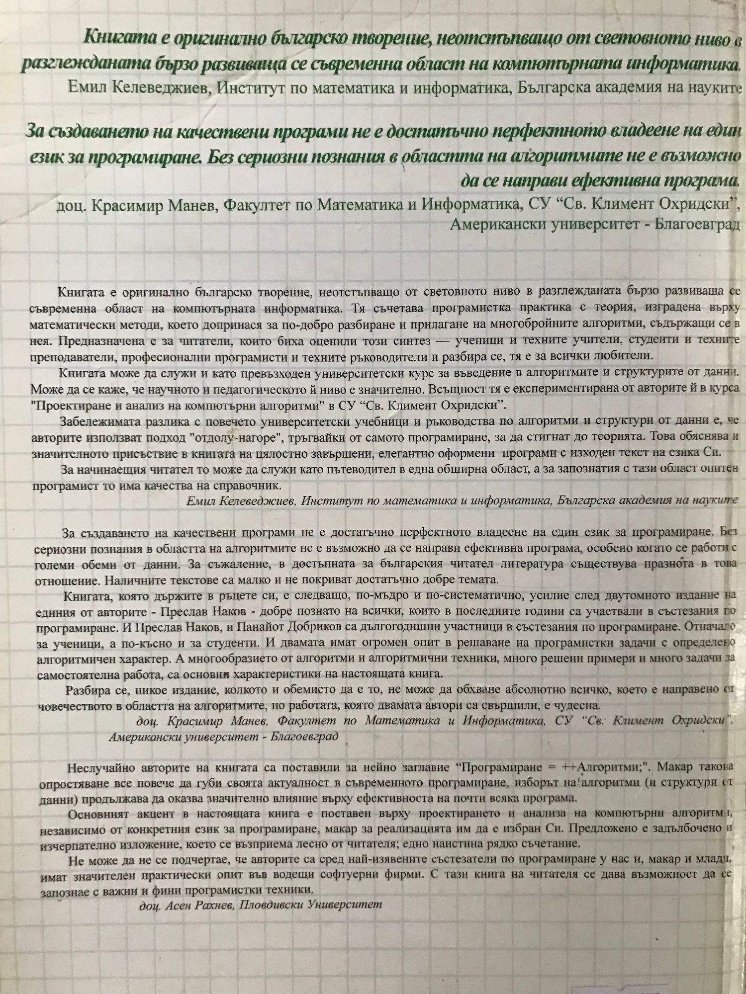 "Книгата е оригинално българско творение, неотстъпващо от световното ниво в разглежданата бързо развиваща се съвременна област на компютърната информатика. Тя съчетава програмистка практика с теория, изградена върху математически методи, което допринася за по-добро разбиране и прилагане на многобройните алгоритми, съдържащи се в нея. Предназначена е за читатели, които биха оценили този синтез - ученици и техните учители, студенти и техните преподаватели, професионални програмисти и техните ръководители и разбира се, тя е за всички любители. Книгата може да служи и като превъзходен университетски курс за въведение в алгоритмите и структурите от данни. Може да се каже, че научното и педагогическото й ниво е значително. Всъщност тя е експериментирана от авторите й в курса "Проектиране и анализ на компютърни алгоритми" в СУ "Св. Климент Охридски". Забележимата разлика с повечето университетски учебници и ръководства по алгоритми и структури от данни е, че авторите използват подход "отдолу-нагоре", тръгвайки от самото програмиране, за да стигнат до теорията. Това обяснява и значителното присъствие в книгата на цялостно завършени, елегантно оформени програми с изходен текст на езика Си. За начинаещия читател то може да служи като пътеводител в една обширна област, а за запознатия с тази област опитен програмист то има качества на справочник."