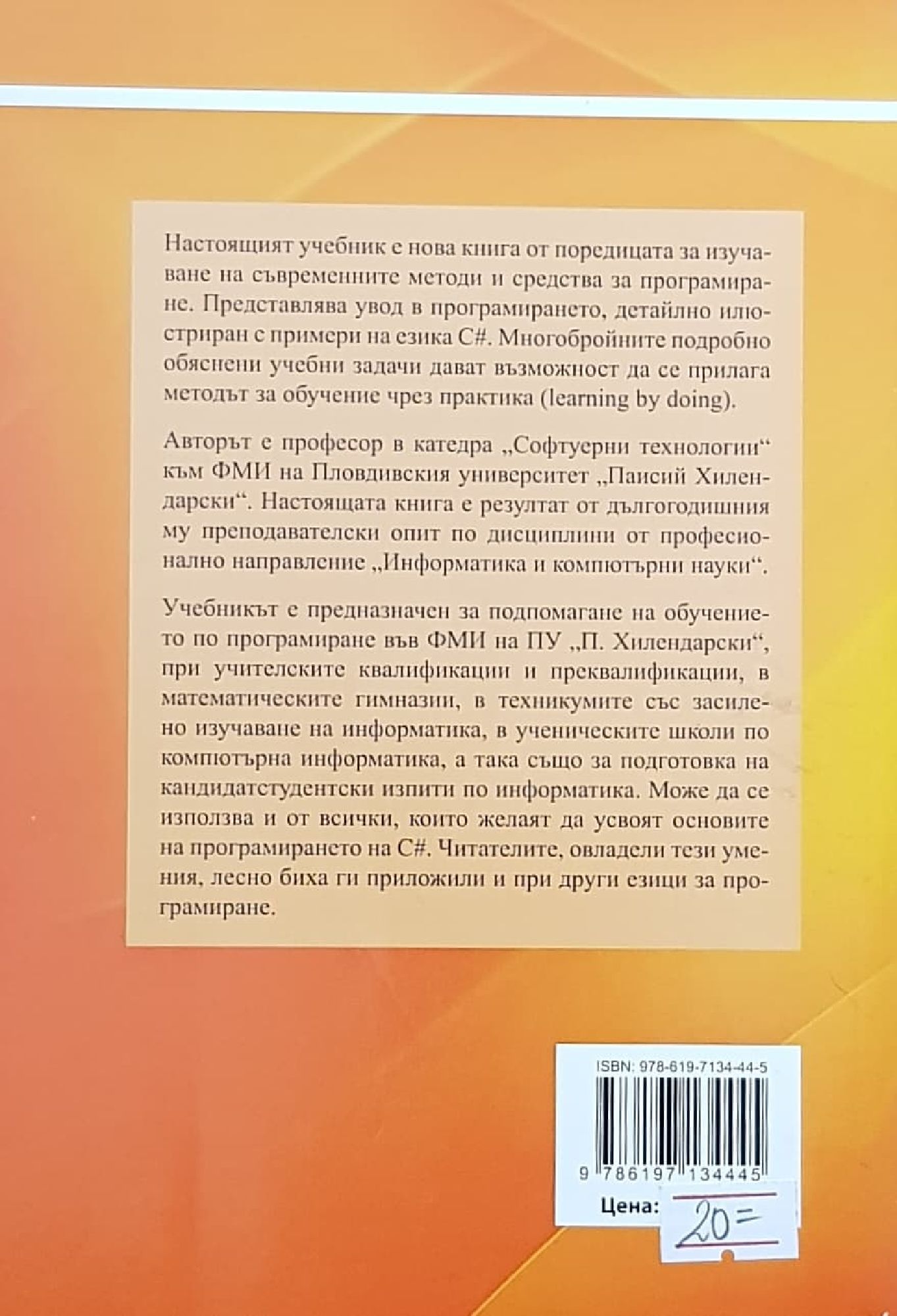 Авторът е професор в катедра „Софтуерни технологии“ към ФМИ на Пловдивския университет „Паисий Хилендарски“. Настоящата книга е резултат от дългогодишния му преподавателски опит по дисциплини от професионално направление „Информатика и компютърни науки“. Учебникът е предназначен за подпомагане на обучението по програмиране във ФМИ на ПУ „П. Хилендарски“, при учителските квалификации и преквалификации, в математическите гимназии, в техникумите със засилено изучаване на информатика, в ученическите школи по компютърна информатика, а така също за подготовка на кандидатстудентски изпити по информатика. Може да се използва и от всички, които желаят да усвоят основите на програмирането на С#. Читателите, овладели тези умения, лесно биха ги приложили и при други езици за програмиране.