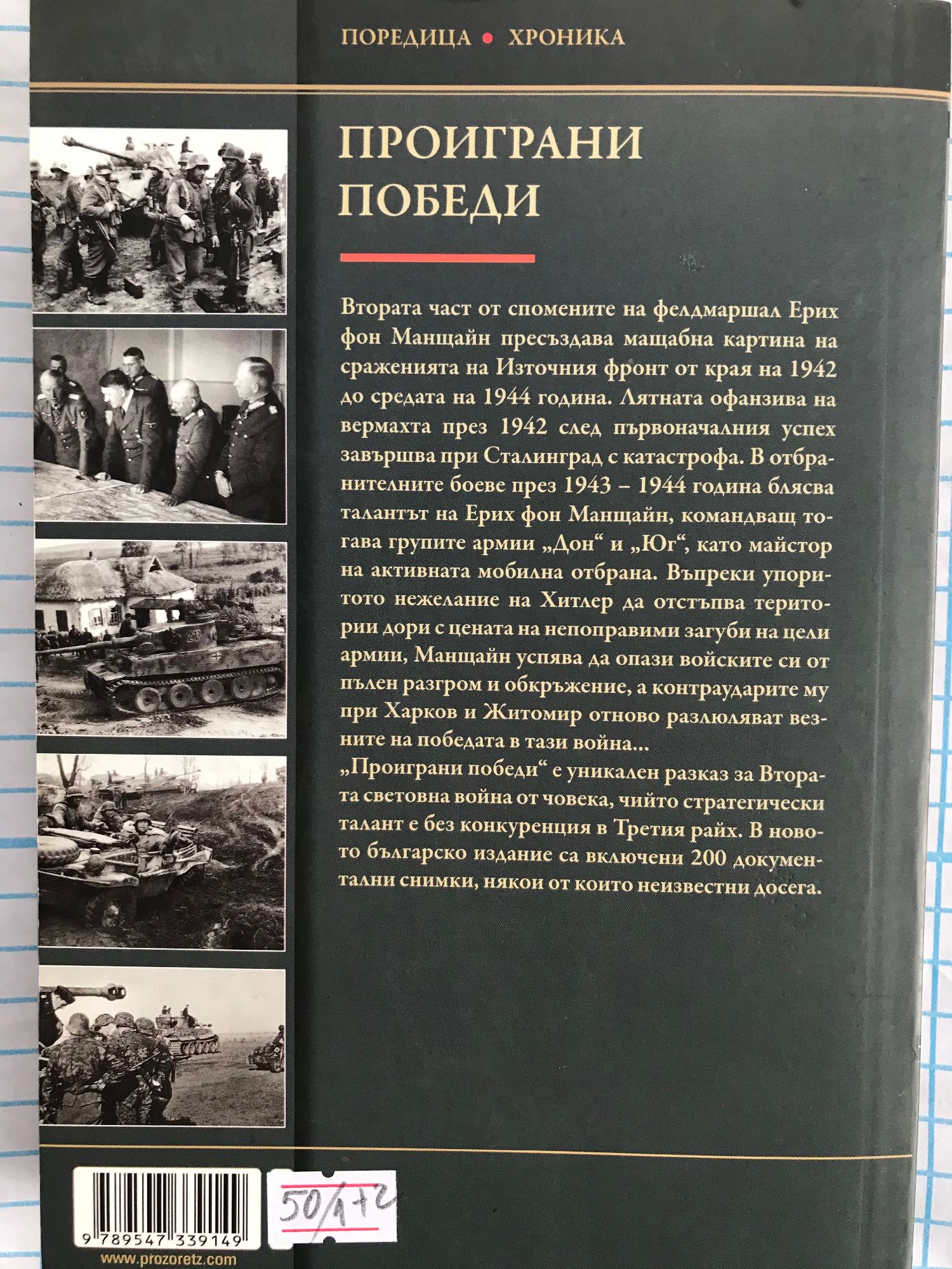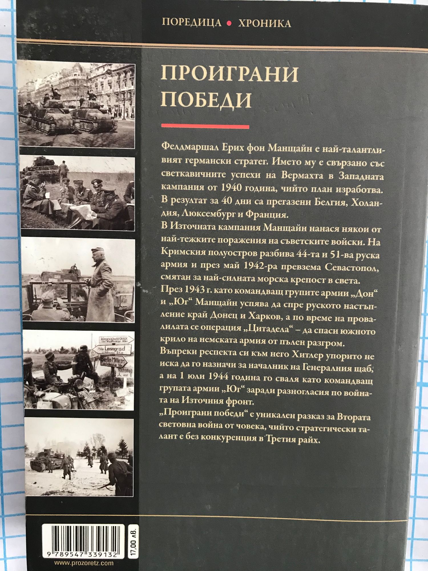 Фелдмаршал Ерих фон Манщайн е най-талантливият германски стратег. Името му е свързано със светкавичните успехи на Вермахта в Западната кампания на 1940 година, чийто план изработва. В резултат на 40 дни са прегазени Белгия, Холандия, Люксембург и Франция. В Източната кампания Манщайн нанася някои от най-тежките поражения на съветските войски. На Кримския полуостров разбива 44-а и 51-а руска армия и през май 1942-а превзема Севастопол, смятан за най-силната морска крепост в света. През 1943 г. като командващ групите армии "Дон" и "Юг" Манщайн успява да спре руското настъпление край Донец и Харков, а по време на провалите на операция "Цитадела" – да спаси южното крило на немската армия от пълен разгром. Въпреки респекта си към него Хитлер упорито не иска да го назначи за началник на Генералния щаб, а на 1 юли 1944 година го сваля като командващ групата армии "Юг" заради разногласия по войната на Източния фронт. "Проиграни победи" е уникален разказ за Втората световна война от човека, чийто стратегически талант е без конкуренция в Третия райх. Втората част от спомените на фелдмаршал Ерих фон Манщайн пресъздава мащабна картина на сраженията на Източния фронт от края на 1942 до средата на 1944 година. Лятната офанзива на вермахта през 1942 след първоначалния успех завършва при Сталинград с катастрофа. В отбранителните боеве през 1943 - 1944 година блясва талантът на Ерих фон Манщайн, командващ тогава групите армии "Дон" и "Юг", като майстор на активната мобилна отбрана. Въпреки упоритото нежелание на Хитлер да отстъпва територии дори с цената на непоправими загуби на цели армии, Манщайн успява да опази войските си от пълен разгром и обкръжение, а контраударите му при Харков и Житомир отново разлюляват везните на победата в тази война... "Проиграни победи" е уникален разказ за Втората световна война от човека, чийто стратегически талант е без конкуренция в Третия райх. В новото българско издание са включени 200 документални снимки, някои от които неизвестни досега.