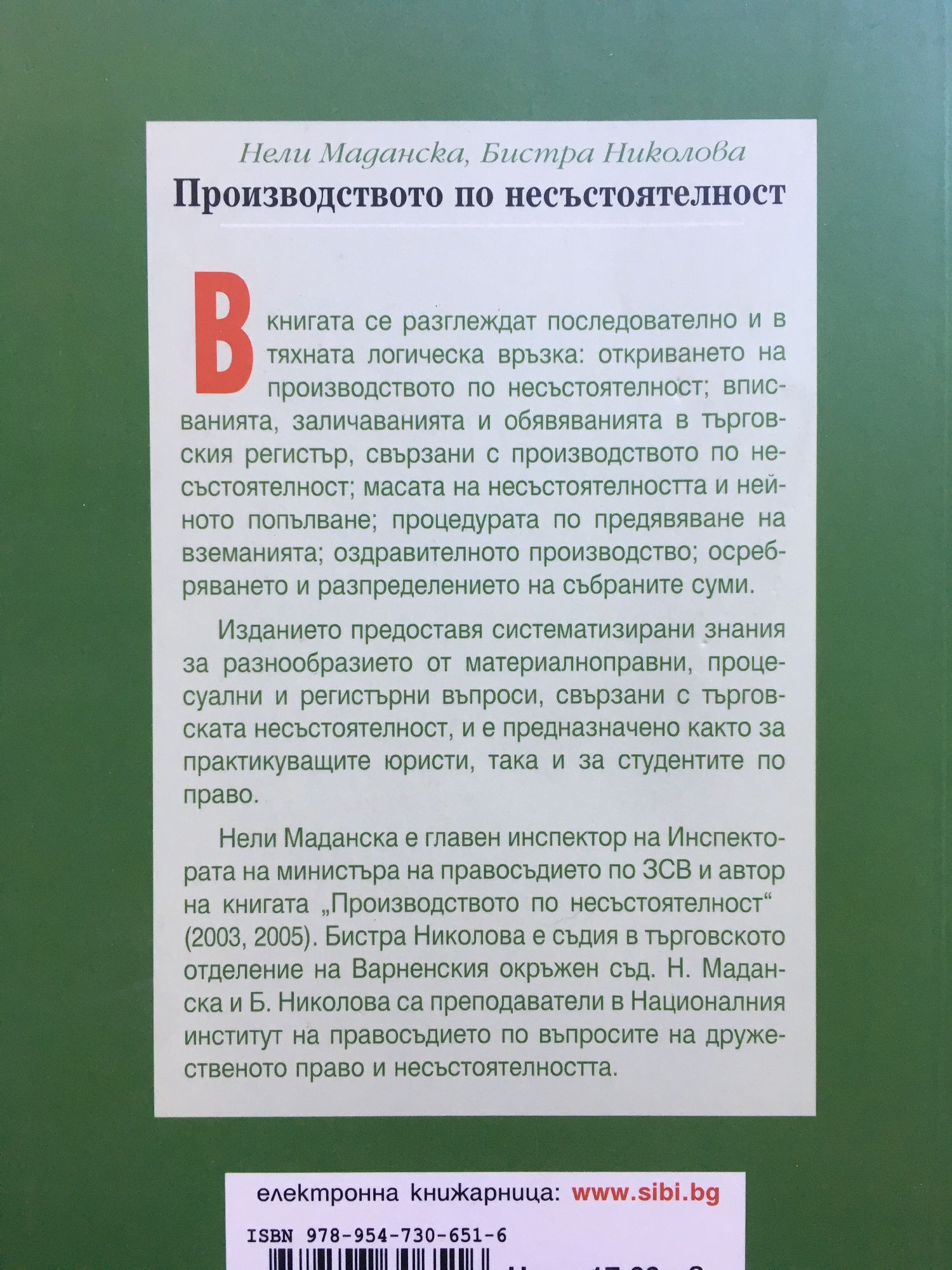 В книгата се разглеждат последователно и в тяхната логическа връзка: откриването на производството по несъстоятелност; вписванията, заличаванията и обявяванията в търговския регистър, свързани с производството по несъстоятелност; масата на несъстоятелността и нейното попълване; процедурата по предявяване на вземанията; оздравителното производство; осребряването и разпределението на събраните суми. Изданието предоставя систематизирани знания за разнообразието от материалноправни, процесуални и регистърни въпроси, свързани с търговската несъстоятелност, и е предназначено както за практикуващите юристи, така и за студентите по право. Нели Маданска е главен инспектор на Инспектората на министъра на правосъдието по ЗСВ и автор на книгата „Производството по несъстоятелност” (2003, 2005). Бистра Николова е съдия в търговското отделение на Варненския окръжен съд. Н. Маданска и Б. Николова са преподаватели в Националния институт на правосъдието по въпросите на дружественото право и несъстоятелността.