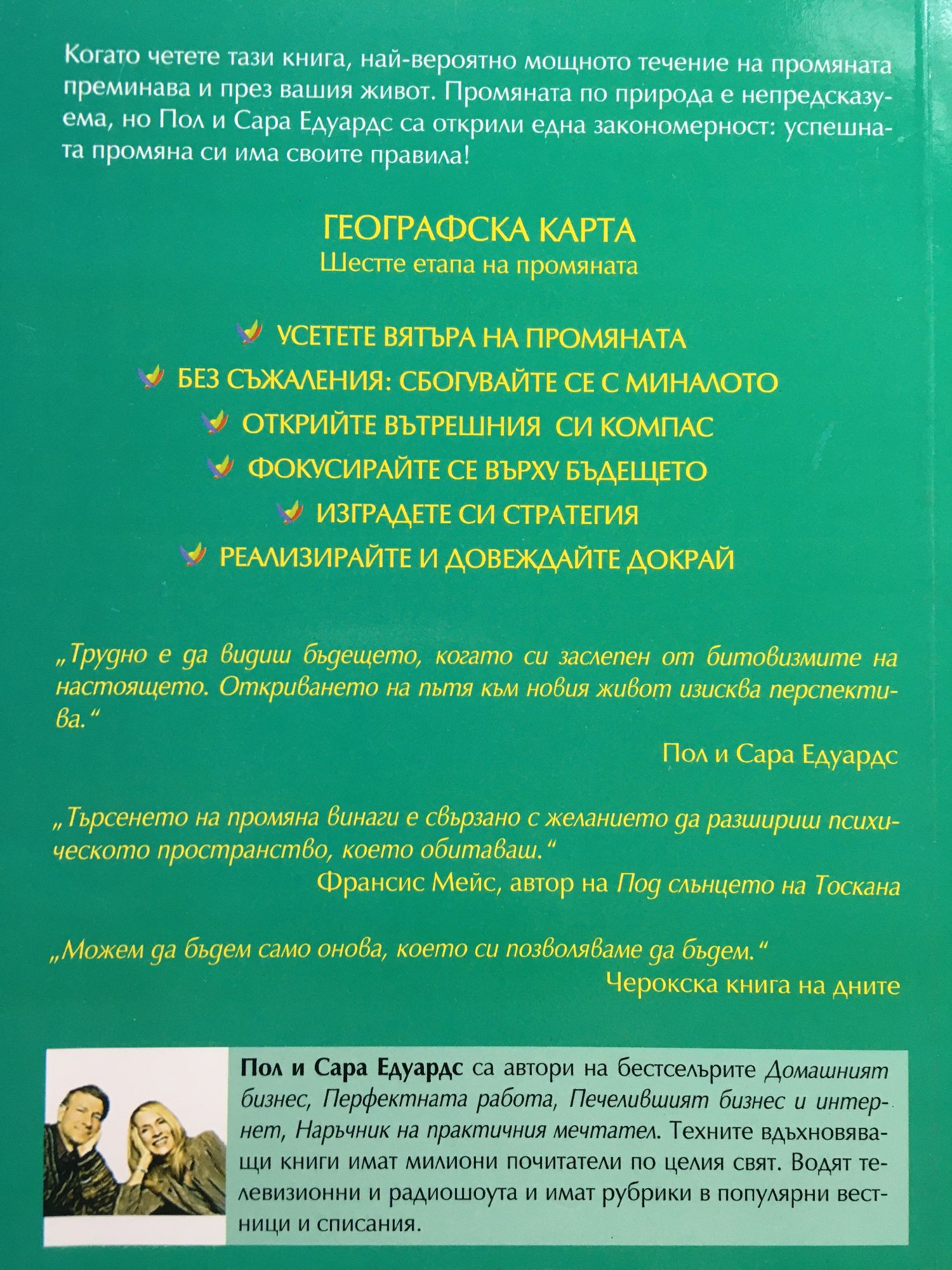 Когато четете тази книга, най-вероятно мощното течение на промяната преминава и през вашия живот. Промяната по природа е непредсказуема, но Пол и Сара Едуардс са открили една закономерност: успешната промяна си има своите правила! Шестте етапа на промяната - УСЕТЕТЕ ВЯТЪРА НА ПРОМЯНАТА - БЕЗ СЪЖАЛЕНИЯ: СБОГУВАЙТЕ СЕ С МИНАЛОТО - ОТКРИЙТЕ ВЪТРЕШНИЯ СИ КОМПАС - ФОКУСИРАЙТЕ СЕ ВЪРХУ БЪДЕЩЕТО - ИЗГРАДЕТЕ СИ СТРАТЕГИЯ - РЕАЛИЗИРАЙТЕ И ДОВЕЖДАЙТЕ НЕЩАТА ДОКРАЙ "Трудно е да видиш бъдещето, когато си заслепен от битовизмите на настоящето. Откриването на пътя към новия живот изисква перспектива." Пол и Сара Едуардс " Търсенето на промяна винаги е свързано с желанието да разшириш психическото пространство, което обитаваш." Франсис Мейс, автор на Под слънцето на Тоскана "Можем да бъдем само онова, което си позволяваме да бъдем." Черокска книга на дните