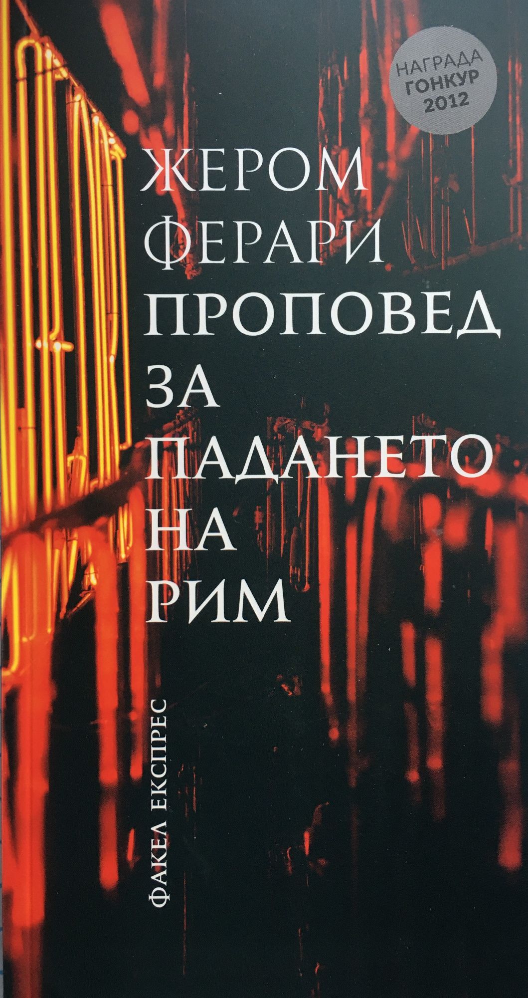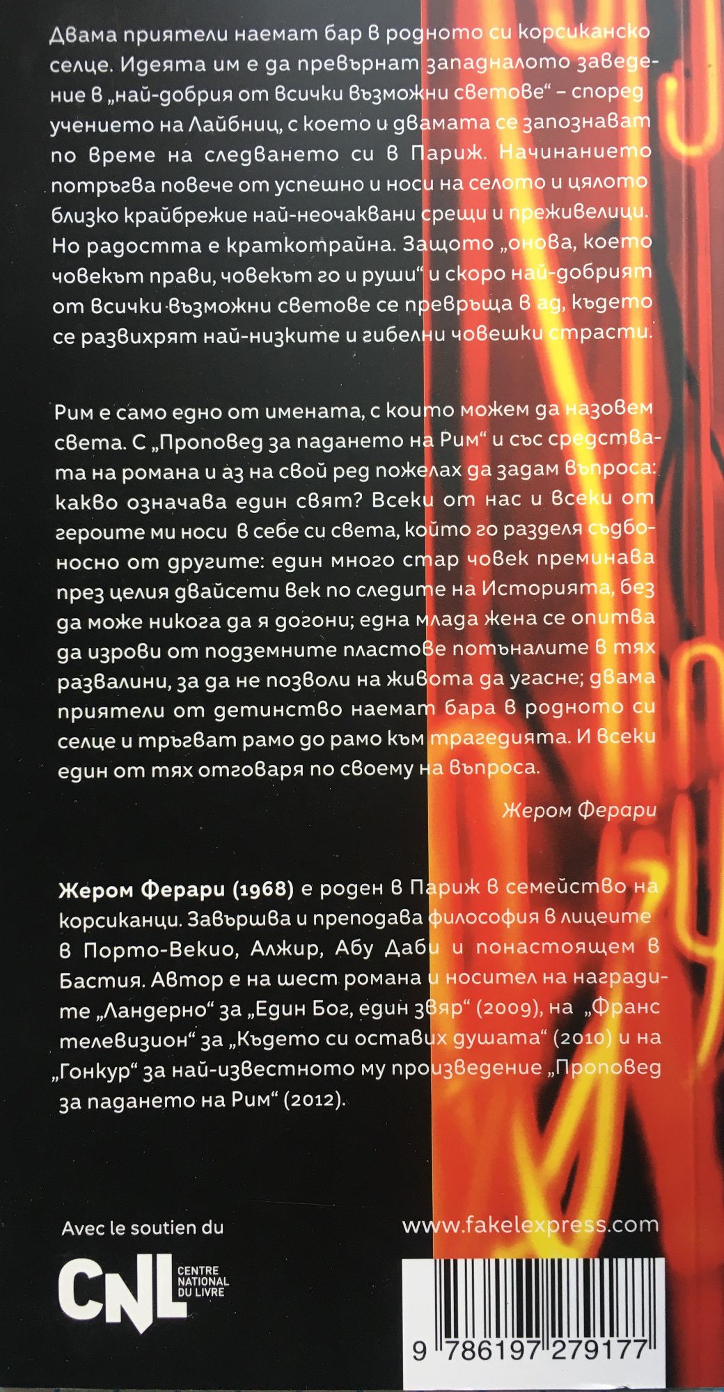 Двама приятели наемат бар в родното си корсиканско селце. Идеята им е да превърнат западналото заведение в „най-добрия от всички възможни светове" - според учението на Лайбниц, с което и двамата се запознават по време на следването си в Париж. Начинанието потръгва повече от успешно и носи на селото и цялото близко крайбрежие най-неочаквани срещи и преживелици. Но радостта е краткотрайна. Защото „онова, което човекът прави, човекът го и руши" и скоро най-добрият от всички възможни светове се превръща в ад, където се развихрят най-низките и гибелни човешки страсти. Рим е само едно от имената, с които можем да назовем света. С „Проповед за падането на Рим" и със средствата на романа и аз на свой ред пожелах да задам въпроса: какво означава един свят? Всеки от нас и всеки от героите ми носи в себе си света, който го разделя съдбоносно от другите: един много стар човек преминава през целия двайсети век по следите на Историята, без да може никога да я догони; една млада жена се опитва да изрови от подземните пластове потъналите в тях развалини, за да не позволи на живота да угасне; двама приятели от детинство наемат бара в родното си селце и тръгват рамо до рамо към трагедията. И всеки един от тях отговаря по своему на въпроса. Жером Ферари *** Жером Ферари (1968) е роден в Париж в семейство на корсиканци. Завършва и преподава философия в лицеите в Порто-Векио, Алжир, Абу Даби и понастоящем в Бастия. Автор е на шест романа и носител на наградите „Ландерно" за „Един Бог, един звяр" (2009), на „Франс телевизион" за „Където си оставих душата" (2010) и на "Гонкур" за най-известното му произведение „Проповед за падането на Рим" (2012).