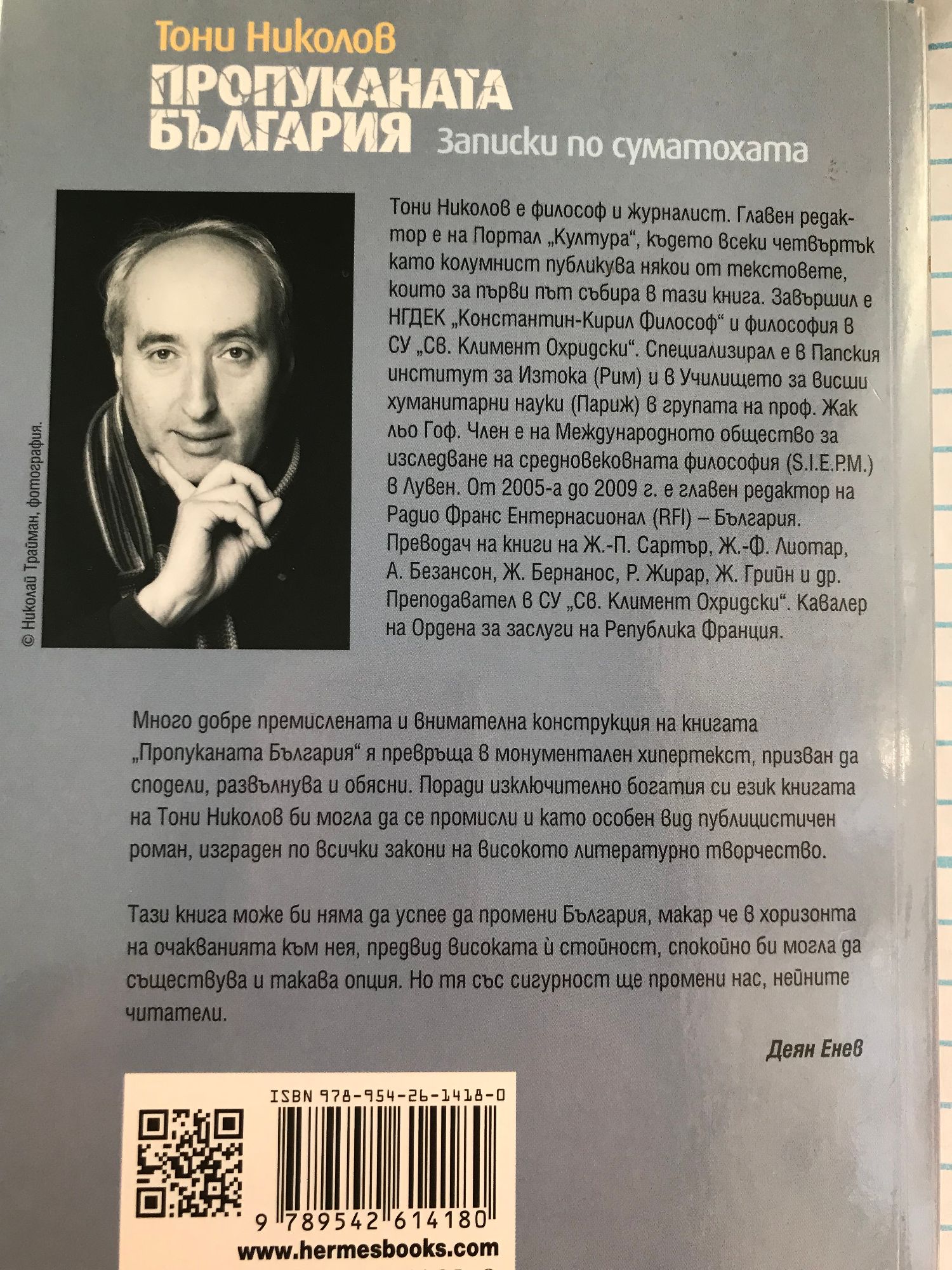 "Тони Николов е философ и журналист. Главен редактор е на Портал "Култура", където всеки четвъртък като колумнист публикува някои от текстовете, които за първи път събира в тази книга. Завършил е НГДЕК "Константин-Кирил Философ" и философия в СУ "Св. Климент Охридски". Специализирал е в Папския институт за Изтока (Рим) и в Училището за висши хуманитарни науки (Париж) в групата на проф. Жак льо Гоф. Член е на Международното общество за изследване на средновековната философия (S.I.E.P.M.) в Лувен. От 2005-а до 2009 г. е главен редактор на Радио Франс Ентернасионал (RFI) – България. Преводач на книги на Ж.-П. Сартър, Ж.-Ф. Лиотар, А. Безансон, Ж. Бернанос, Р. Жирар, Ж. Грийн и др. Преподавател в СУ "Св. Климент Охридски". Кавалер на Ордена за заслуги на Република Франция. Много добре премислената и внимателна конструкция на книгата "Пропуканата България" я превръща в монументален хипертекст, призван да сподели, развълнува и обясни. Поради изключително богатия си език книгата на Тони Николов би могла да се промисли и като особен вид публицистичен роман, изграден по всички закони на високото литературно творчество. Тази книга може би няма да успее да промени България, макар че в хоризонта на очакванията към нея, предвид високата ѝ стойност, спокойно би могла да съществува и такава опция. Но тя със сигурност ще промени нас, нейните читатели." Деян Енев