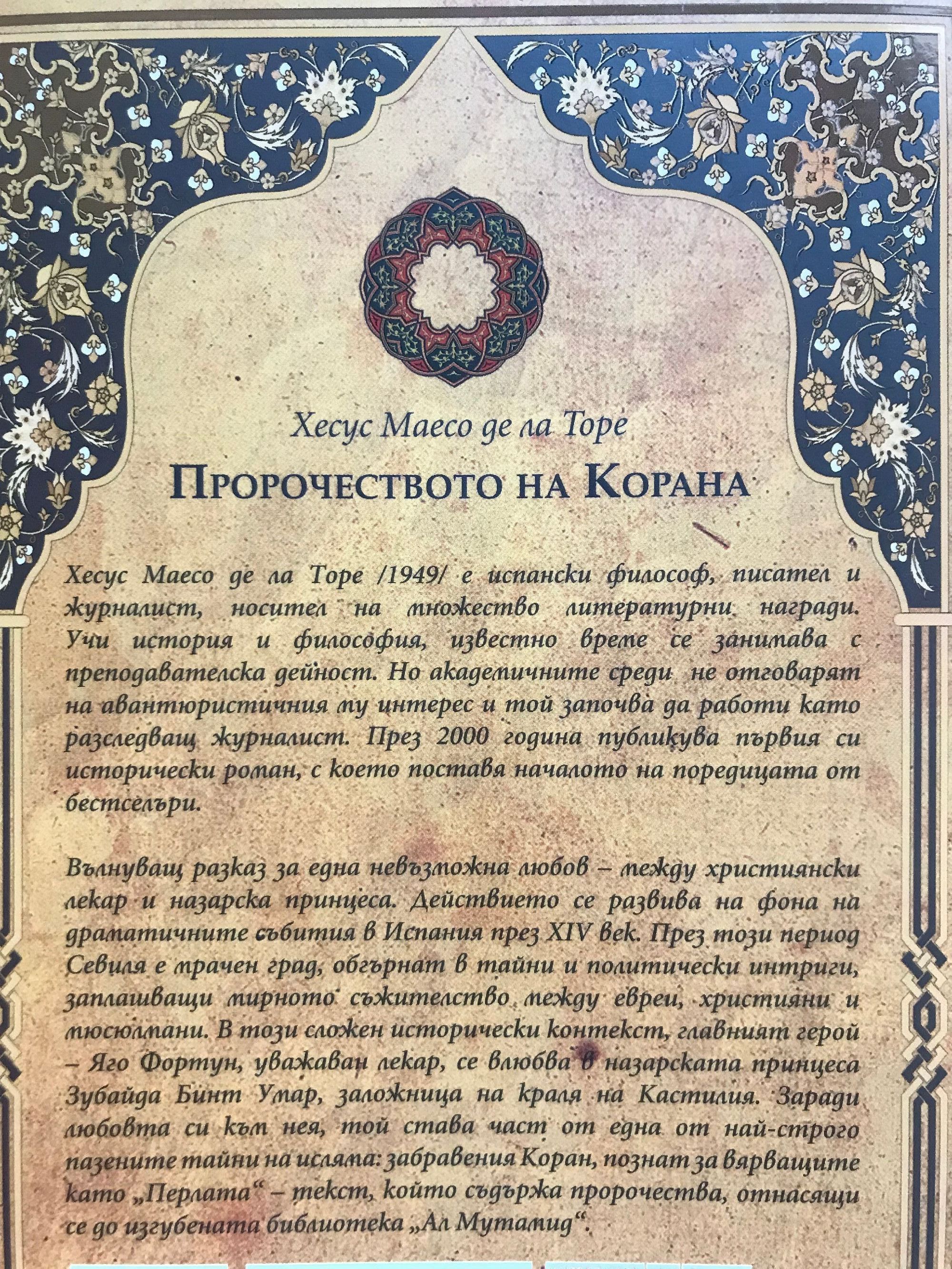 Хесус Маесо де ла Торе /1949/ е испански философ, писател и журналист, носител на множество литературни награди. Учи история и философия, известно време се занимава с преподавателска дейност. Но академичните среди не отговарят на авантюристичния му интерес и той започва да работи като разследващ журналист. През 2000 година публикува първия си исторически роман, с което поставя началото на поредицата от бестселъри. Вълнуващ разказ за една невъзможна любов - между християнски лекар и назарска принцеса. Действието се развива на фона на драматичните събития в Испания през XIV век. През този период, Севиля е мрачен град, обгърнат в тайни и политически интриги, заплашващи мирното съжителство между евреи, християни и мюсюлмани. В този сложен исторически контекст, главният герой - Яго Фортун, уважаван лекар, се влюбва в назарската принцеса Зубайда Бинт Умар, заложница на краля на Кастилия. Заради любовта си към нея, той става част от една от най-строго пазените тайни на исляма: забравения Коран, познат за вярващите като "Перлата" - текст, който съдържа пророчества, отнасящи се до изгубената библиотека "Ал Мутамид".