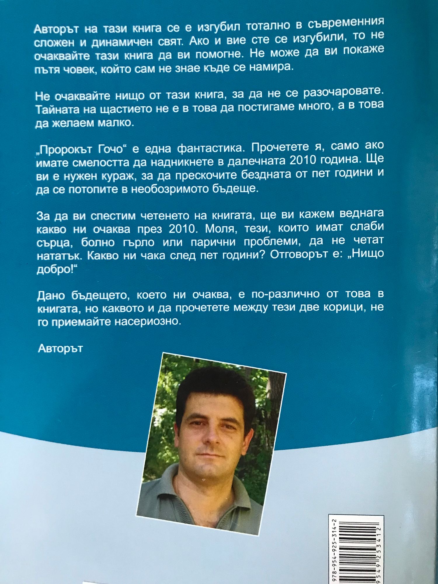 Авторът на тази книга се е изгубил тотално в съвременния сложен и динамичен свят. Ако и вие сте се изгубили, то не очаквайте тази книга да ви помогне. Не може да ви покаже пътя човек, който сам не знае къде се намира. Не очаквайте нищо от тази книга, за да не се разочаровате. Тайната на щастието не е в това да постигаме много, а в това да желаем малко. „Пророкът Гочо" е една фантастика. Прочетете я, само ако имате смелостта да надникнете в далечната 2010 година. Ще ви е нужен кураж, за да прескочите бездната от пет години и да се потопите в необозримото бъдеще. За да ви спестим четенето на книгата, ще ви кажем веднага какво ни очаква през 2010. Моля, тези, които имат слаби сърца, болно гърло или парични проблеми, да не четат нататък. Какво ни чака след пет години? Отговорът е: „Нищо добро!" Дано бъдещето, което ни очаква, е по-различно от това в книгата, но каквото и да прочетете между тези две корици, не го приемайте насериозно. - Авторът