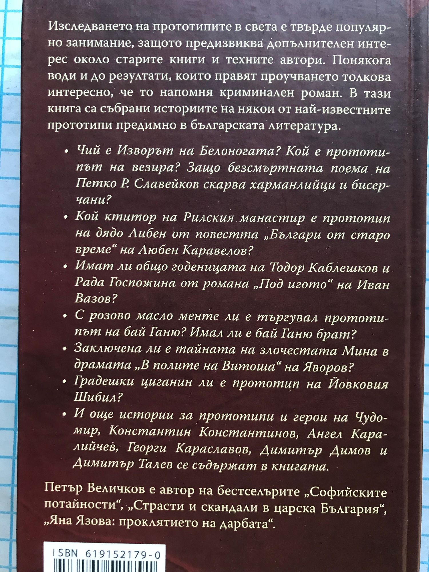 Изследването на прототипите в света е твърде популярно занимание, защото предизвиква допълнителен интерес около старите книги и техните автори. Понякога води и до резултати, които правят проучването толкова интересно, че то напомня криминален роман. В тази книга са събрани историите на някои от най-известните прототипи предимно в българската литература. Чий е "Изворът на Белоногата"? Кой е прототипът на везира? Защо безсмъртната поема на Петко Р. Славейков скарва харманлийци и бисерчани? Кой ктитор на Рилския манастир е прототип на дядо Либен от повестта "Българи от старо време" на Любен Каравелов? Имат ли общо годеницата на Тодор Каблешков и Рада Госпожина от романа "Под игото" на Иван Вазов? С розово масло менте ли е търгувал прототипът на Бай Ганю? Имал ли е бай Ганю брат? Заключена ли е тайната на злочестата Мина в драмата "В полите на Витоша" на Яворов? Градешки циганин ли е прототип на Йовковия Шибил? И още истории за прототипи и герои на Чудомир, Константин Константинов, Ангел Каралийчев, Георги Караславов, Димитър Димов и Димитър Талев се съдържат в книгата.