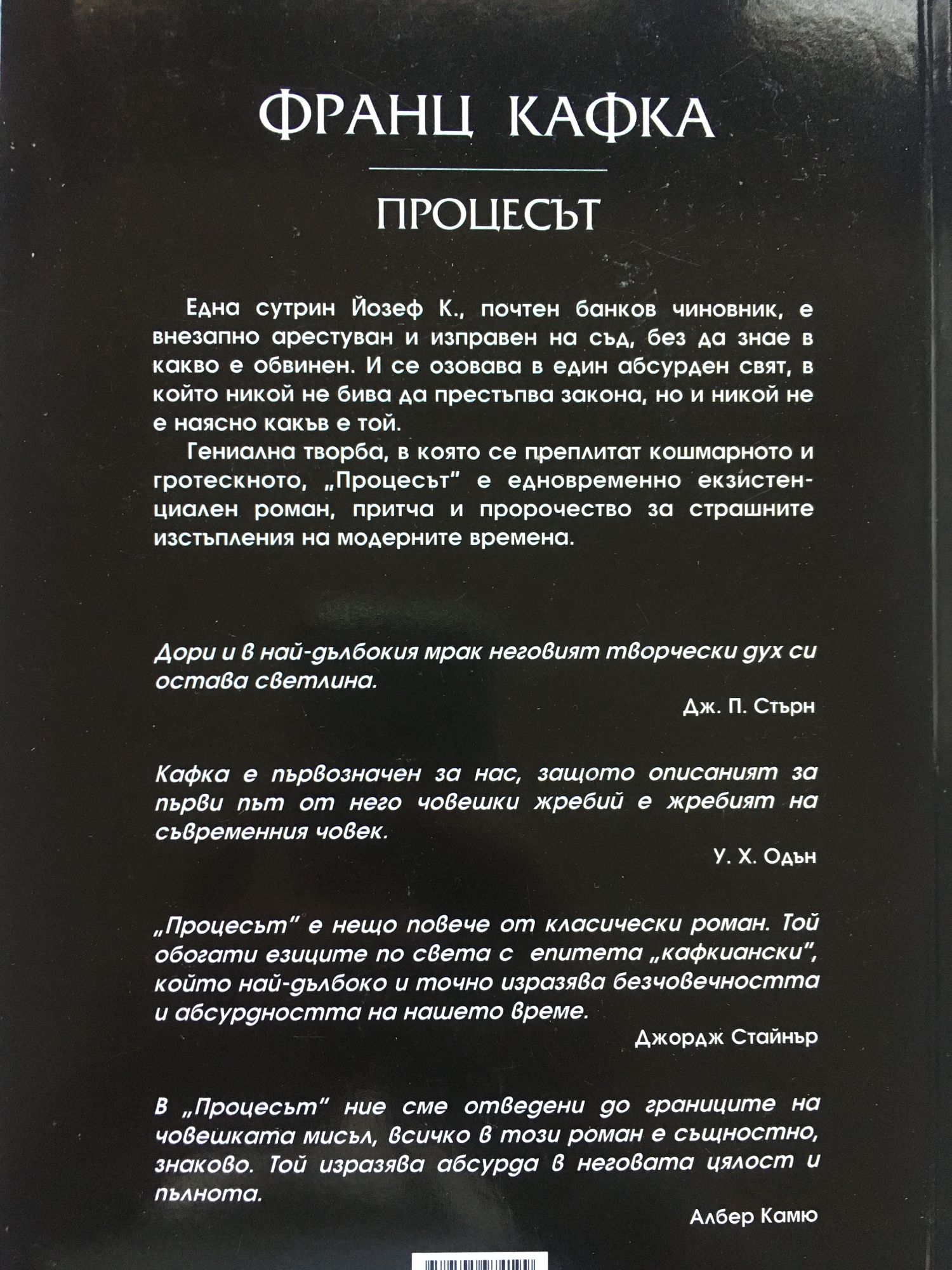 Една сутрин Йозеф К., почтен банков чиновник, е внезапно арестуван и изправен на съд, без да знае в какво е обвинен. И се озовава в един абсурден свят, в който никой не бива да престъпва закона, но и никой не е наясно какъв е той. Гениална творба, е която се преплитат кошмарното и гротескното, “Процесът" е едновременно екзистенциален роман, притча и пророчество за страшните изстъпления на модерните времена. Дори и в най-дълбокия мрак неговият творчески дух си остава светлина. Дж.П.Стърн Кафка е първозначен за нас, защото описаният за първи път от него човешки жребий е жребият на съвременния човек. У. Х Одьн Процесът е нещо повече от класически роман. Той обогати езиците по света с епитета “кафкиански", който най-дълбоко и точно изразява безчовечността и абсурдността на нашето време. Джордж Стайнър В “Процесът" ние сме отведени до границите на човешката мисъл, всичко в този роман е същностно, знаково. Той изразява абсурда в неговата цялост и пълнота. Албер Камю