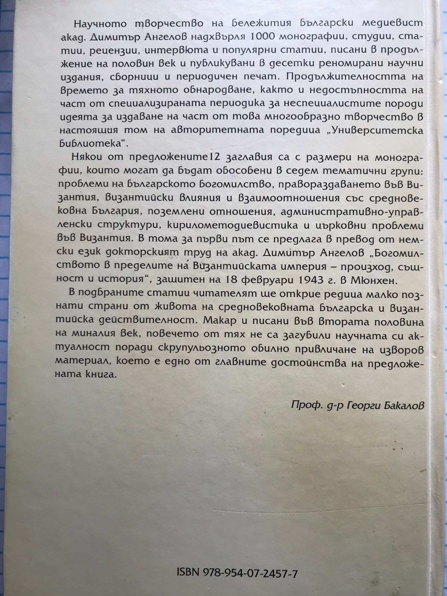 Научното творчество на бележития български медиевист акад. Димитър Ангелов надхвърля 1000 монографии, студии, статии, рецензии, интервюта и популярни статии, писани в продължение на половин век и публикувани в десетки реномирани научни издания, сборници и периодичен печат. Продължителността на времето за тяхното обнародване, както и недостъпността на част от специализираната периодика за неспециалистите породи идеята за издаване на част от това многообразно творчество в настоящия том на авторитетната поредица "Университетска библиотека". Някои от предложените 12 заглавия са с размери на монографии, които могат да бъдат обособени в седем тематични групи: проблеми на българското богомилство, правораздаването във Византия, византийски влияния и взаимоотношения със средновековна България, поземлени отношения, административно-управленски структури, кирилометодиевистика и църковни проблеми във Византия. В тома за първи път се предлага в превод от немски език докторският труд на акад. Димитър Ангелов "Богомилството в пределите на Византийската империя - произход, същност и история", защитен на 18 февруари 1943 г. в Мюнхен. В подбраните статии читателят ще открие редица малко познати страни от живота на средновековната българска и византийска действителност. Макар и писани във втората половина на миналия век, повечето от тях не са загубили научната си актуалност поради скрупульозното обилно привличане на изворов материал, което е едно от главните достойнства на предложената книга. Проф. д-р Георги Бакалов