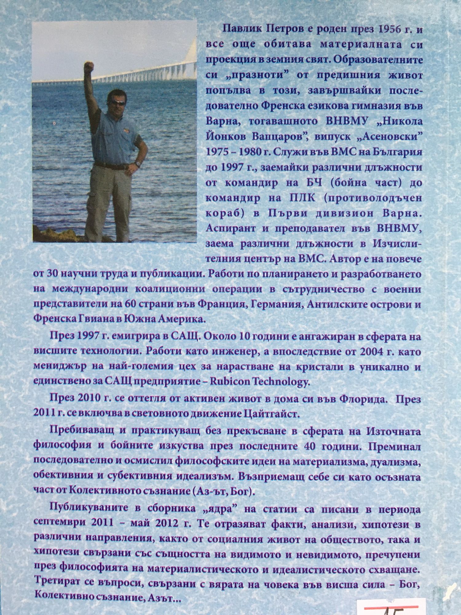 Павлик Петров е роден през 1956 г. и все още обитава материалната си проекция в земния свят. През 1997 г. емигрира в САЩ. Около 10 години е ангажиран в сферата на висшите технологии. Работи като инженер. През 2010 г. се оттегля от активен живот в дома си във Флорида, а през 2011 г. се включва в световното движение Цайтгайст. Пребиваващ и практикуващ без прекъсване в сферата на Източната философия и бойните изкуства през последните 40 години. Преминал последователно и осмислил философските идеи на материализма, дуализма, обективния и субективния идеализъм. Възприемащ себе си като осъзната част от Колективното съзнание /Аз-ът, Бог/. Публикуваните в сборника "ядра" на статии са писани в периода септември 2011 - май 2012 г. Те отразяват факти, анализи, хипотези и различни направления, както от социалния живот на обществото, така и хипотези, свързани със същността на видимото и невидимото, пречупени през философията на материалистическото и идеалистическото схващане. Третират се въпроси, свързани с вярата на човека във висша сила - Бог, Колективно съзнание, Азът...