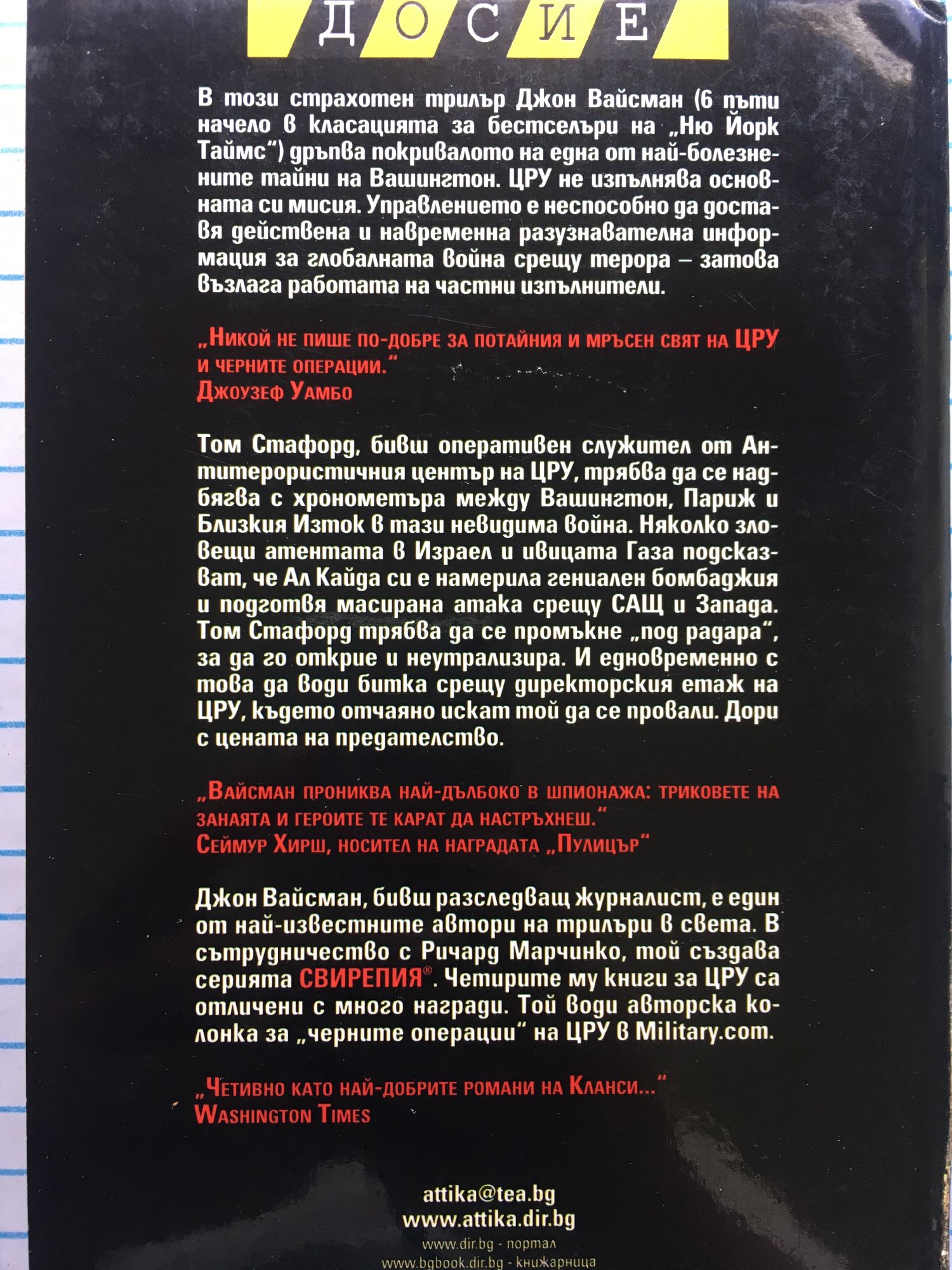 В този страхотен трилър Вайсман (6 пъти начело в класацията за бестселъри на NY Times.) дръпва покривалото на една от най-болезнените тайни на Вашингтон. ЦРУ не изпълнява основната си мисия. Управлението е неспособно да доставя действена разузнавателна информация за глобалната война срещу терора – затова възлага работата на частни изпълнители. Том Стафорд, бивш оперативен служител от Антитерористичния център на ЦРУ, трябва да се надбягва с хронометъра между Вашингтон, Париж и Близкия Изток в тази невидима война. Няколко зловещи атентата в Израел и ивицата Газа подсказват, че Ал Кайда си е намерила гениален бомбаджия и подготвя масирана атака срещу САЩ и Запада. Том Стафорд трябва да се промъкне „под радара", за да го открие и неутрализира. И едновременно с това да води скрита битка срещу директорския етаж на ЦРУ, където отчаяно искат той да се провали. Дори с цената на предателство.