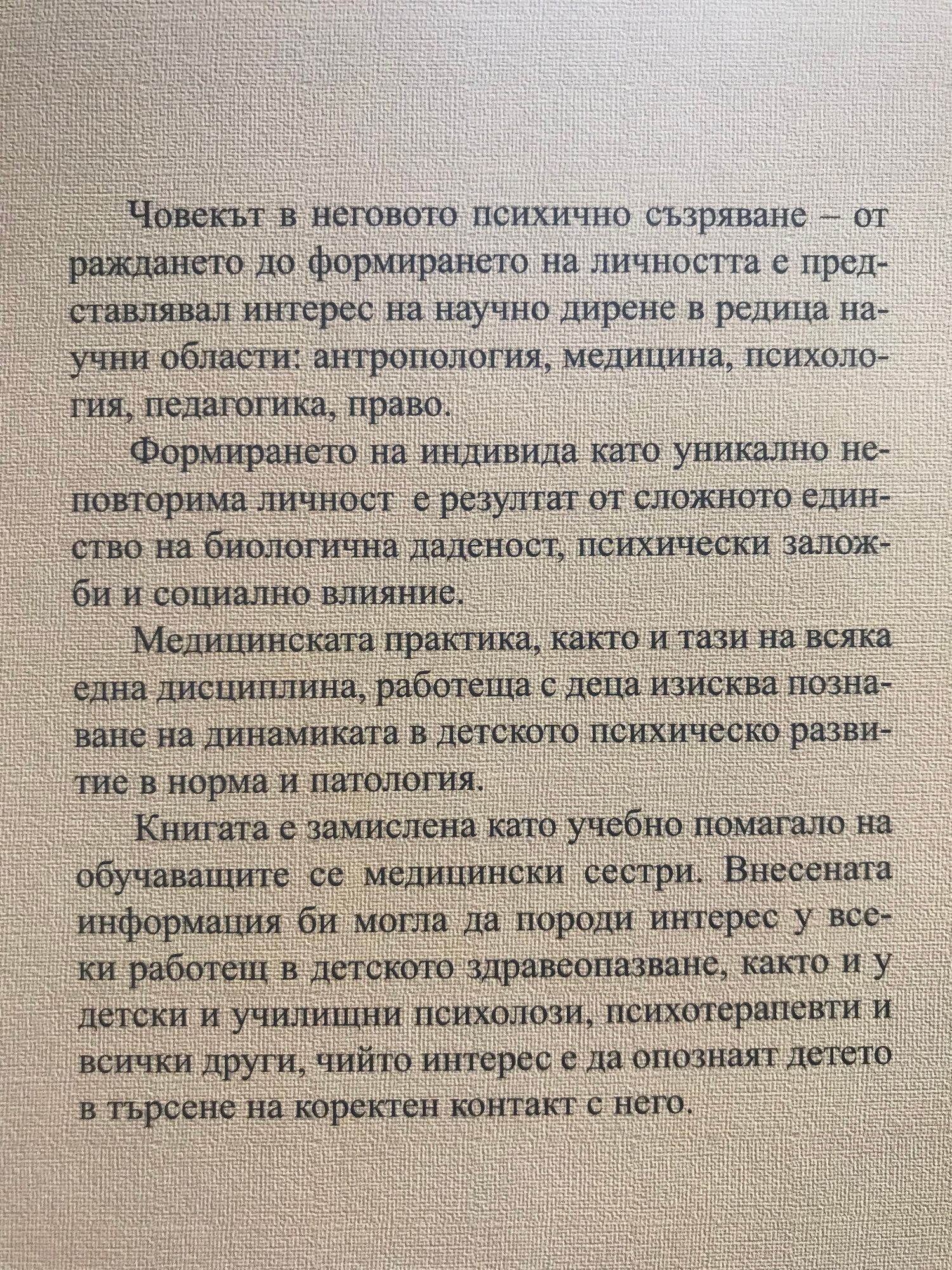 Човекът в неговото психично съзряване - от раждането до формирането на личността е представлявал интерес на научно дирене в редица научни области: антропология, медицина, психология, педагогика, право. Формирането на индивида като уникално неповторима личност е резултат от сложното единство на биологична даденост, психически заложби и социално влияние. Медицинската практика, както и тази на всяка една дисциплина, работеща с деца изисква познаване на динамиката в детското психическо развитие в норма и патология. Книгата е замислена като учебно помагало на обучаващите се медицински сестри. Внесената информация би могла да породи интерес у всеки работещ в детското здравеопазване, както и у детски и училищни психолози, психотерапевти и всички други, чийто интерес е да опознаят детето в търсене на конкретен контакт с него.