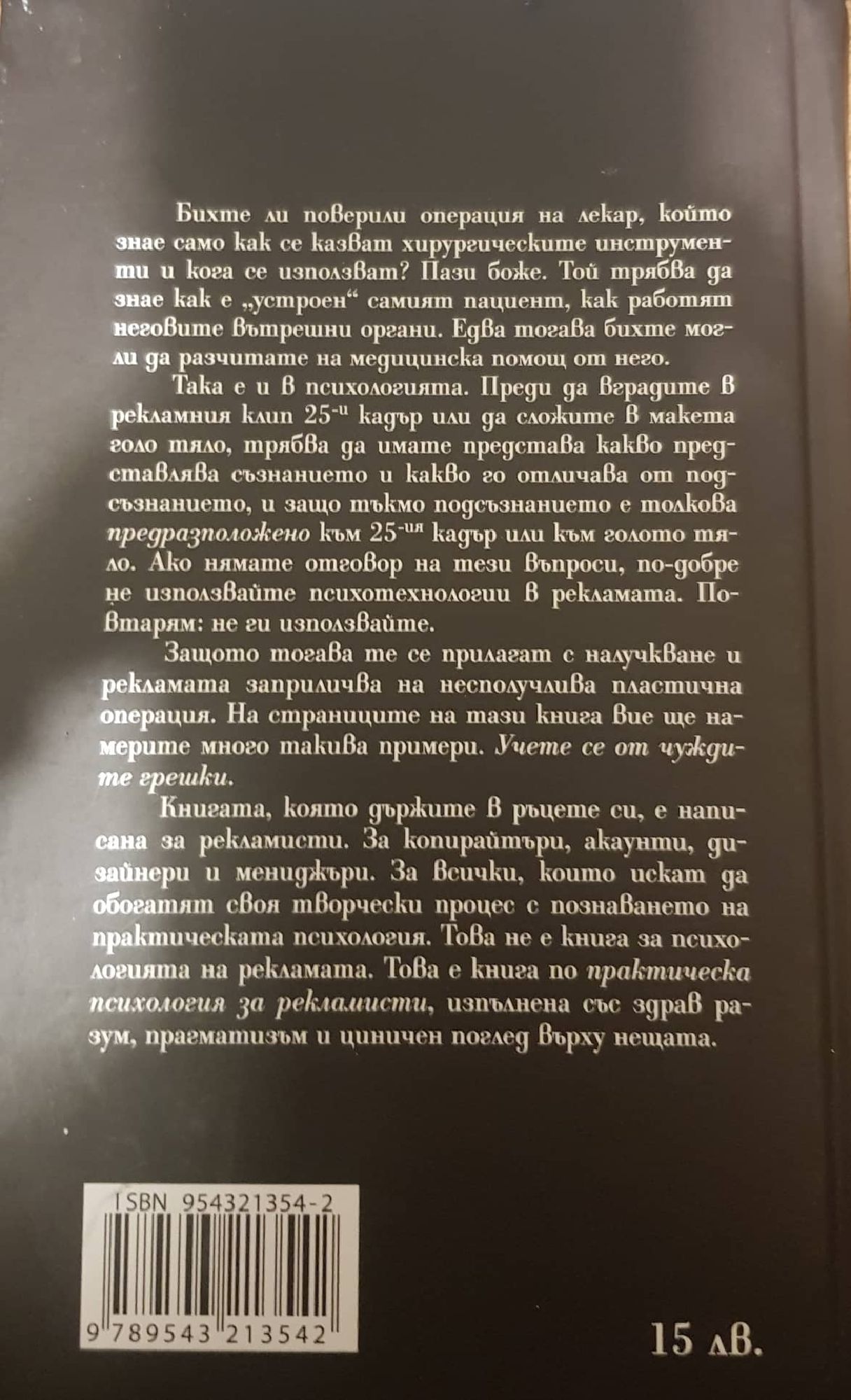 Ще цитирам Вит: „Това не е книга за психологията на рекламата. Това е книга по практическа психология за рекламисти, изпълнена със здрав разум, прагматизъм и циничен поглед върху нещата.“ Авторът е дипломиран психолог, рекламист, писател, университетски преподавател и един от пионерите на руския интернет. Потребителите не се интересуват от вас, те са претрупани с информация и учудващо устойчиви към вашите послания, вие сте тези, които трябва да се създадете реклама, която да създаде емоционална привързаност и да отличи вашите продукти по разумен и смислен начин. Прост, ясен език, жив и образен стил, кристално чиста мисъл, желязна аргументация. Много примери от практиката, илюстриращи основните постановки. Докато я четох, на моменти се чувствах като второкласник, който знае, че хората се женят, а сега разбира как и защо става това. В други ми се приискваше да започна ожесточен спор с автора. Това едно от най-ценните качества на книгата - провокира те да мислиш и дава още няколко гледни точки. И накрая. Фамилията на автора. Да, Вит Ценьов има български корен. Александър Христов