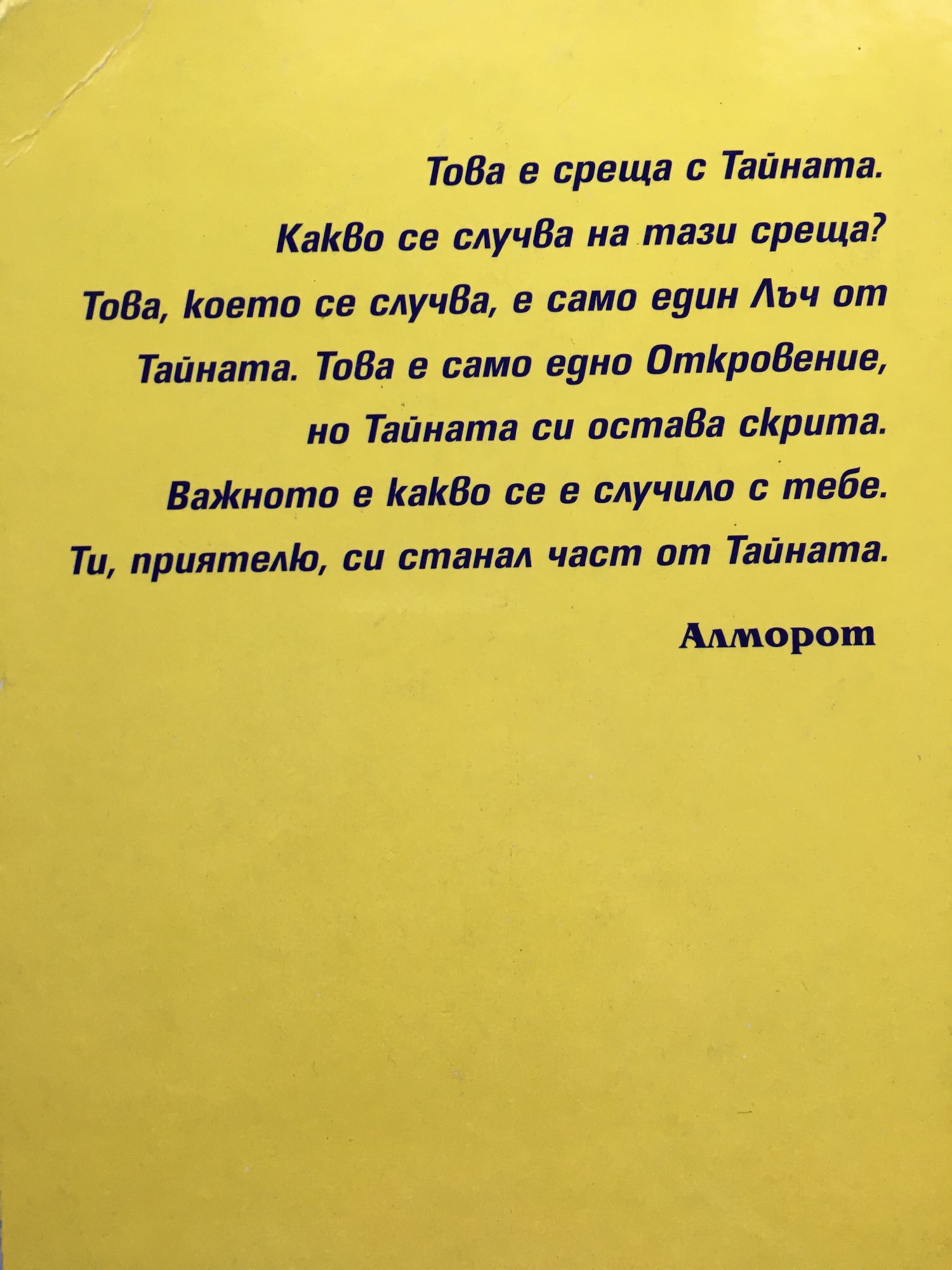Това е среща с Тайната. Какво се случва на тази среща? Това, което се случва е само един Лъч от Тайната. Това е само едно Откровение, но Тайната си остава скрита. Важното е какво се е случило с тебе. Ти, приятелю, си станал част от Тайната.