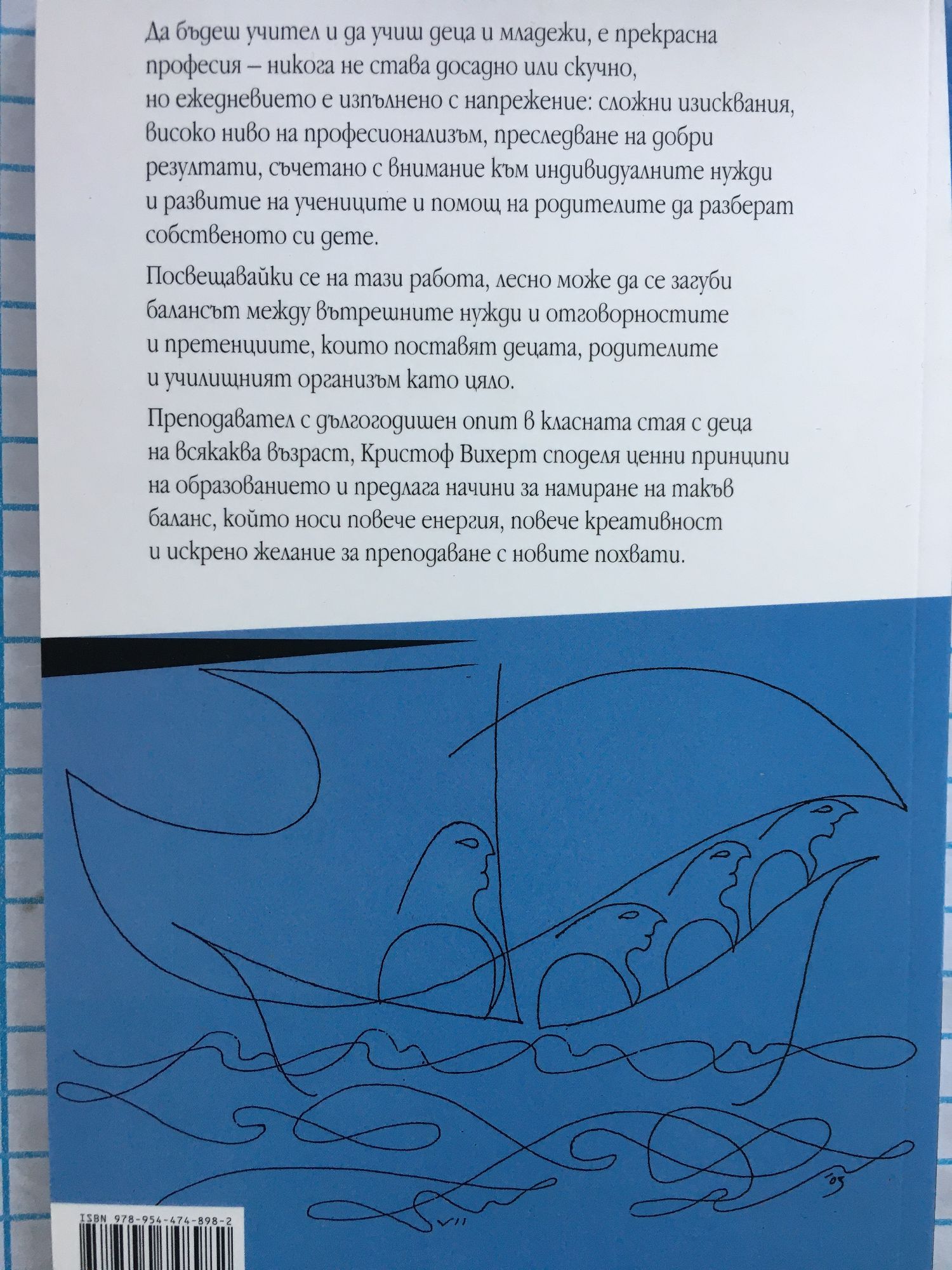 В тази книга валдорфският метод е представен като „педагогика на отворените врати“: без поучения и принуди, с основен акцент върху външните и вътрешните страни на училищния живот. Наблюденията на Вихерт приличат на познавателно пътешествие. Авторът ни превежда през многобройни педагогически и социални ситуации, през класни стаи, родителски срещи, обсъждане на ученици и други проблеми на училищната общност. Книгата изобилства на идеи за самоанализ и нови перспективи. Стилът отговаря на съдържанието. Изкуството на възпитанието не само се обсъжда, но и практикува. В края на пътешествието учителят ще се почувства окрилен, обогатен и готов да използва новаторски похвати в работата си. Да бъдеш учител и да учиш деца и младежи, е прекрасна професия – никога не става досадно или скучно, но ежедневието е изпълнено с напрежение: сложни изисквания, високо ниво на професионализъм, преследване на добри резултати, съчетано с внимание към индивидуалните нужди и развитие на учениците и помощ на родителите да разберат собственото си дете. Посвещавайки се на тази работа, лесно може да се загуби балансът между вътрешните нужди и отговорностите и претенциите, които поставят децата, родителите и училищният организъм като цяло. Преподавател с дългогодишен опит в класната стая с деца на всякаква възраст, Кристоф Вихерт споделя ценни принципи на образованието и предлага начини за намиране на такъв баланс, който носи повече енергия, повече креативност и искрено желание за преподаване с новите похвати. Кристоф Вихерт е роден през 1945 г. Възпитаник на Валдорфското училище в Хага, Нидерландия. Завършва педагогика и география, след което в продължение на 30 години преподава в училището, в което е учил. През този период става съосновател на Държавния валдорфски учителски семинар в Нидерландия. Дълги години е председател на Антропософското общество в страната. От 1999 год. е член на ръководството на Педагогическата секция при Гьотеанума в Дорках,