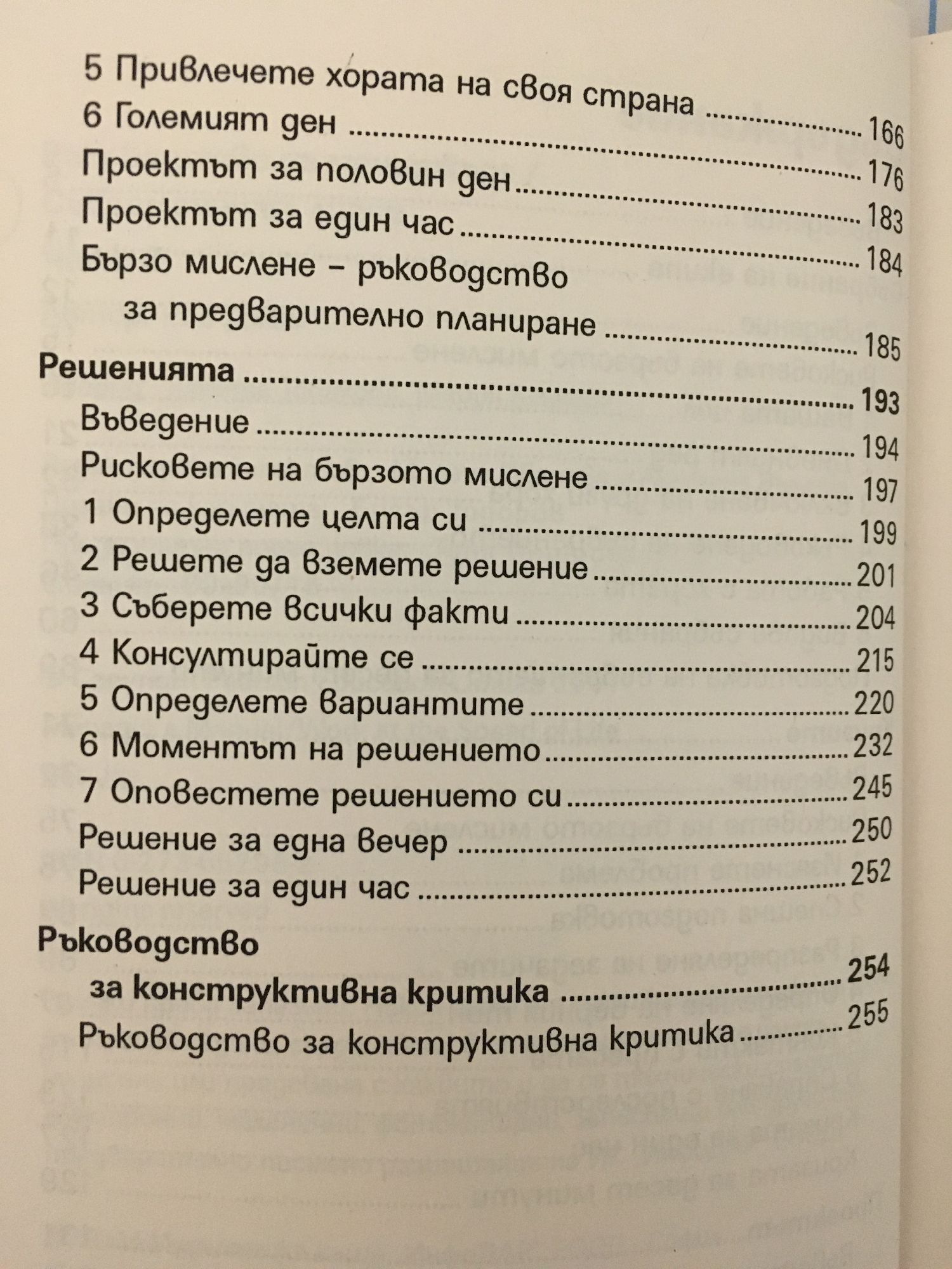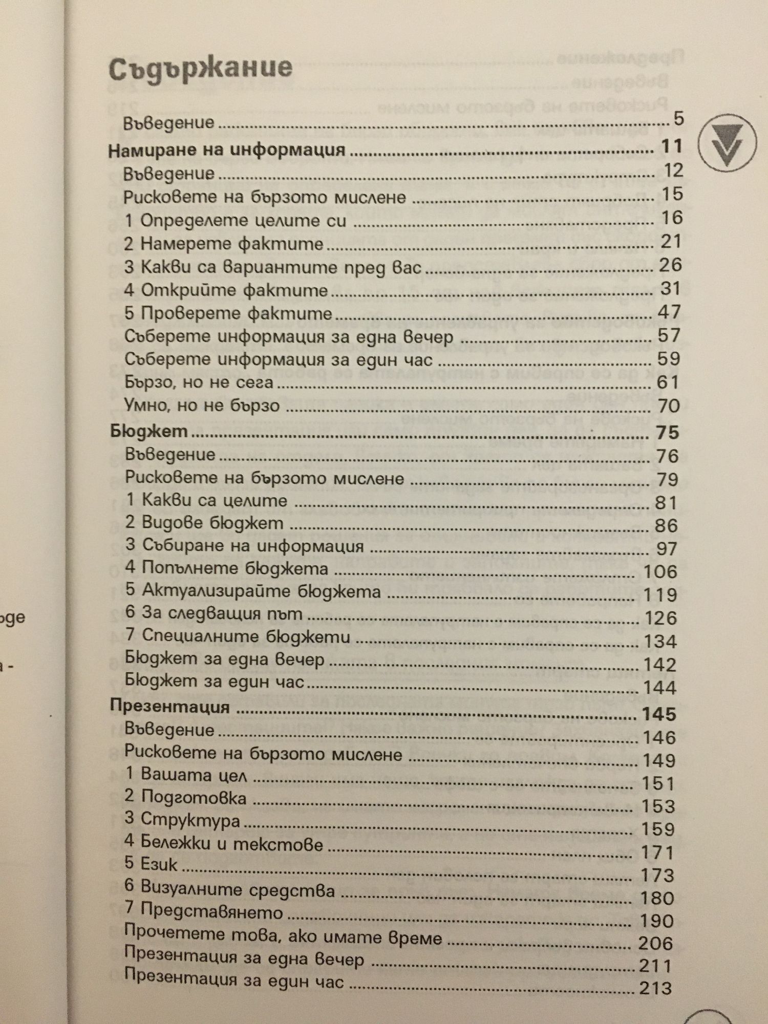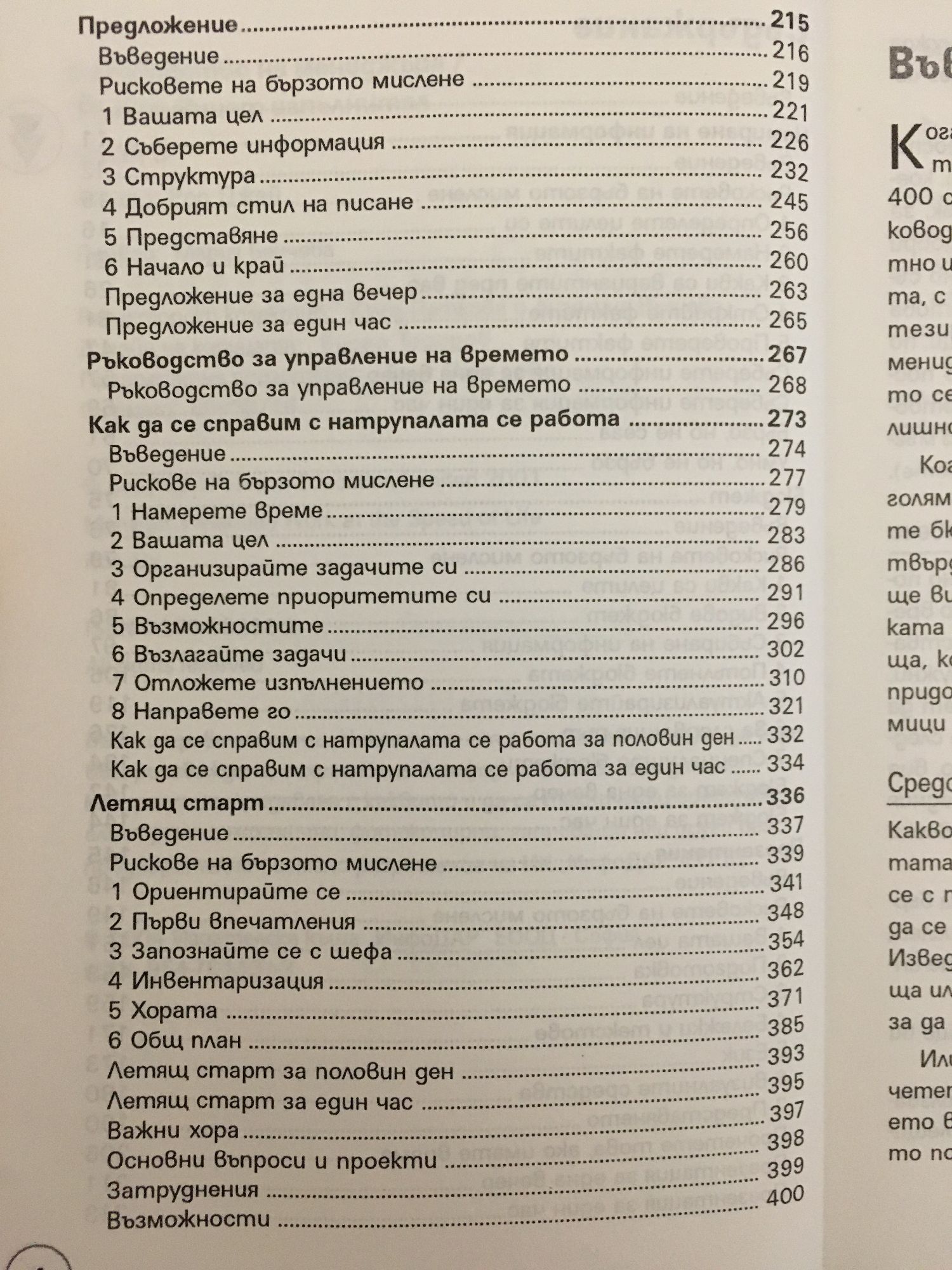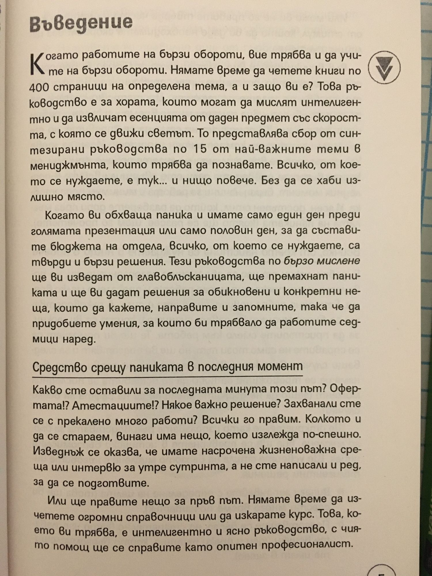 Когато работите на бързи обороти, вие трябва и да учите на бързи обороти. Нямате време да четете книги по 400 страници на определена тема, а и защо ви е? Това ръководство е за хората, които могат да мислят интелигентно и да извличат есенцията от даден предмет със скоростта, с която се движи светът. То представлява сбор от синтезирани ръководства по 15 от най-важните теми в мениджмънта, които трябва да познавате. Всичко, от което се нуждаете, е тук... и нищо повече. Без да се хаби излишно място. Когато ви обхваща паника и имате само един ден преди голямата презентация или само половин ден, за да съставите бюджета на отдела, всичко, от което се нуждаете, са твърди и бързи решения. Тези ръководства по бързо мислене ще ви изведат от главоблъсканицата, ще премахнат паниката и ще ви дадат решения за обикновени и конкретни неща, които да кажете, направите и запомните, така че да придобиете умения, за които би трябвало да работите седмици наред. СРЕДСТВО СРЕЩУ ПАНИКАТА В ПОСЛЕДНИЯ МОМЕНТ Какво сте оставили за последната минута този път? Офертата!? Атестациите!? Някое важно решение? Захванали сте се с прекалено много работи? Всички го правим, колкото и да се стараем, винаги има нещо, което изглежда по-спешно. Изведнъж се оказва, че имате насрочена жизненоважна среща или интервю за утре сутринта, а не сте написали и ред, за да се подготвите. Или ще правите нещо за пръв път. Нямате време да изчетете огромни справочници или да изкарате курс. Това, което ви трябва, е интелигентно и ясно ръководство, с чиято помощ ще се справите като опитен професионалист.
