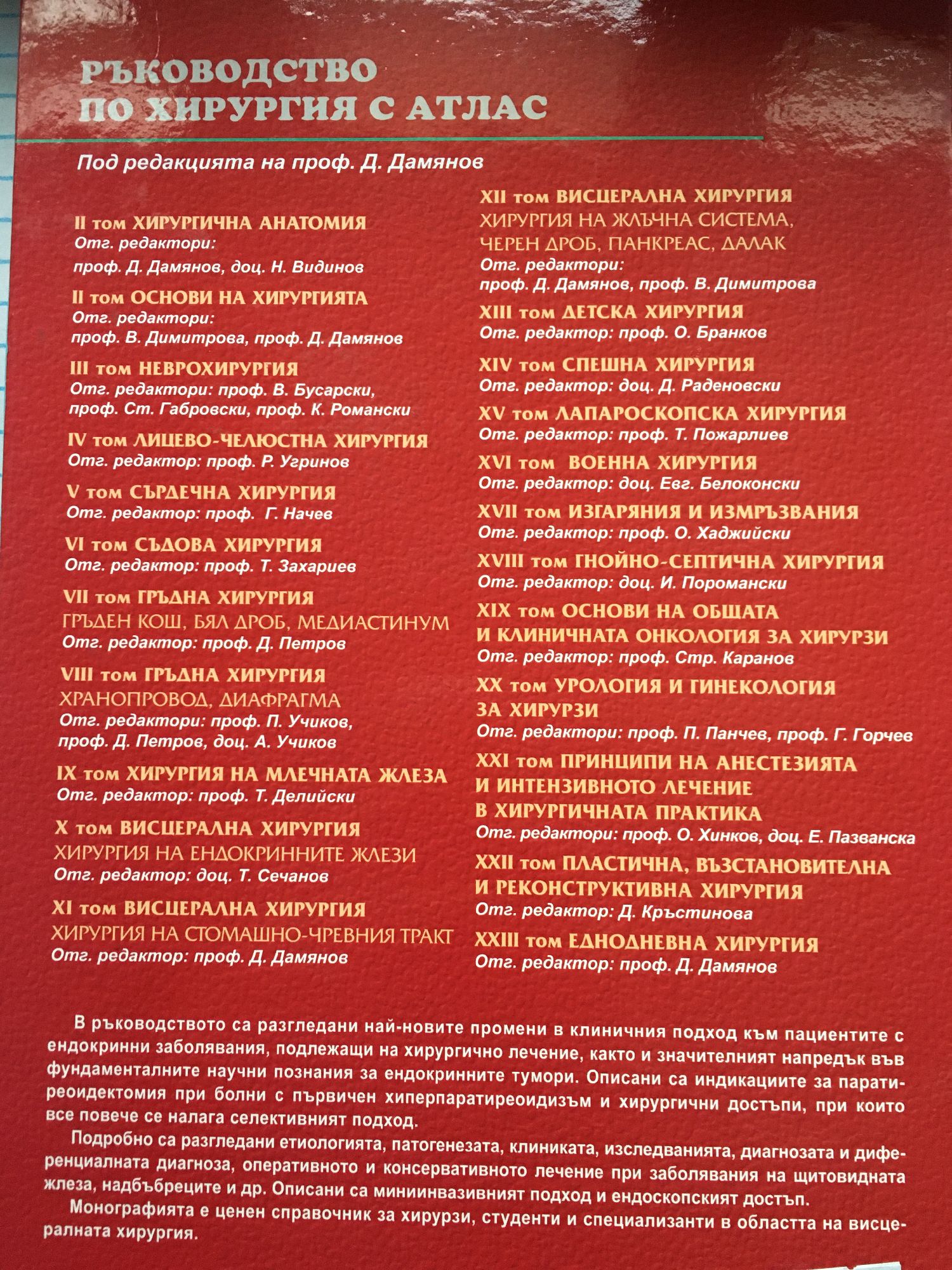 В ръководството са разгледани най-новите промени в клиничния подход към пациентите с ендокринни заболявания, подлежащи на хирургично лечение, както и значителният напредък във фундаменталните научни познания за ендокринните тумори. Описани са индикациите за паратиреоидектомия при болни с първичен хиперпаратиреоидизъм и хирургични достъпи, при които все повече се налага селективният подход. Подробно са разгледани етиологията, патогенезата, клиниката, изследванията, диагнозата и диференциалната диагноза, оперативното и консервативното лечение при заболявания на щитовидната жлеза, надбъбреците и др. Описани са миниинвазивният подход и ендоскопският достъп. Монографията е ценен справочник за хирурзи, студенти и специализанти в областта на висцералната хирургия.