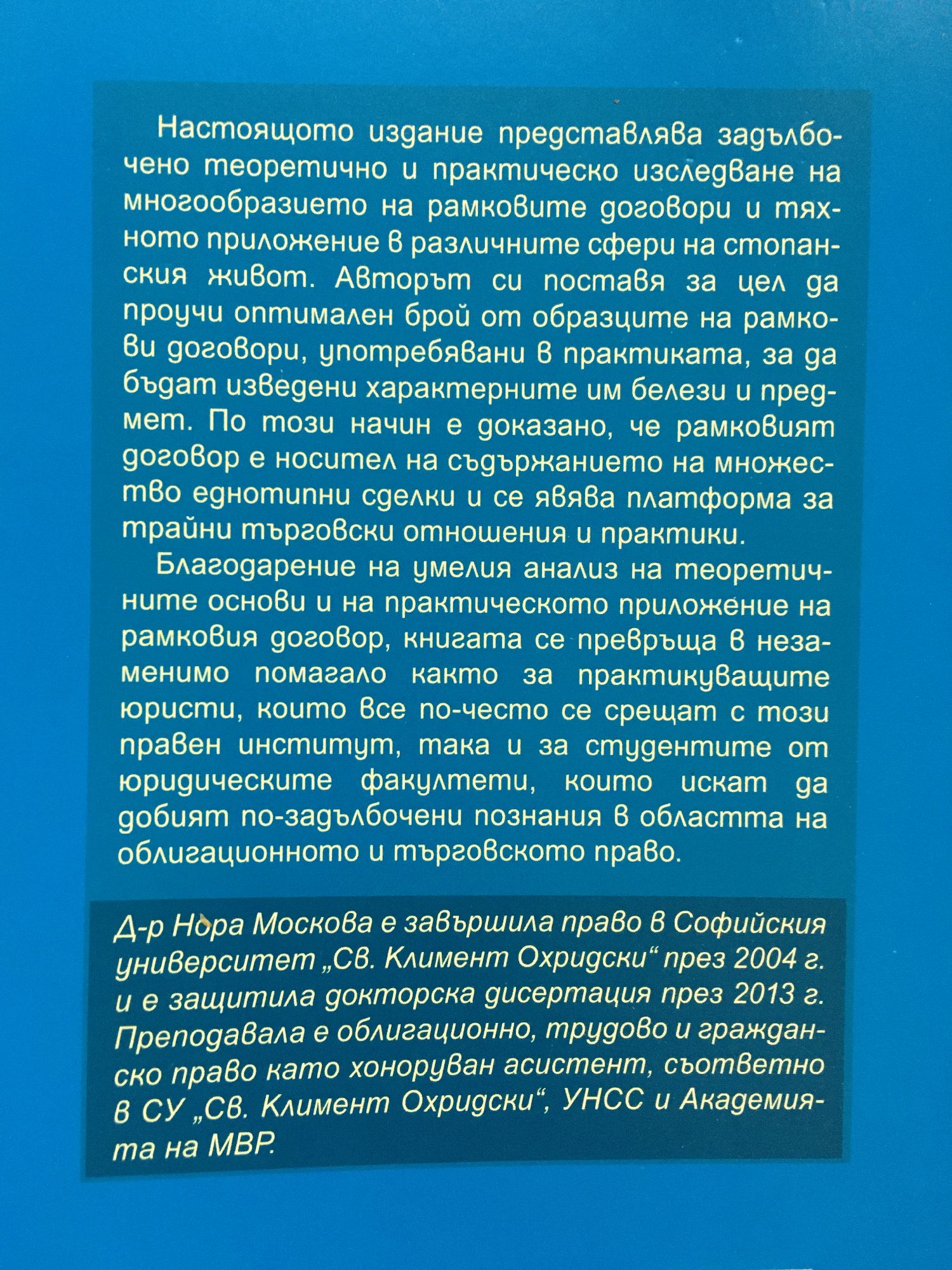 Настоящото издание представлява задълбочено теоретично и практическо изследване на многообразието на рамковите договори и тяхното приложение в различните сфери на стопанския живот. Авторът си поставя за цел да проучи оптимален брой от образците на рамкови договори, употребявани в практиката, за да бъдат изведени характерните им белези и предмет. По този начин е доказано, че рамковият договор е носител на съдържанието на множество еднотипни сделки и се явява платформа за трайни търговски отношения и практики. Благодарение на умелия анализ на теоретичните основи и на практическото приложение на рамковия договор, книгата се превръща в незаменимо помагало както за практикуващите юристи, които все по-често се срещат с този правен институт, така и за студентите от юридическите факултети, които искат да добият по-задълбочени познания в областта на облигационното и търговското право.