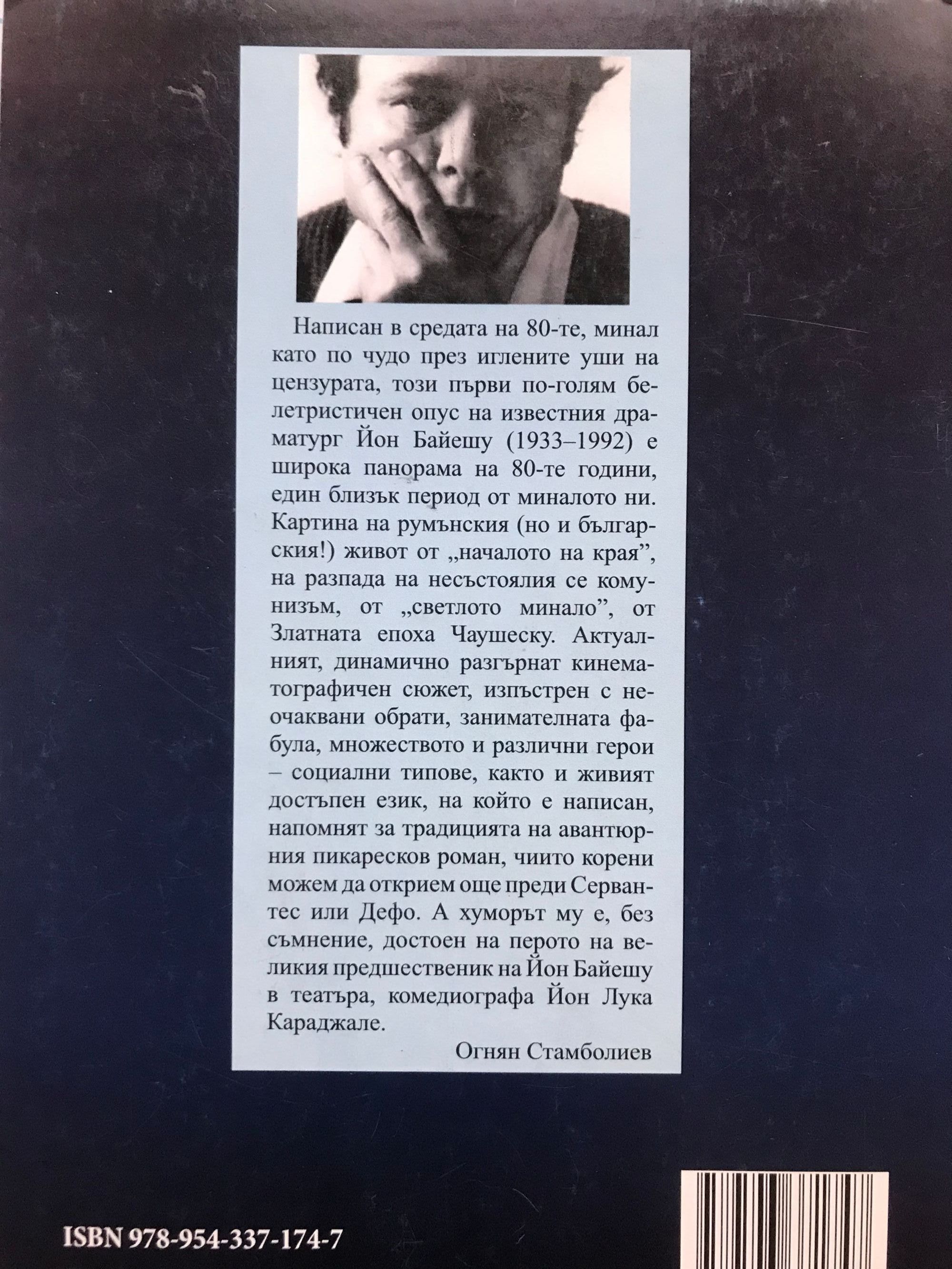 Написан в средата на 80-те, минал като по чудо през иглените уши на цензурата, този първи по-голям белетристичен опус на известния драматург Йон Байешу /1933-1992/ е широка панорама на 80-те години, един близък период от миналото ни. Картина на румънския /но и на българския!/ живот от "началото на края", на разпада на несъстоялия се комунизъм, от "светлото минало", от Златната епоха на Чаушеску. Актуалният, динамично разгърнат кинематографичен сюжет, изпъстрен с неочаквани обрати, занимателната фабула, множеството и различни герои - социални типовее, както и живият достъпен език, на който е написан, напомнят за традицията на авантюрния пикаресков роман, чиито корени можем да открием още преди Сервантес или Дефо. А хуморът му е, без съмнение, достоен на перото на великия предшественик на Йон Байешу в театъра, комедиографан Йон Лука Караджале.