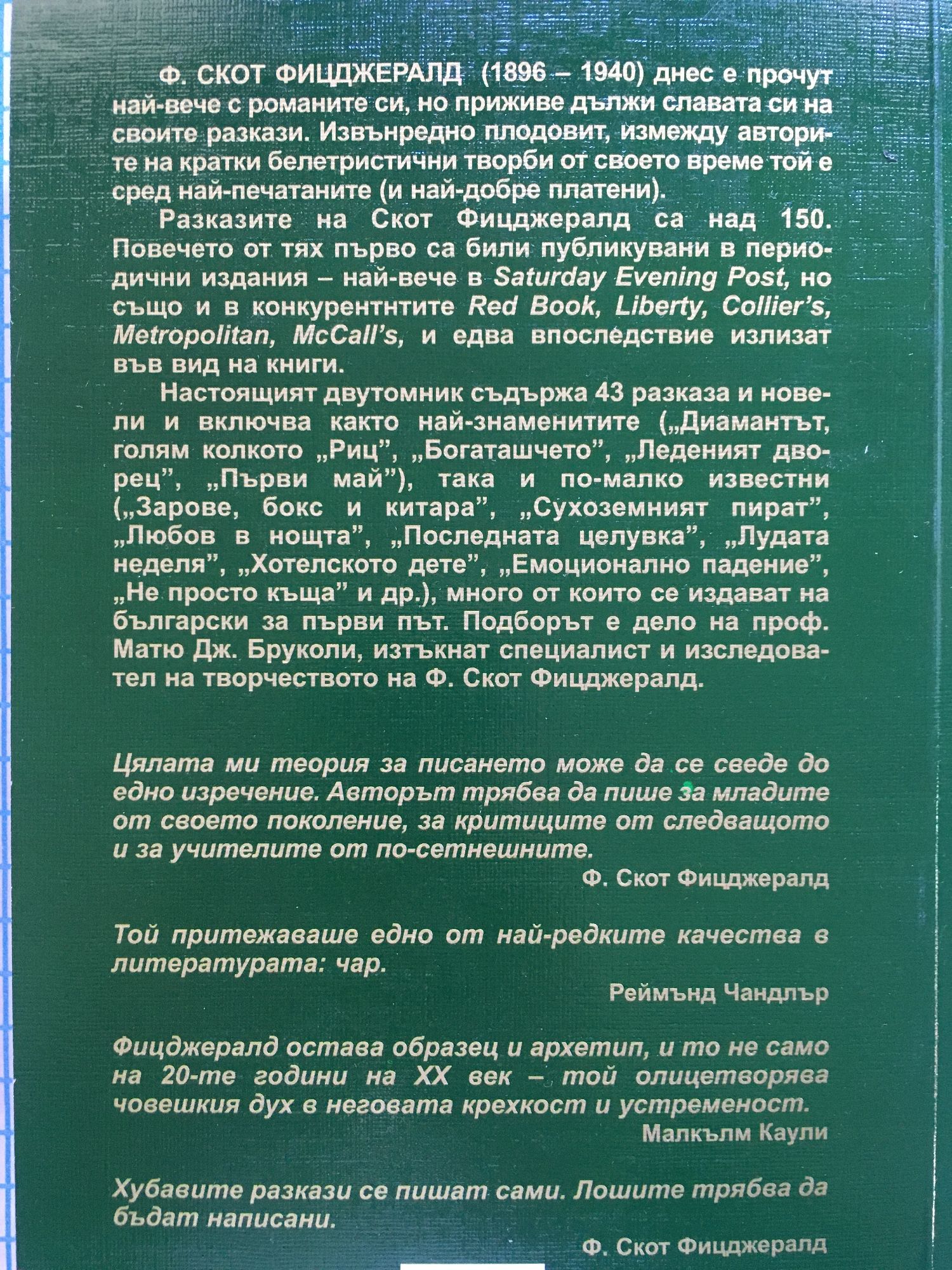 Ф. СКОТ ФИЦДЖЕРАЛД (1896 – 1940) днес е прочут най-вече с романите си, но приживе дължи славата си на своите разкази. Извънредно плодовит, сред авторите на кратки белетристични творби от своето време той е сред най-печатаните (и най-добре платени). Разказите на Скот Фицджералд са над 150. Повечето от тях първо са били публикувани в периодични издания – най-вече в Saturday Evening Post, но също и в конкурентнтите Red Book, Liberty, Collier’s, Metropolitan, McCall’s, и едва впоследствие излизат във вид на книги. Настоящият двутомник съдържа 43 разказа и новели и включва както най-знаменитите („Диамантът, голям колкото „Риц”, „Богаташчето”, „Леденият дворец”, „Първи май”), така и по-малко известни („Зарове, бокс и китара”, „Сухоземният пират”, „Любов в нощта”, „Последната целувка”, „Лудата неделя”, „Два гряха”, „Не просто къща” и др.), много от които се издават на български за първи път. Подборът е дело на проф. Матю Дж. Бруколи, изтъкнат специалист и изследовател на творчеството на Ф. Скот Фицджералд. Цялата ми теория за писането може да се сведе до едно изречение. Авторът трябва да пише за младите от своето поколение, за критиците от следващото и за учителите от по-сетнешните.