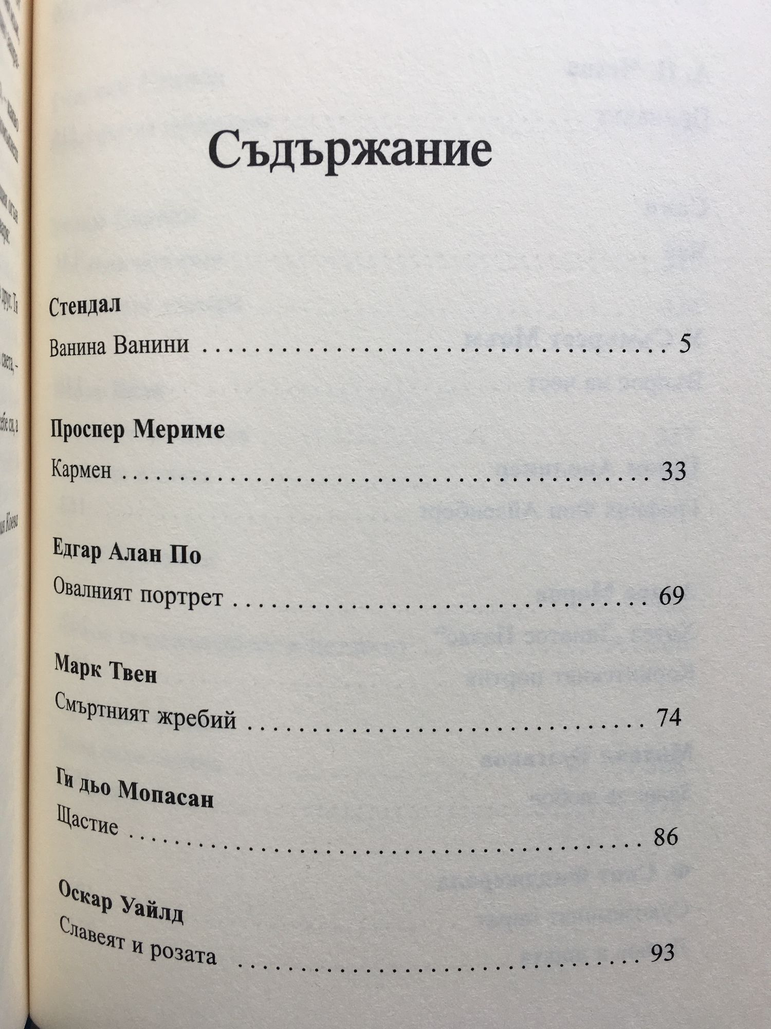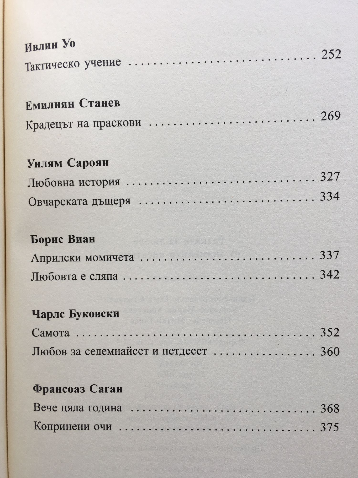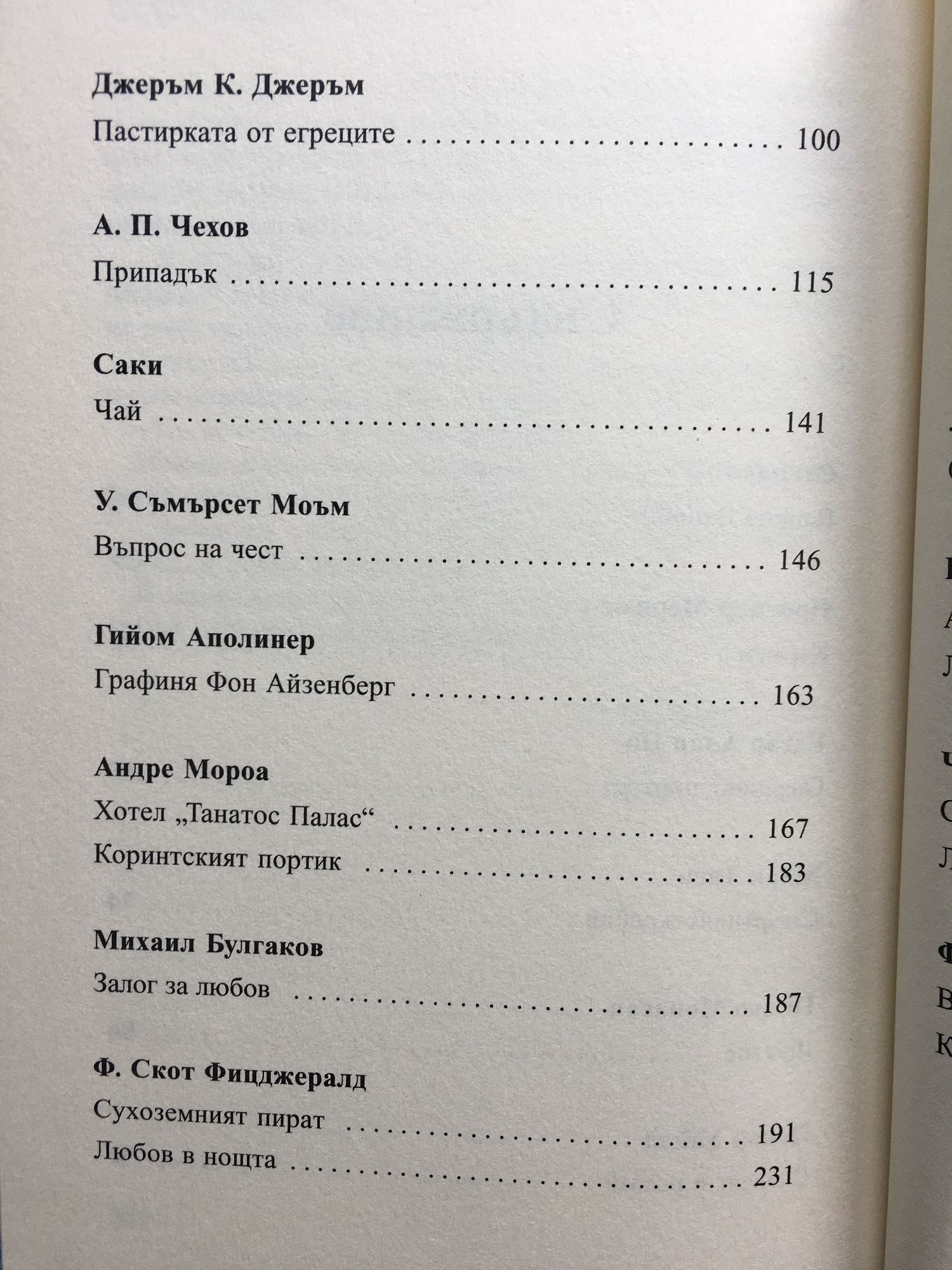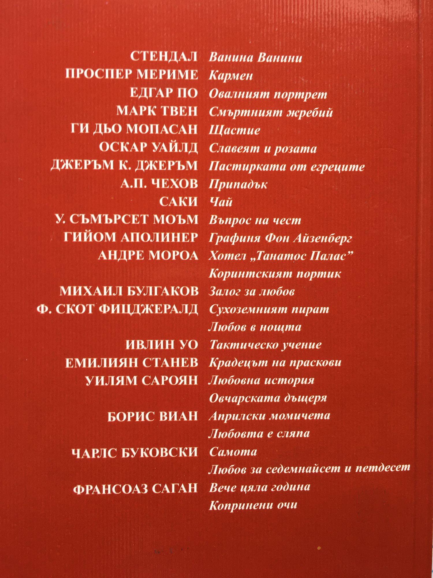 СТЕНДАЛ - Ванина Ванини ПРОСПЕР МЕРИМЕ - Кармен ЕДГАР ПО - Овалният портрет МАРК ТВЕН - Смъртният жребий ГИ ДЬО МОПАСАН - Щастие ОСКАР УАЙЛД - Славеят и розата ДЖЕРЪМ К. ДЖЕРЪМ - Пастирката от егреците А.П. ЧЕХОВ - Припадък САКИ - Чай У. СЪМЪРСЕТ МОЪМ - Въпрос на чест ГИЙОМ АПОЛИНЕР - Графиня Фон Айзенберг АНДРЕ МОРОА - Хотел „Танатос Палас”; Коринтският портик МИХАИЛ БУЛГАКОВ - Залог за любов Ф. СКОТ ФИЦДЖЕРАЛД - Сухоземният пират; Любов в нощта ИВЛИН УО - Тактическо учение ЕМИЛИЯН СТАНЕВ - Крадецът на праскови УИЛЯМ САРОЯН - Любовна история; Овчарската дъщеря БОРИС ВИАН - Априлски момичета; Любовта е сляпа ЧАРЛС БУКОВСКИ - Самота; Любов за седемнайсет и петдесет ФРАНСОАЗ САГАН - Вече цяла година; Копринени очи