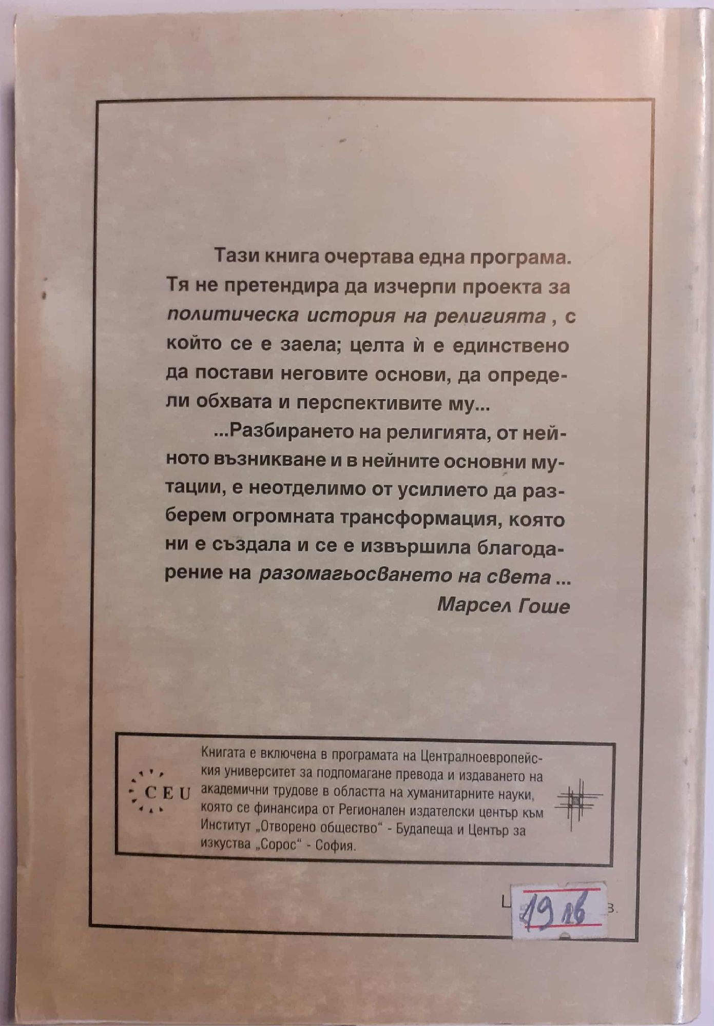 Тази книга очертава една програма. Тя не претендира да изчерпи проекта за политическа история на религията, с който се е заела; целта й е единствено да постави неговите основи, да определи обхвата и перспективите му.