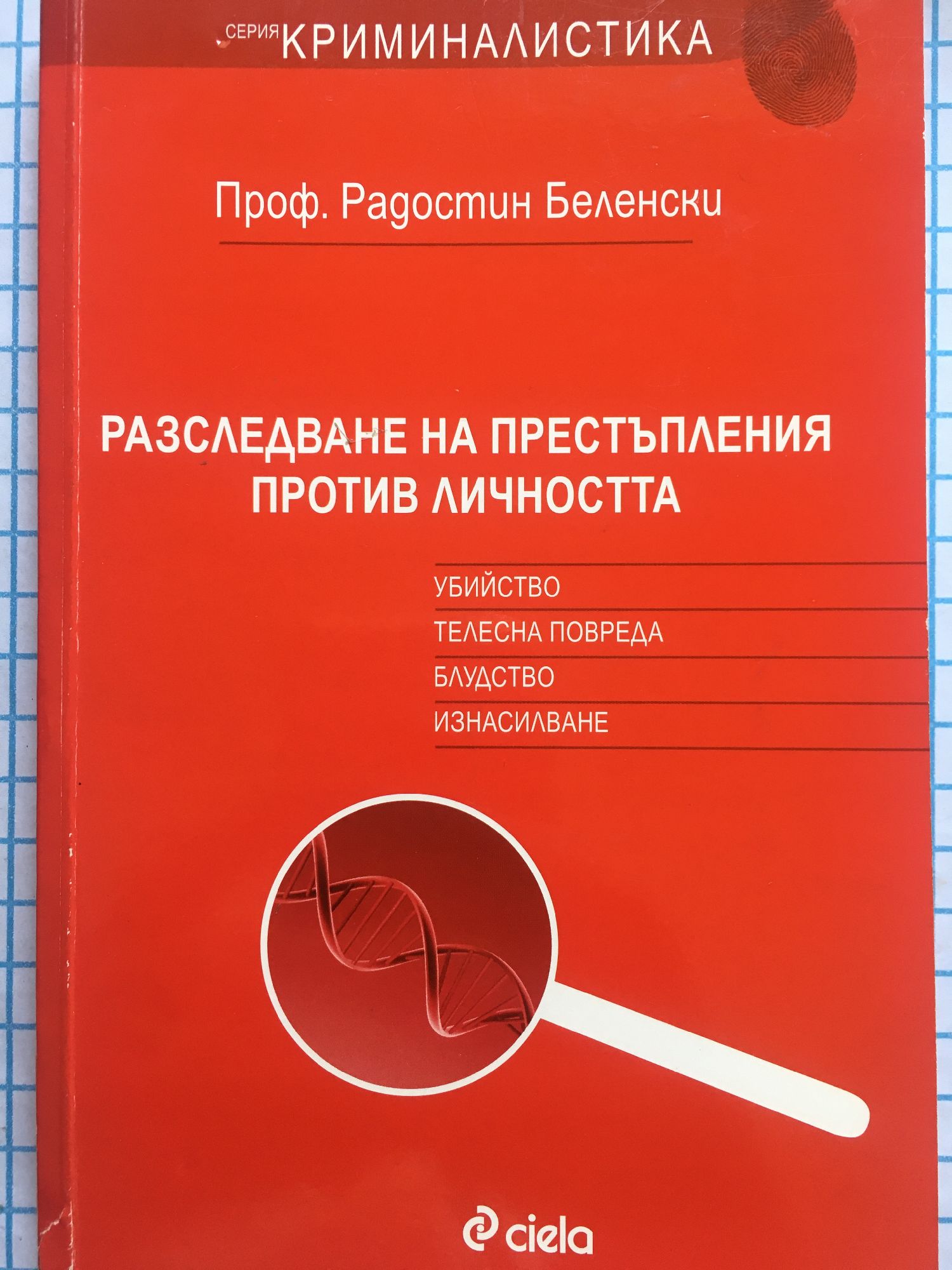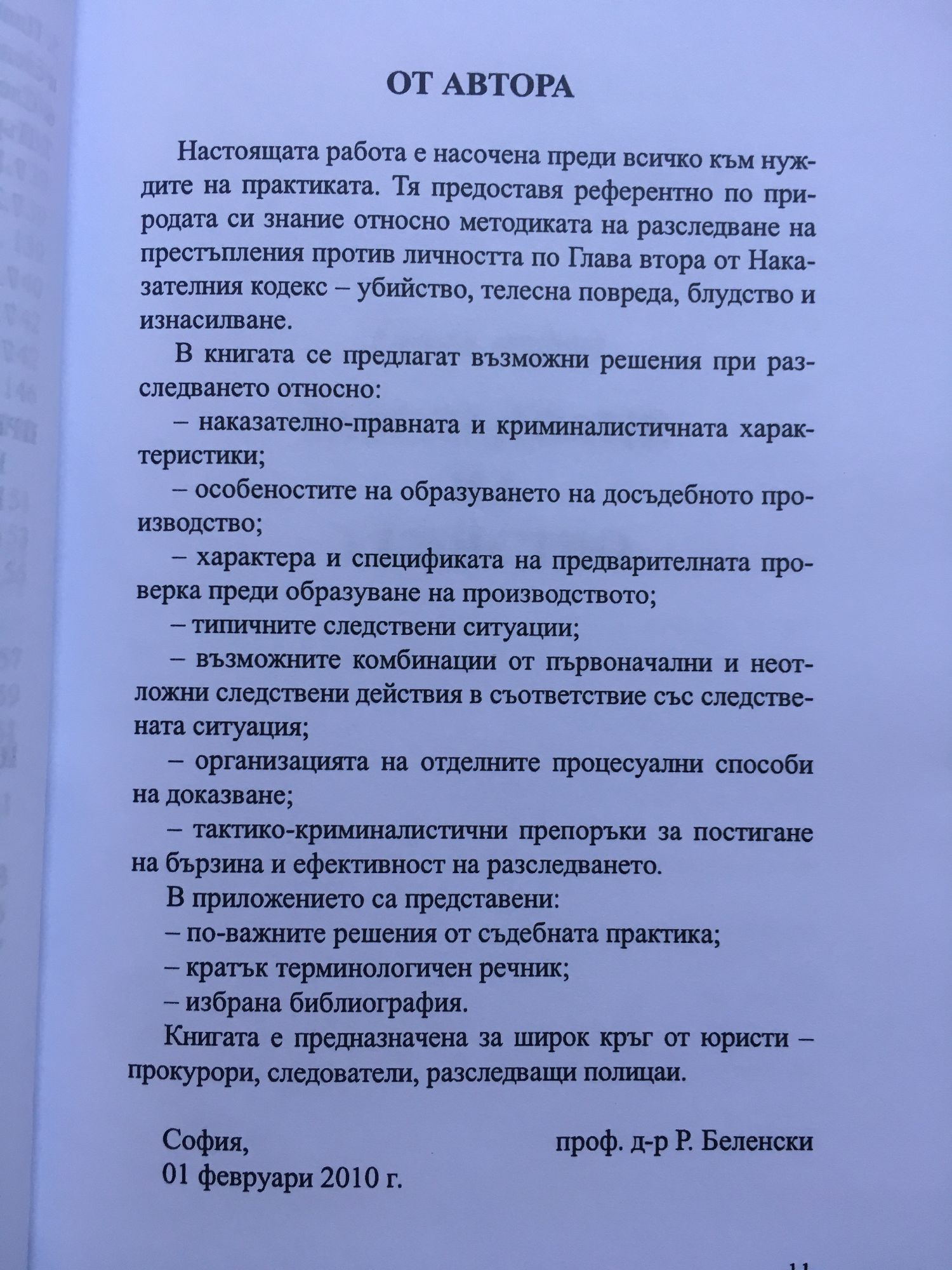 Настоящата работа е насочена преди всичко към нуждите на практиката. Тя предоставя референтно по природата си знание относно методиката на разследване на престъпления против личността по Глава втора от Наказателния кодекс - убийство, телесна повреда, блудство и изнасилване. В книгата се предлагат възможни решения при разследването относно: - наказателно-правната и криминалистичната характеристики; - особеностите на образуването на досъдебно производство; - характера и спецификата на предварителната проверка преди образуване на производство; - характера и спецификата на предварителната проверка преди образуване на производството; - типичните следствени ситуации; - възможните комбинации от първоначални и неотложни следствени действия в съответствие със следствената ситуация; - организацията на отделните процесуални способи на доказване; - тактико-криминалистични препоръки за постигане на бързина ефективност на разследването. В приложението са представени: - по-важните решения от съдебната практика - кратък терминологичен речник - избрана библиография. Книгата е предназначена за широк кръг от юристи - прокурори, следователи, разследващи полицаи. проф. д-р Р. Беленски